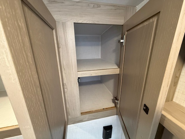 Inside, enjoy upscale touches like solid surface countertops, solid wood cabinet doors, and night roller shades. The AIR 360+ WiFi-ready antenna helps you stay connected when needed, and the power tongue jack ensures quick, effortless setup at every stop.