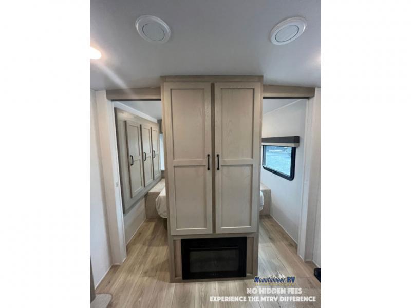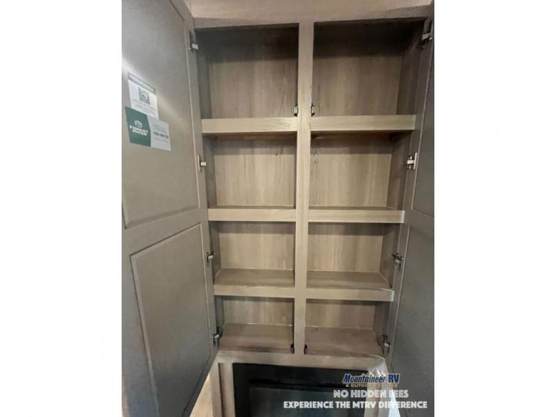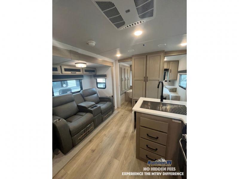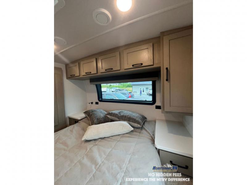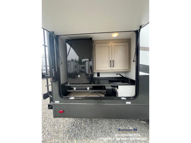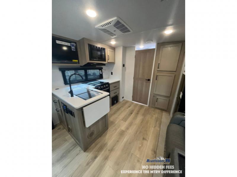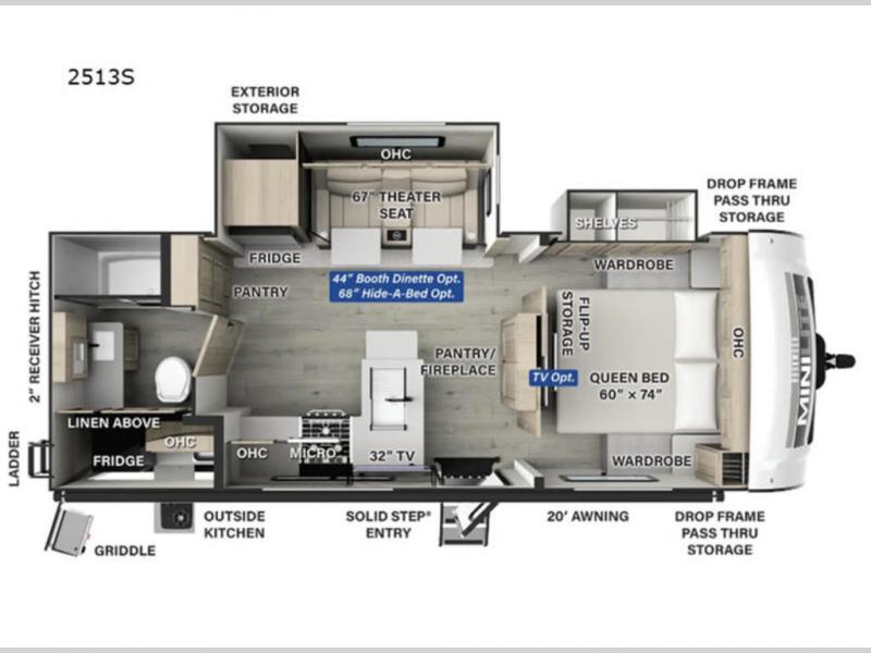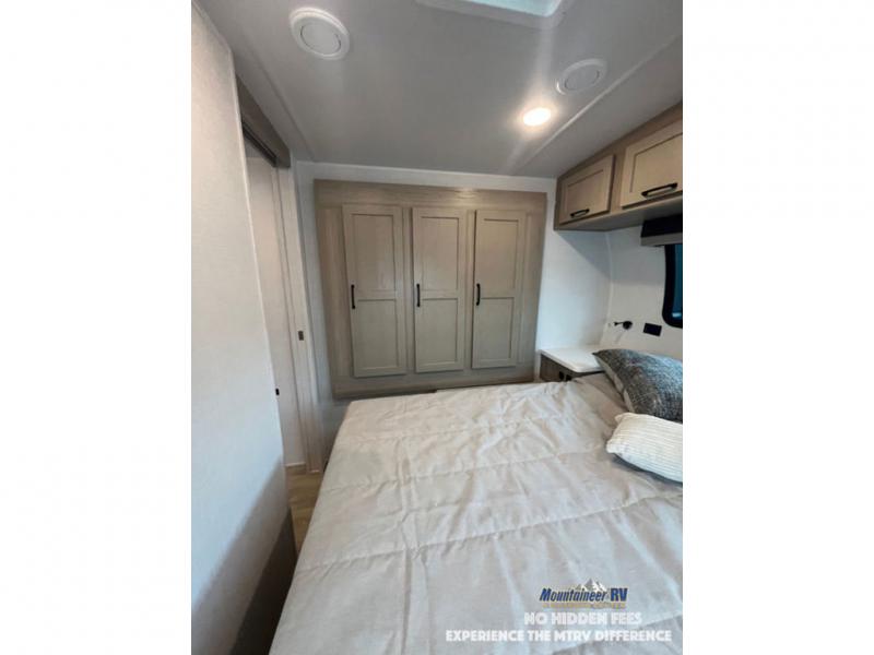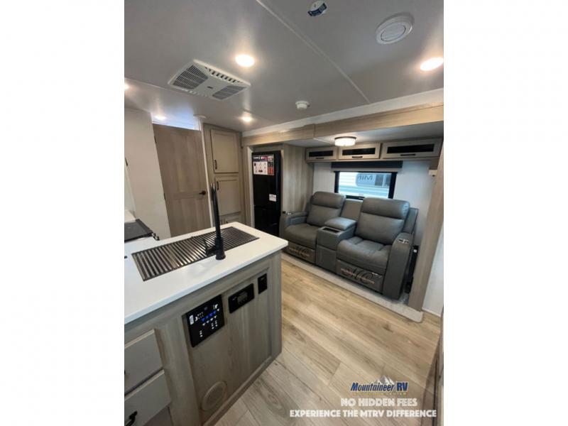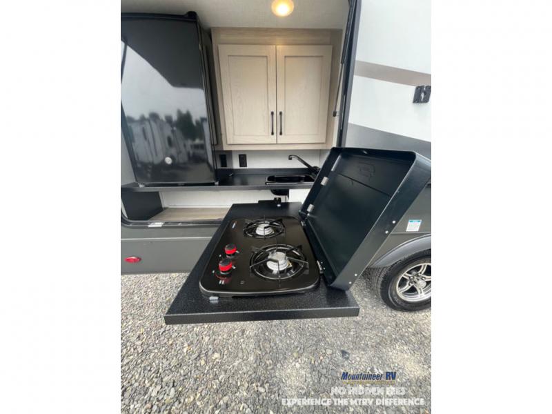 This is the perfect travel trailer for two people looking for comfortable camping trips! You will have your own RV queen bed to sleep on in the front private bedroom, and an optional TV can be added if you enjoy the morning news in bed. Breakfast can be made on the three burner cooktop, or head outdoors to cook on the outside kitchen. The theater seating with a table will provide a place to relax and dine together, and the spacious full rear bath will allow you to clean up before you head out for the day. This model includes plenty of storage space, including two pantries, a wardrobe slide out in the bedroom, plus a drop-frame pass-through storage for larger camp gear!