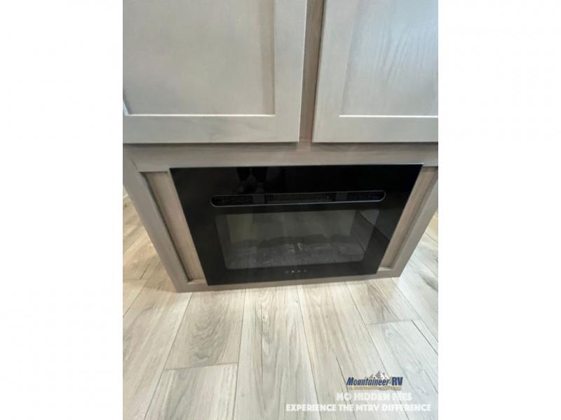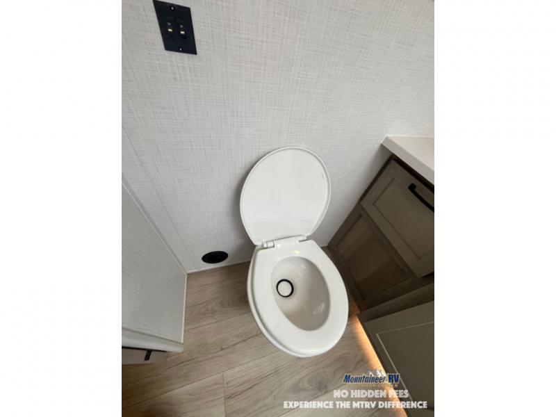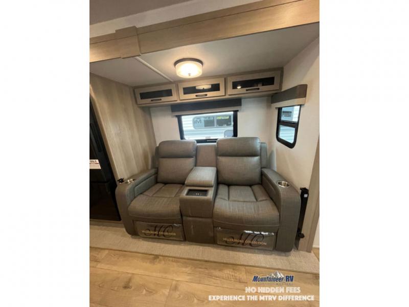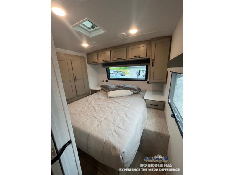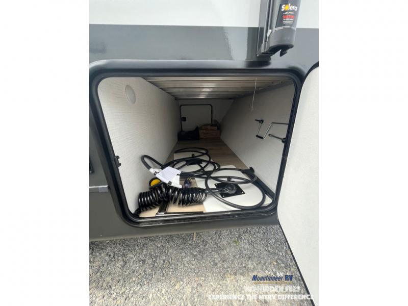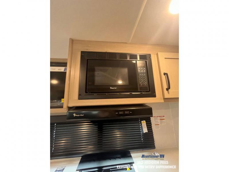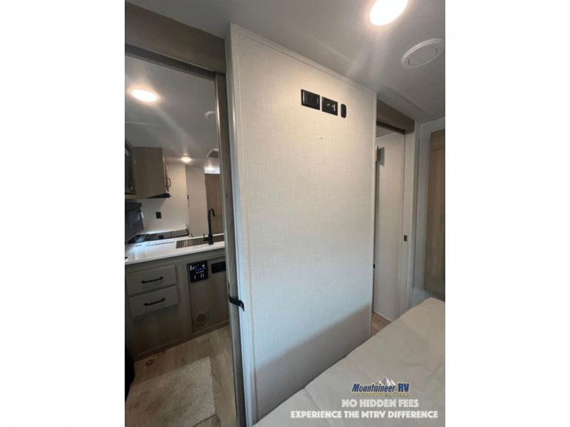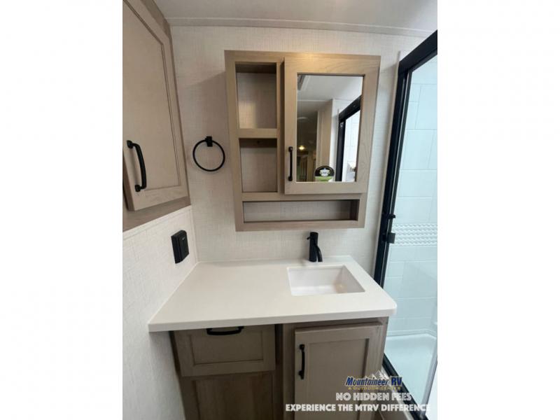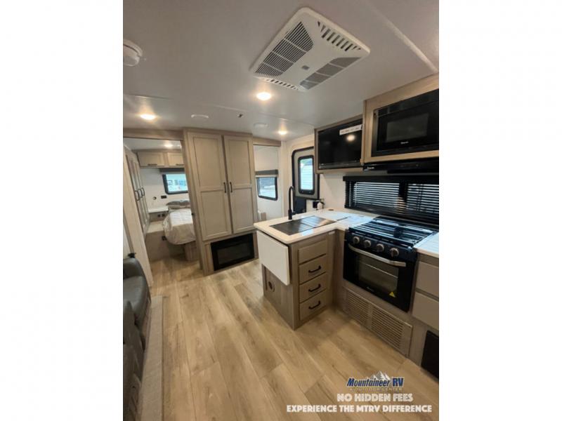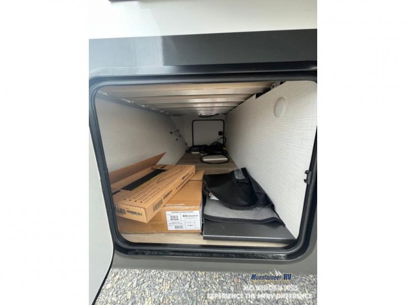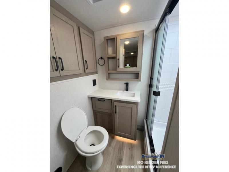 This is the perfect travel trailer for two people looking for comfortable camping trips! You will have your own RV queen bed to sleep on in the front private bedroom, and an optional TV can be added if you enjoy the morning news in bed. Breakfast can be made on the three burner cooktop, or head outdoors to cook on the outside kitchen. The theater seating with a table will provide a place to relax and dine together, and the spacious full rear bath will allow you to clean up before you head out for the day. This model includes plenty of storage space, including two pantries, a wardrobe slide out in the bedroom, plus a drop-frame pass-through storage for larger camp gear!