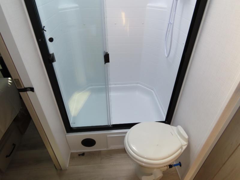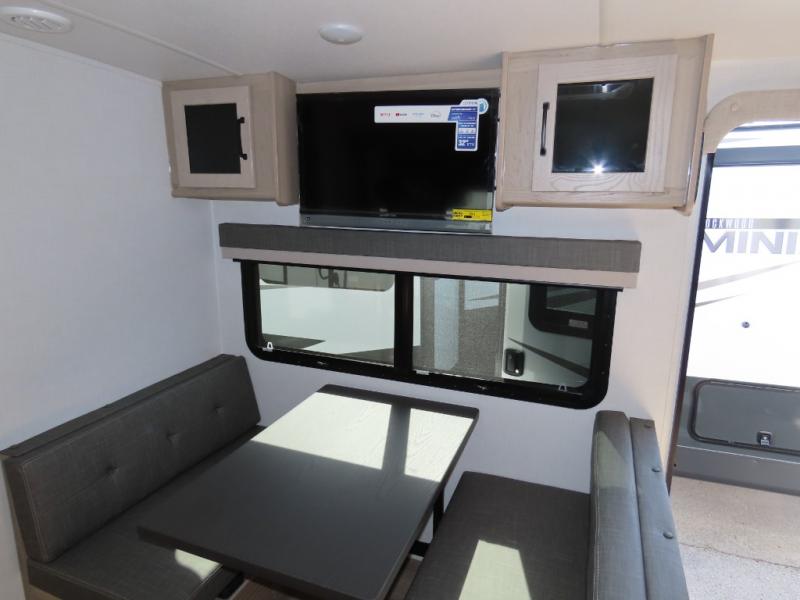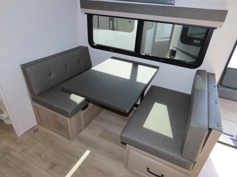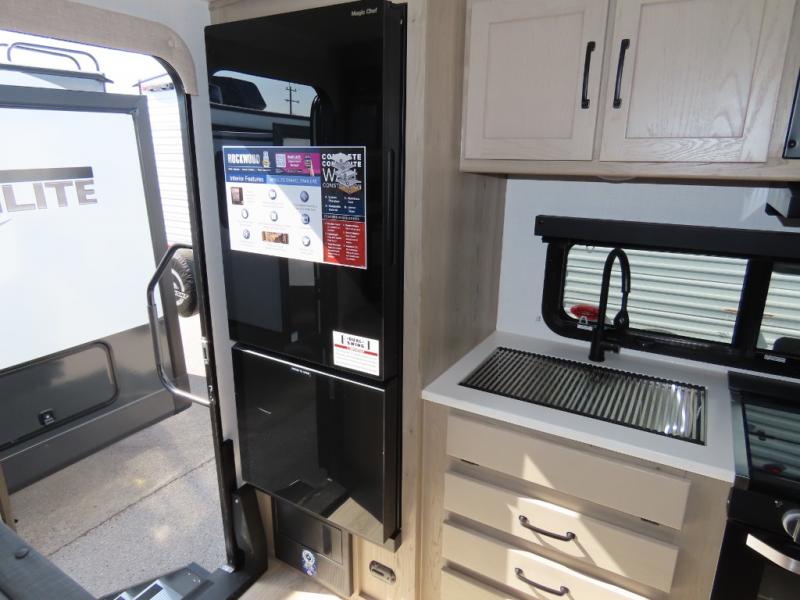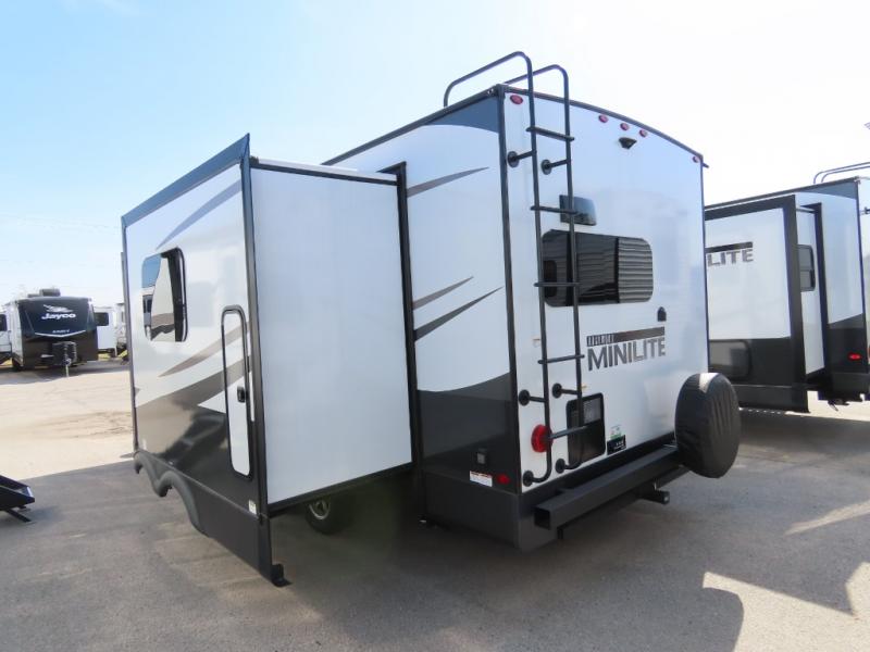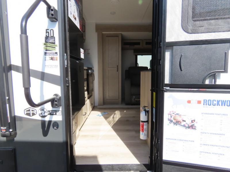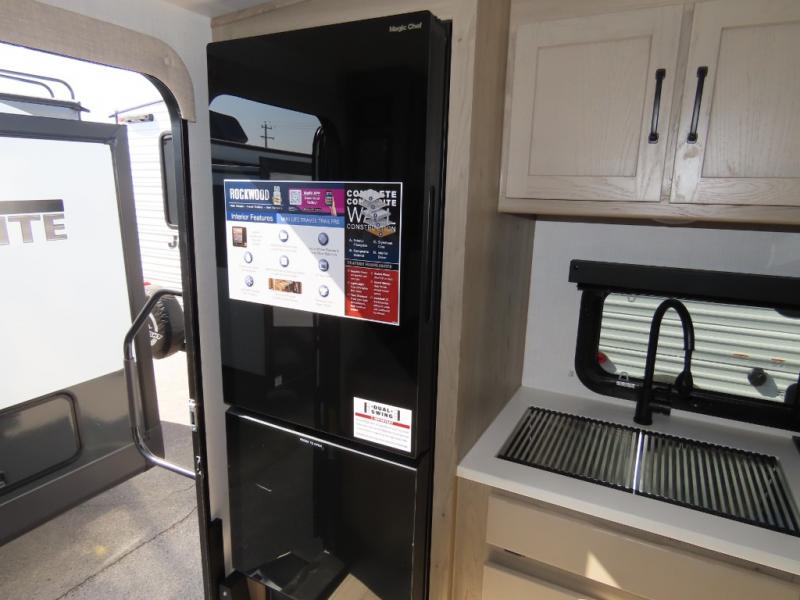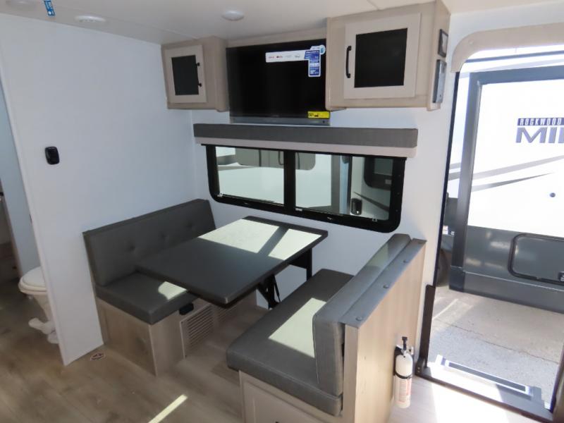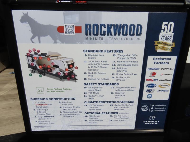Each Rockwood Mini Lite travel trailer by Forest River is constructed with a fully laminated one-piece walkable roof, sleek frameless windows, and a six-sided full aluminum frame for strength and durability. The 12V thermostatically controlled heated tanks, plus radiant foil in the underbelly and slide out floors will allow you to camp well into the colder months, and the 200W roof solar panel will be perfect for a little off-gridding. Each model includes solid surface kitchen countertops, solid wood cabinet doors, night roller shades, plus many more interior features. Having an AIR 360+ omnidirectional antenna with WiFi prep on board gives you the option to get some work done if it's needed, and the power tongue jack provides hassle-free set up, so you can enjoy more time relaxing!