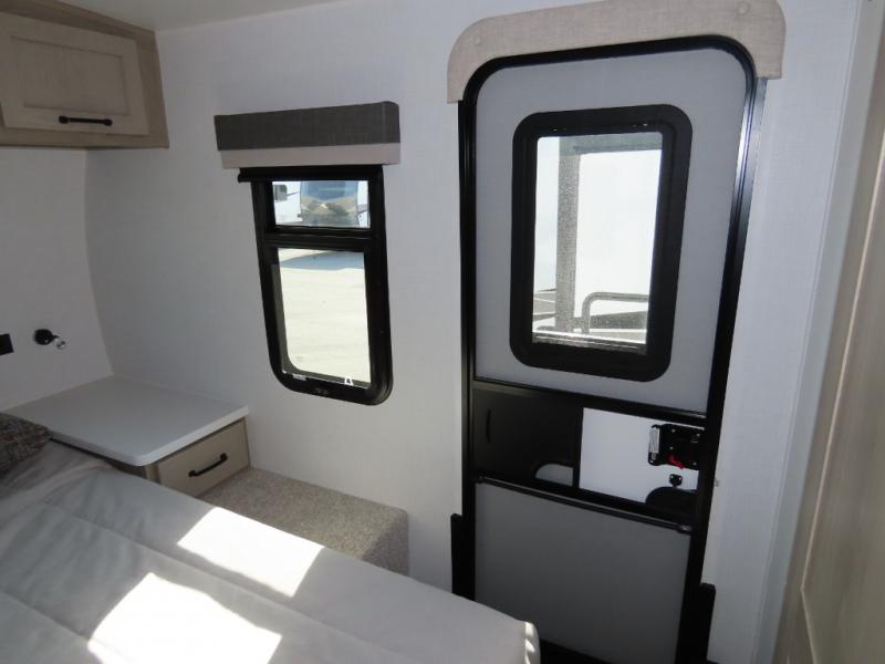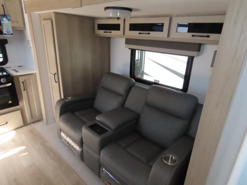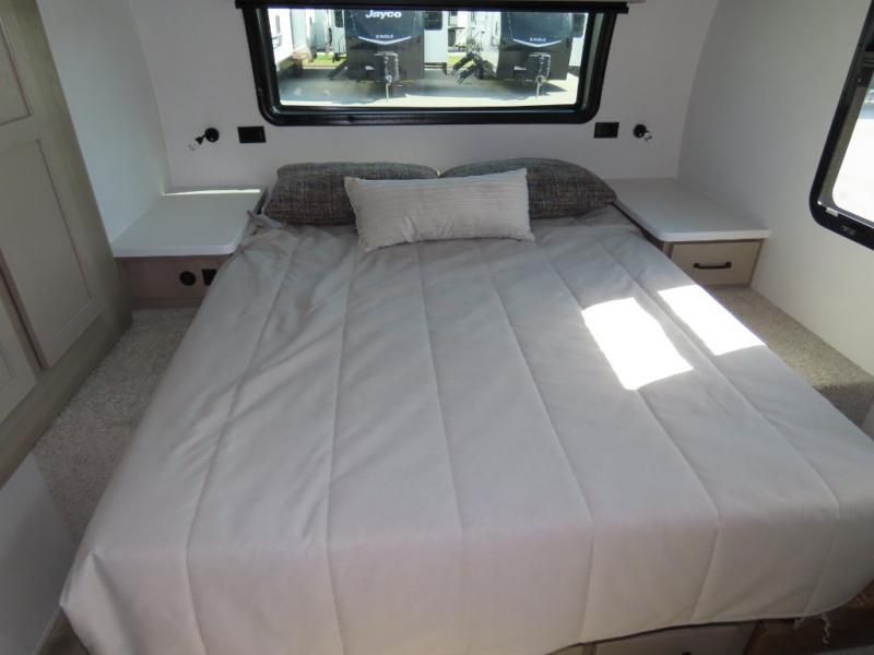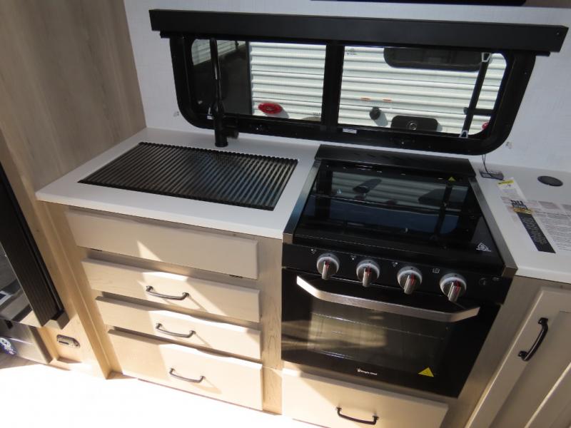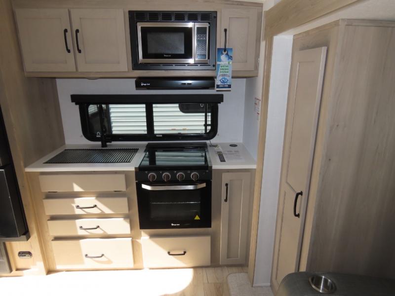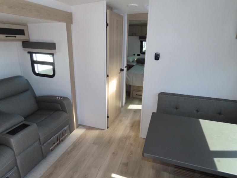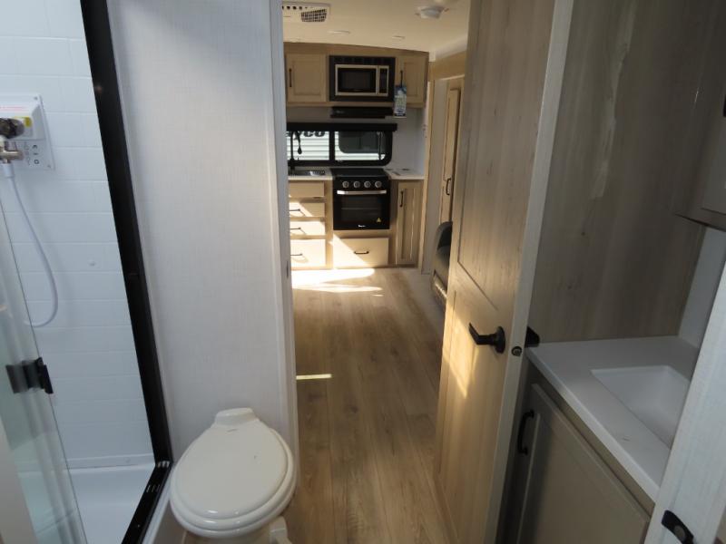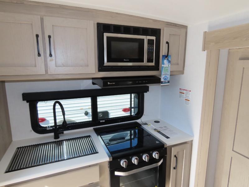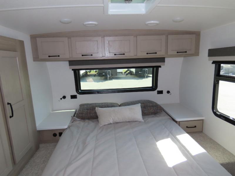 You and your spouse will have a great time camping in this travel trailer! You will have your own RV queen bed to sleep on in the front private bedroom, and an optional TV can be added if you enjoy the morning news in bed. Breakfast can be made on the three burner cooktop in the rear kitchen, or head outdoors to cook on the outside griddle. The 67" theater seating with cupholders will provide a place to relax and dine together, and the spacious walk-through bath will allow you to clean up before you head out for the day. This model includes plenty of storage space, including a pantry for your snacks, a wardrobe slide out in the bedroom, plus a drop-frame pass-through storage for larger camp gear!