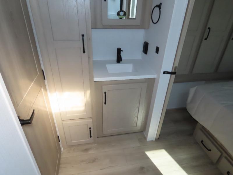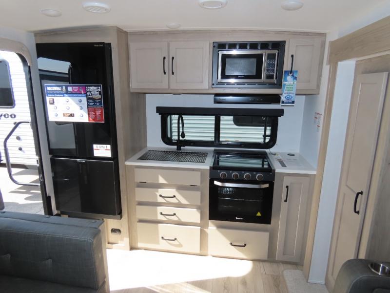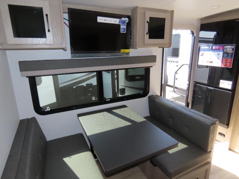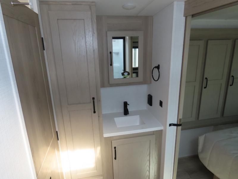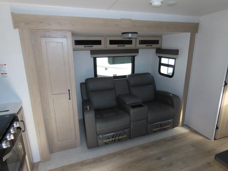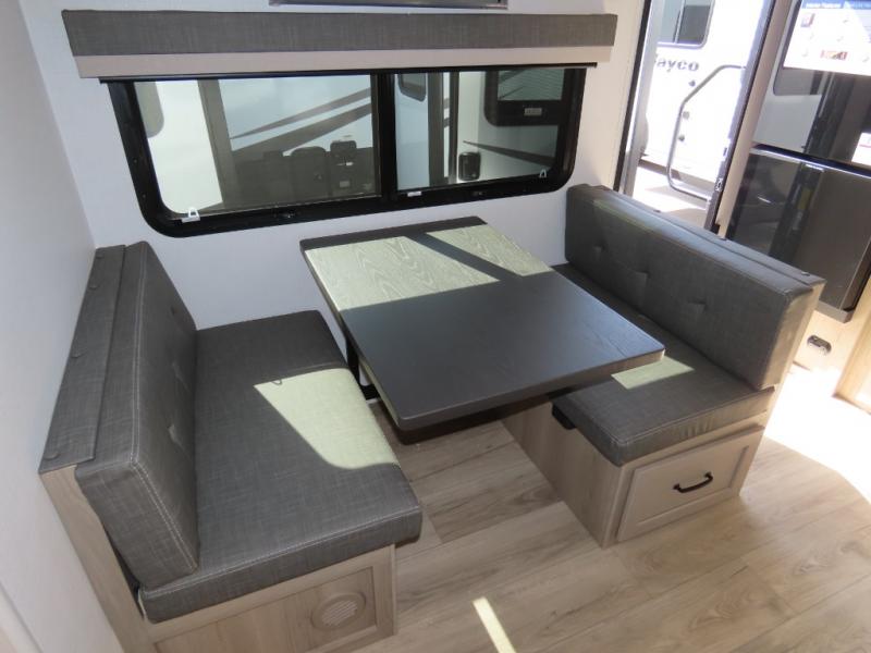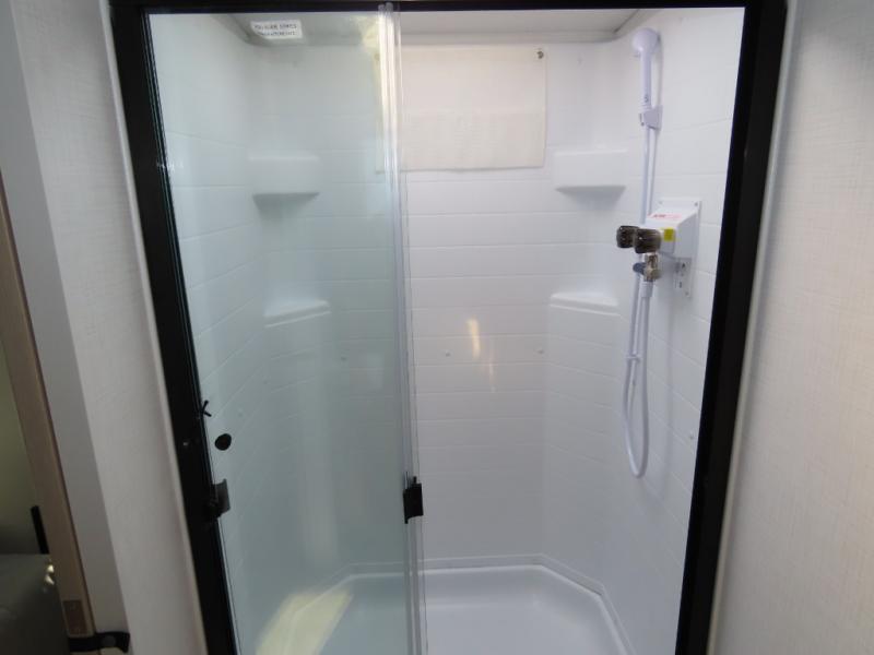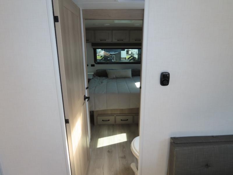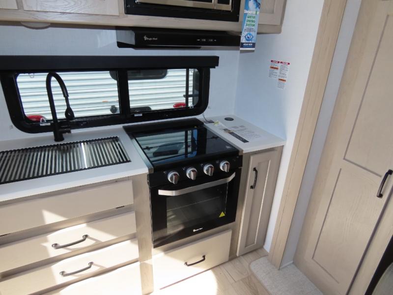 You and your spouse will have a great time camping in this travel trailer! You will have your own RV queen bed to sleep on in the front private bedroom, and an optional TV can be added if you enjoy the morning news in bed. Breakfast can be made on the three burner cooktop in the rear kitchen, or head outdoors to cook on the outside griddle. The 67" theater seating with cupholders will provide a place to relax and dine together, and the spacious walk-through bath will allow you to clean up before you head out for the day. This model includes plenty of storage space, including a pantry for your snacks, a wardrobe slide out in the bedroom, plus a drop-frame pass-through storage for larger camp gear!