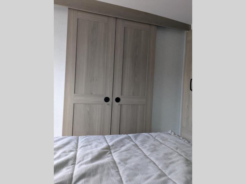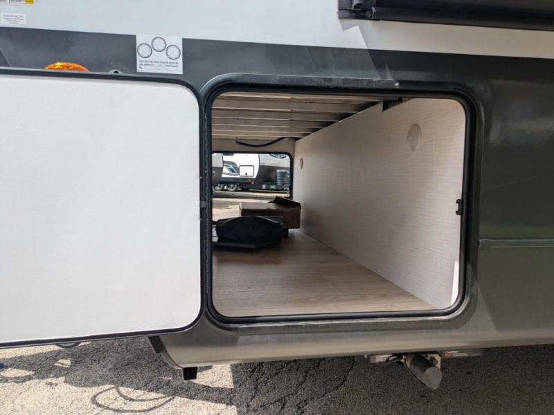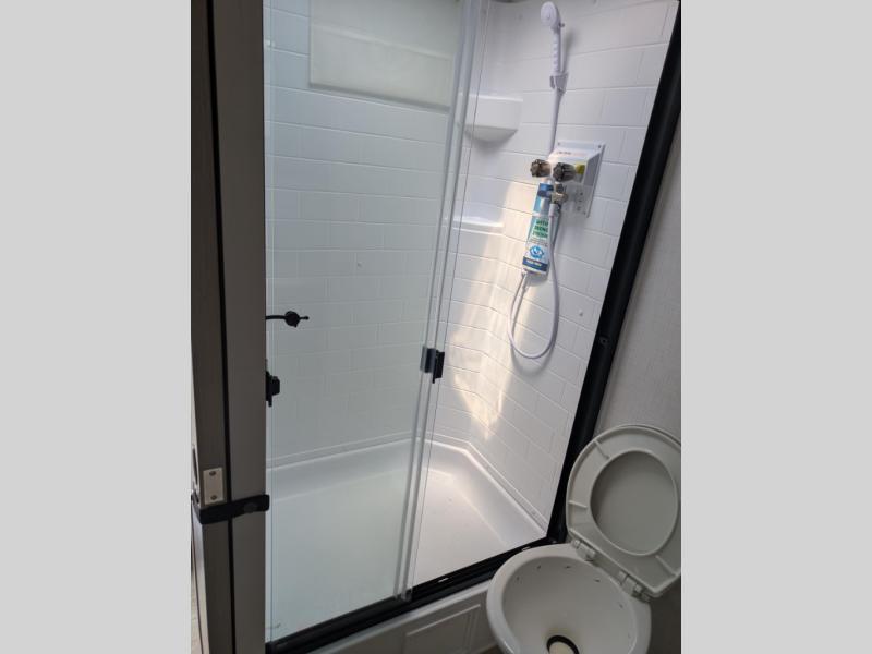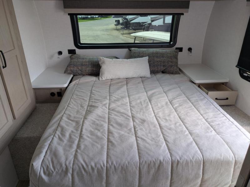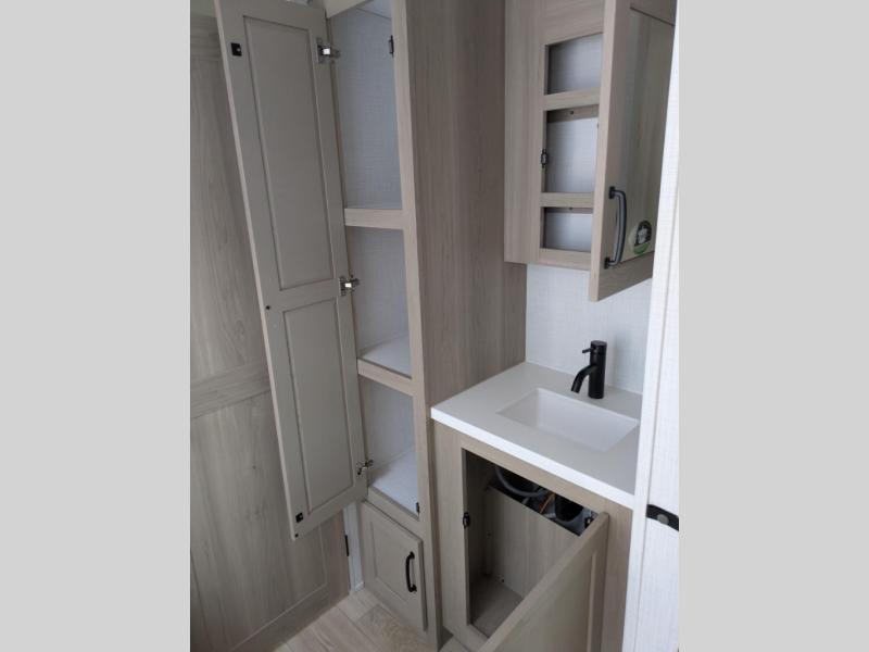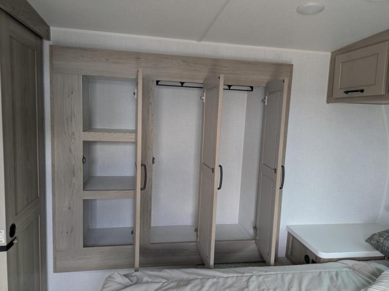 In the bedroom, the RV queen bed is flanked by dual wardrobes, and an optional TV adds even more relaxation. The walk-through bathroom creates a spacious and private setup, complete with linen storage and a roomy shower for refreshing after a long day. Plus, the drop-frame pass-through storage gives you ample space for camping gear, chairs, and tools.