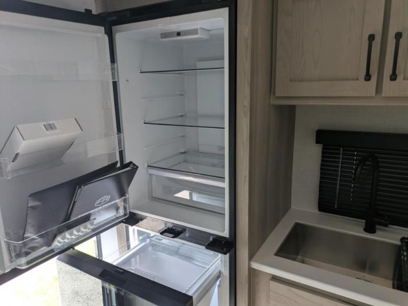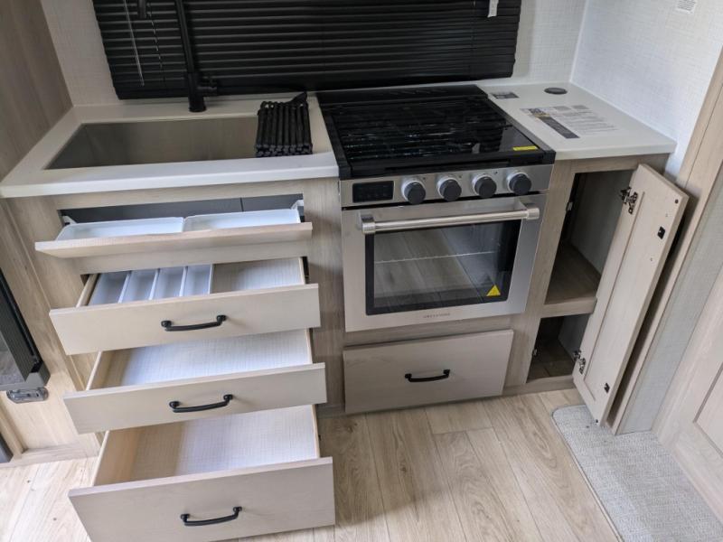 Inside, you’ll find a warm, inviting living space with theater seating directly across from a 12V Smart TV and cozy electric fireplace. Whether you’re binge-watching a favorite show or relaxing after a day outdoors, this setup gives you a true residential feel. The efficient rear kitchen includes a three-burner cooktop, microwave, solid surface countertops, and a spacious pantry—everything you need to cook up your favorite meals on the go.