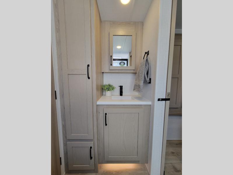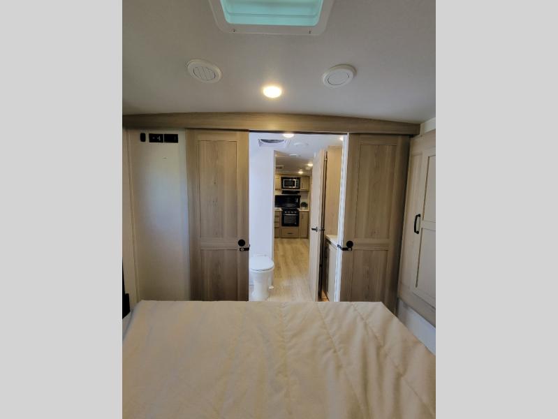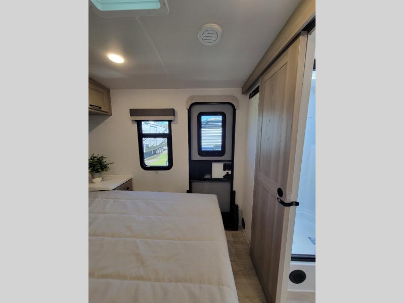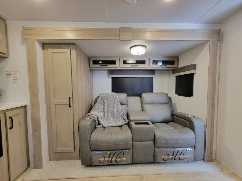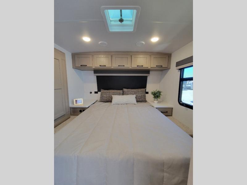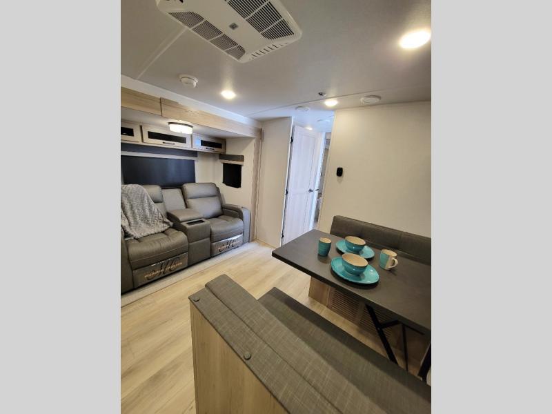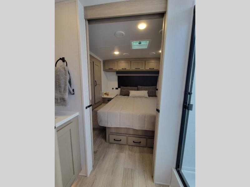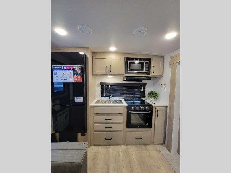 You and your spouse will have a great time camping in this travel trailer! You will have your own RV queen bed to sleep on in the front private bedroom, and an optional TV can be added if you enjoy the morning news in bed. Breakfast can be made on the three burner cooktop in the rear kitchen, or head outdoors to cook on the outside griddle. The 67" theater seating with cupholders will provide a place to relax and dine together, and the spacious walk-through bath will allow you to clean up before you head out for the day. This model includes plenty of storage space, including a pantry for your snacks, a wardrobe slide out in the bedroom, plus a drop-frame pass-through storage for larger camp gear!