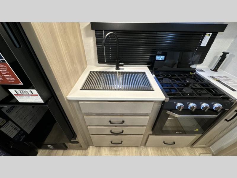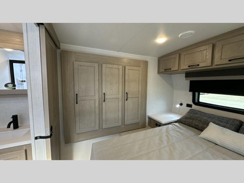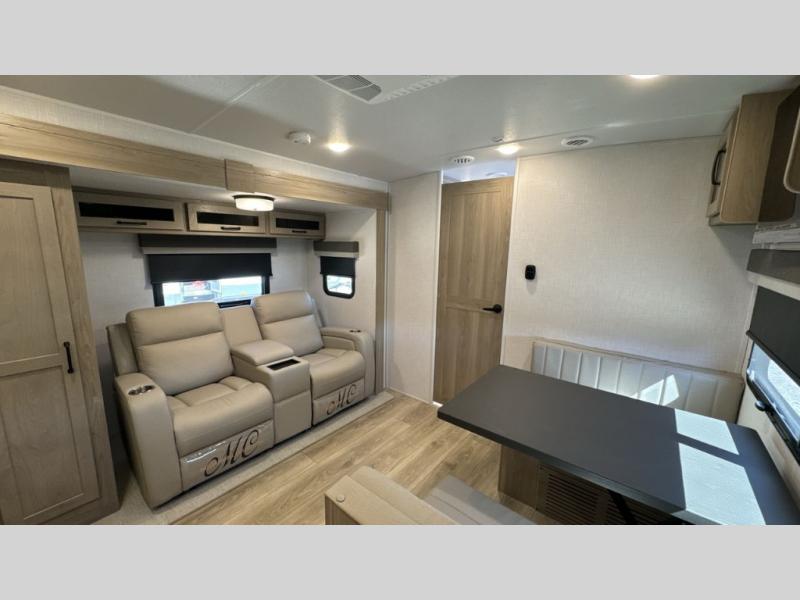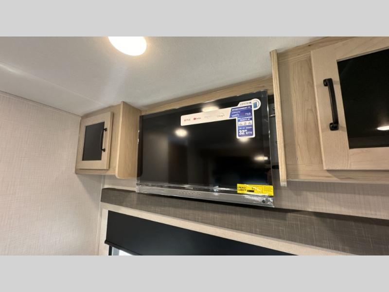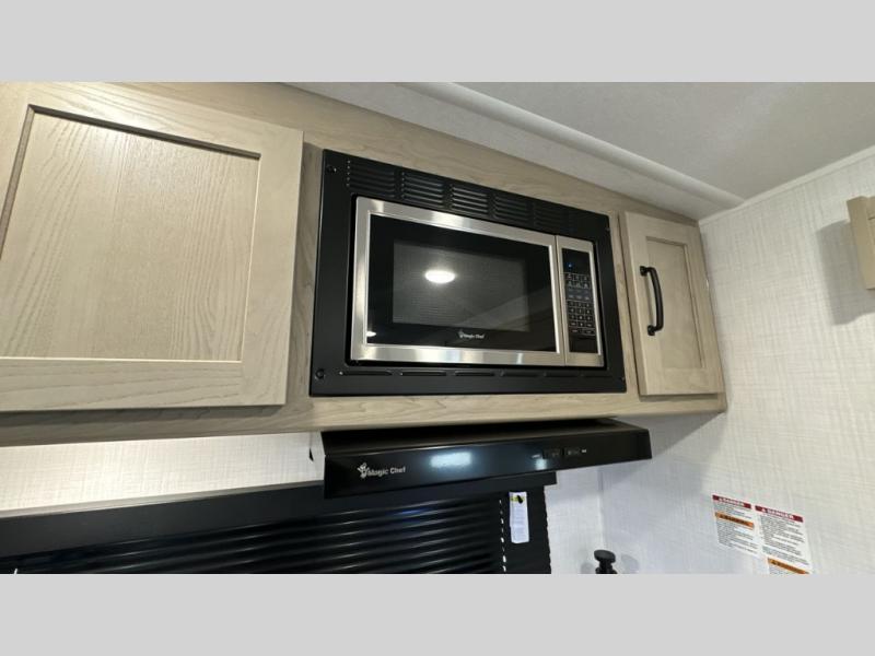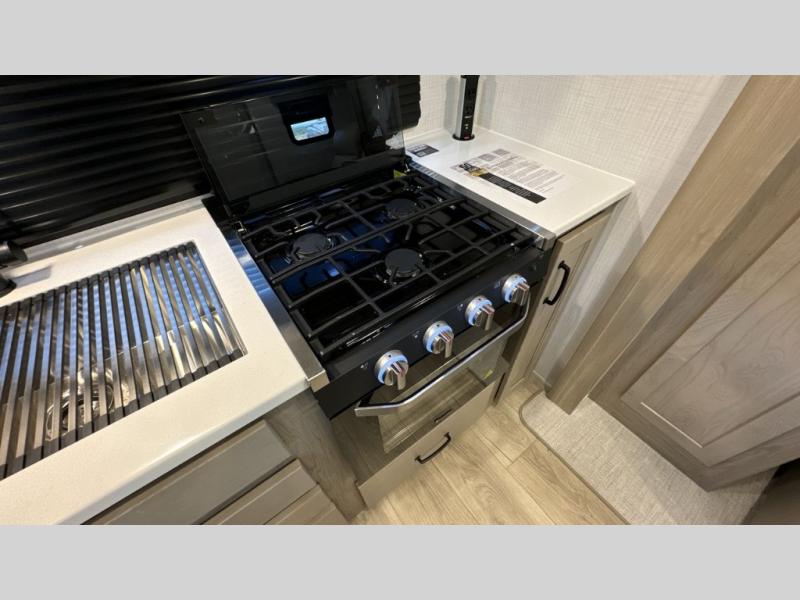 You and your spouse will have a great time camping in this travel trailer! You will have your own RV queen bed to sleep on in the front private bedroom, and an optional TV can be added if you enjoy the morning news in bed. Breakfast can be made on the three burner cooktop in the rear kitchen, or head outdoors to cook on the outside griddle. The 67" theater seating with cupholders will provide a place to relax and dine together, and the spacious walk-through bath will allow you to clean up before you head out for the day. This model includes plenty of storage space, including a pantry for your snacks, a wardrobe slide out in the bedroom, plus a drop-frame pass-through storage for larger camp gear!