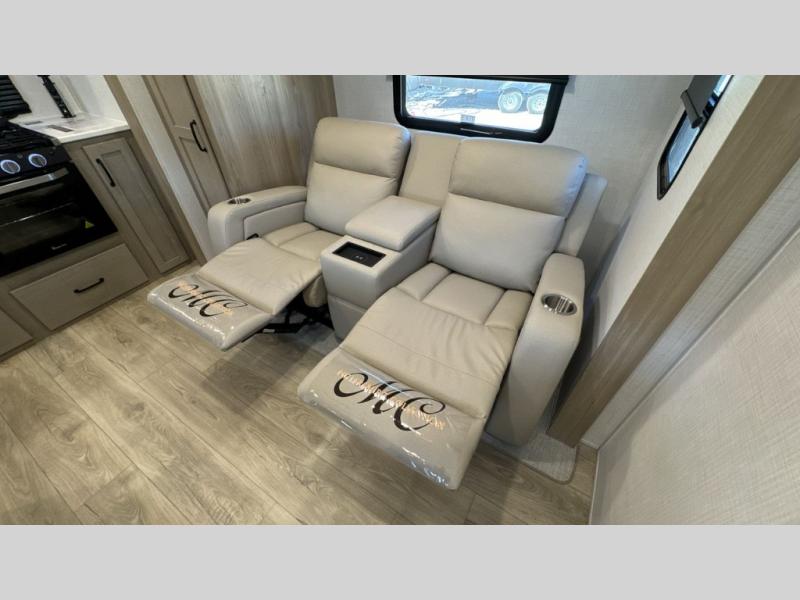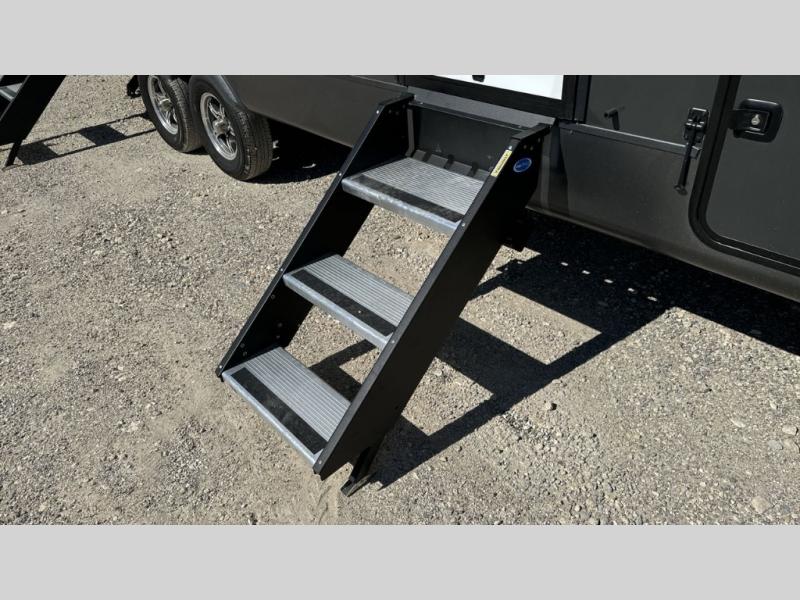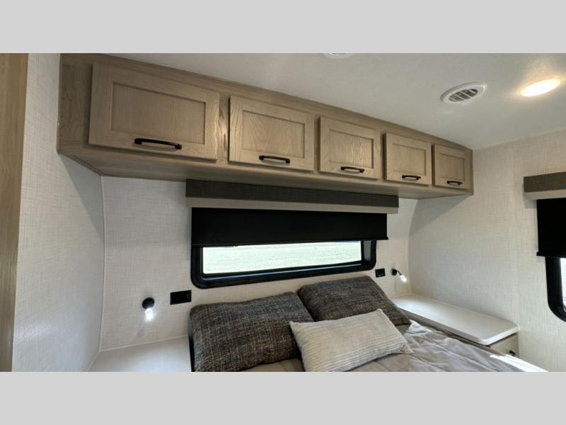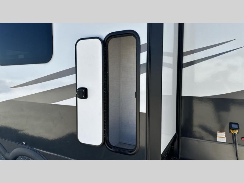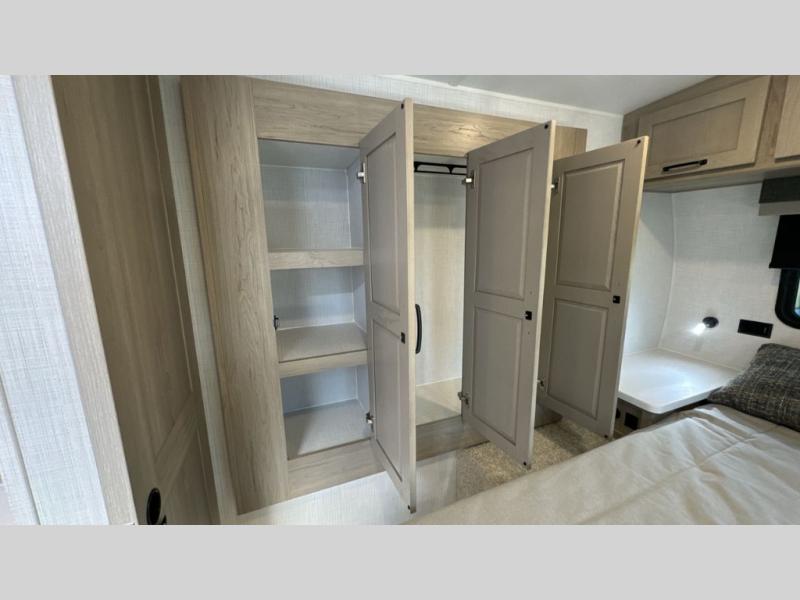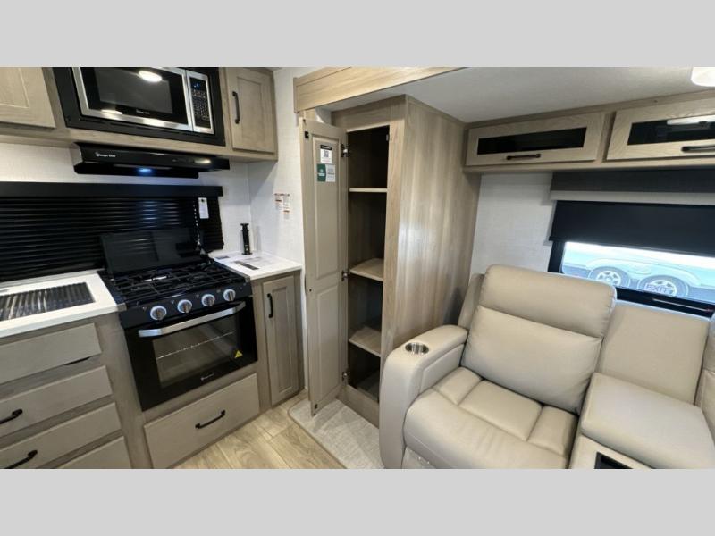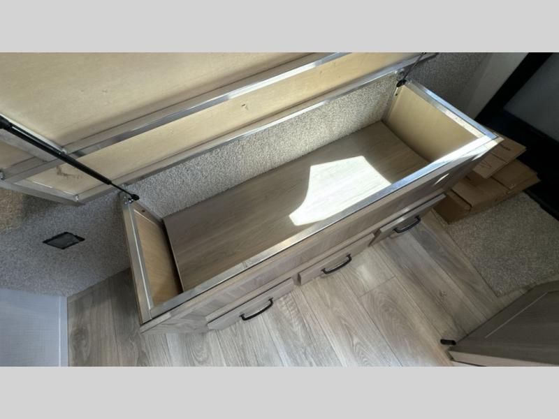 You and your spouse will have a great time camping in this travel trailer! You will have your own RV queen bed to sleep on in the front private bedroom, and an optional TV can be added if you enjoy the morning news in bed. Breakfast can be made on the three burner cooktop in the rear kitchen, or head outdoors to cook on the outside griddle. The 67" theater seating with cupholders will provide a place to relax and dine together, and the spacious walk-through bath will allow you to clean up before you head out for the day. This model includes plenty of storage space, including a pantry for your snacks, a wardrobe slide out in the bedroom, plus a drop-frame pass-through storage for larger camp gear!