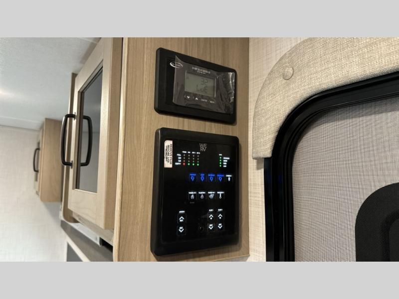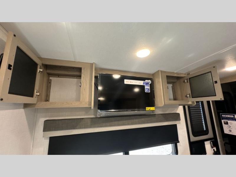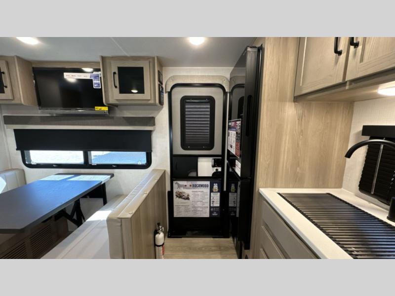 Each Rockwood Mini Lite travel trailer by Forest River is constructed with a fully laminated one-piece walkable roof, sleek frameless windows, and a six-sided full aluminum frame for strength and durability. The 12V thermostatically controlled heated tanks, plus radiant foil in the underbelly and slide out floors will allow you to camp well into the colder months, and the 200W roof solar panel will be perfect for a little off-gridding. Each model includes solid surface kitchen countertops, solid wood cabinet doors, night roller shades, plus many more interior features. Having an AIR 360+ omnidirectional antenna with WiFi prep on board gives you the option to get some work done if it's needed, and the power tongue jack provides hassle-free set up, so you can enjoy more time relaxing!
