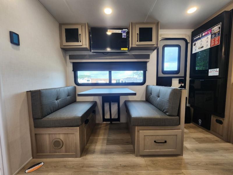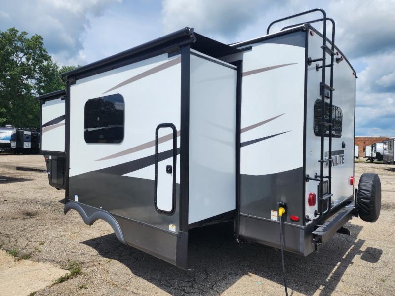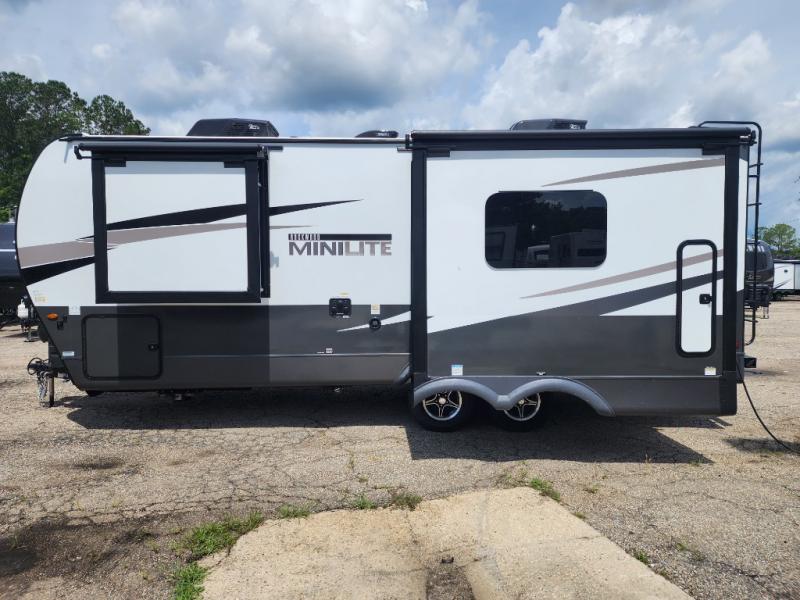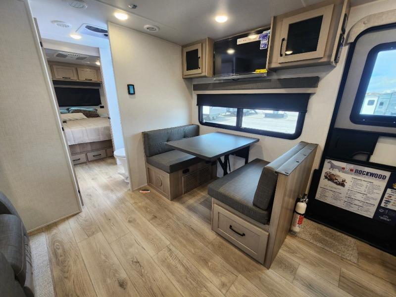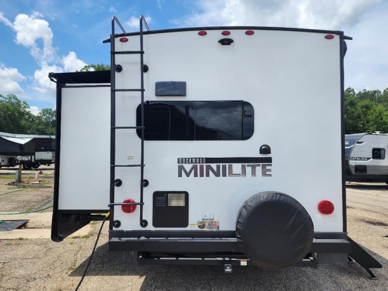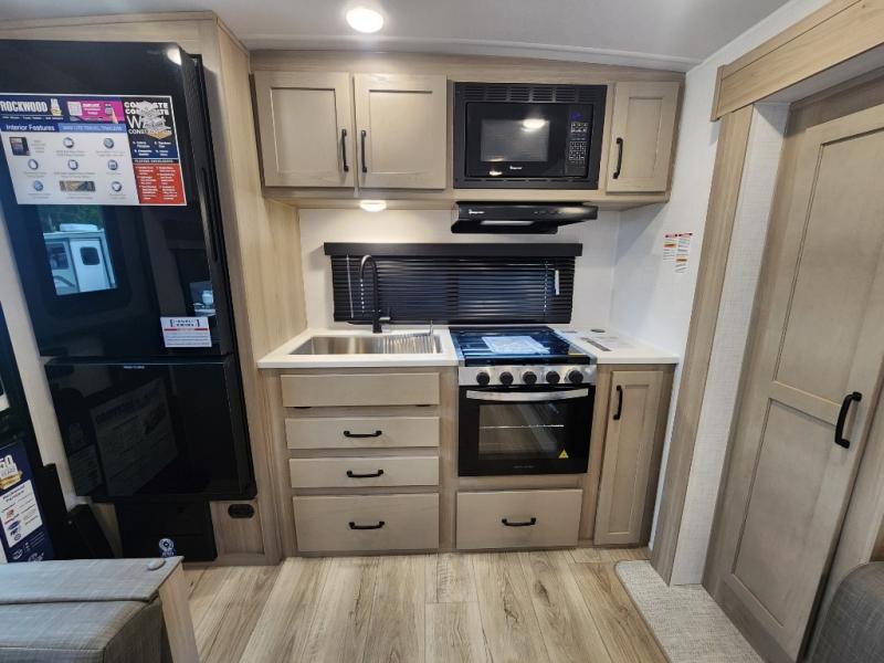 Each Rockwood Mini Lite travel trailer by Forest River is constructed with a fully laminated one-piece walkable roof, sleek frameless windows, and a six-sided full aluminum frame for strength and durability. The 12V thermostatically controlled heated tanks, plus radiant foil in the underbelly and slide out floors will allow you to camp well into the colder months, and the 200W roof solar panel will be perfect for a little off-gridding. Each model includes solid surface kitchen countertops, solid wood cabinet doors, night roller shades, plus many more interior features. Having an AIR 360+ omnidirectional antenna with WiFi prep on board gives you the option to get some work done if it's needed, and the power tongue jack provides hassle-free set up, so you can enjoy more time relaxing!
