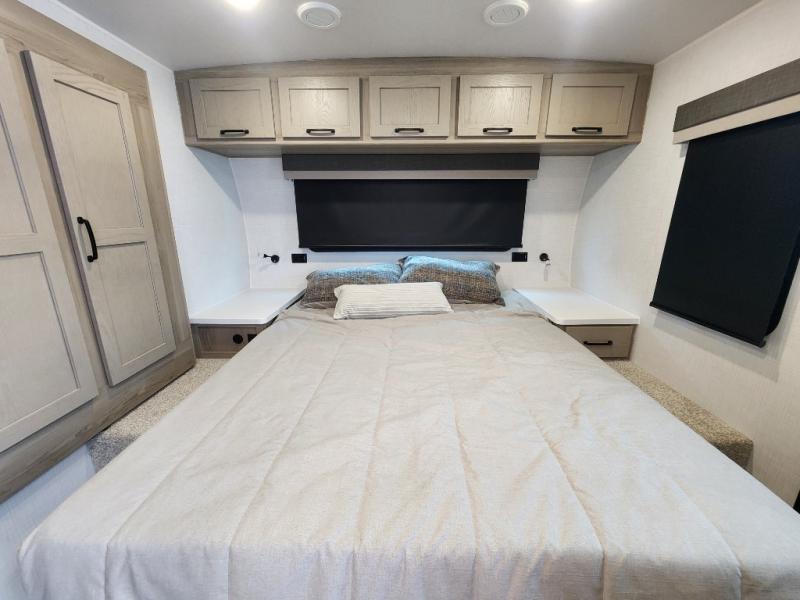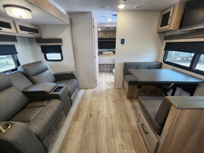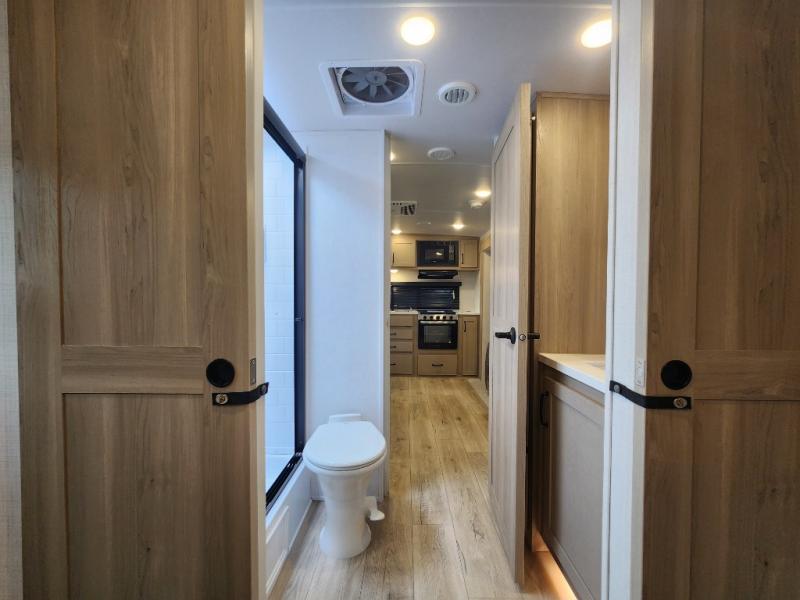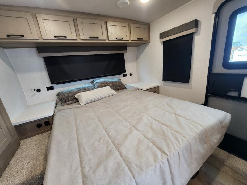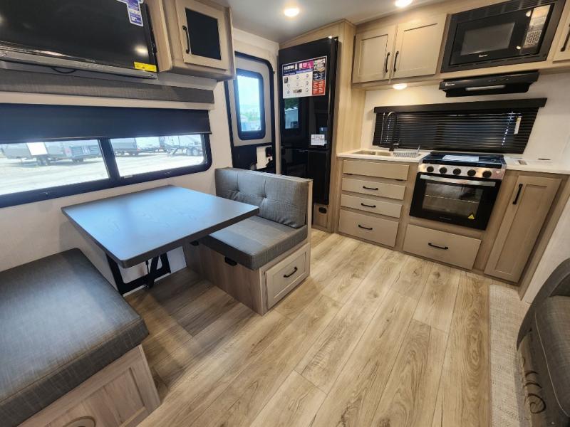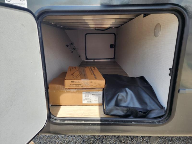 You and your spouse will have a great time camping in this travel trailer! You will have your own RV queen bed to sleep on in the front private bedroom, and an optional TV can be added if you enjoy the morning news in bed. Breakfast can be made on the three burner cooktop in the rear kitchen, or head outdoors to cook on the outside griddle. The 67" theater seating with cupholders will provide a place to relax and dine together, and the spacious walk-through bath will allow you to clean up before you head out for the day. This model includes plenty of storage space, including a pantry for your snacks, a wardrobe slide out in the bedroom, plus a drop-frame pass-through storage for larger camp gear!