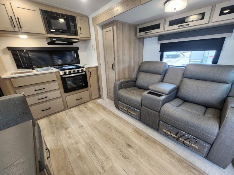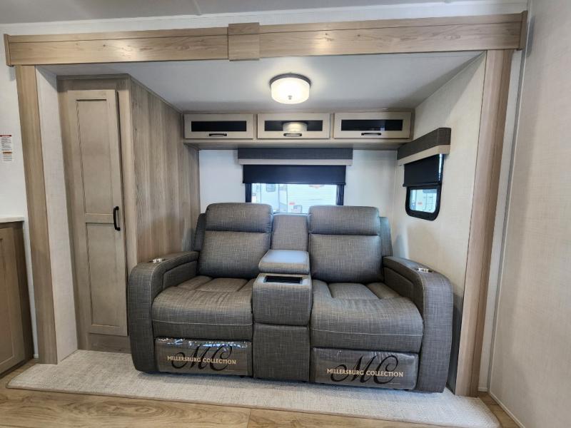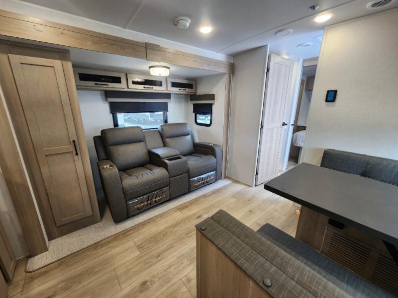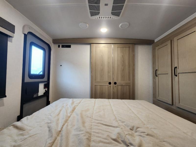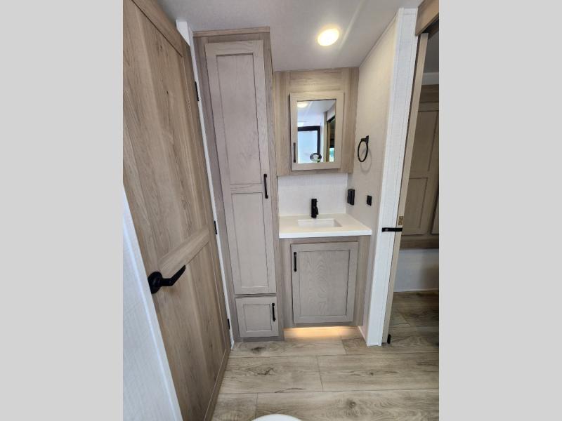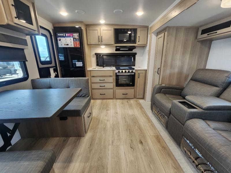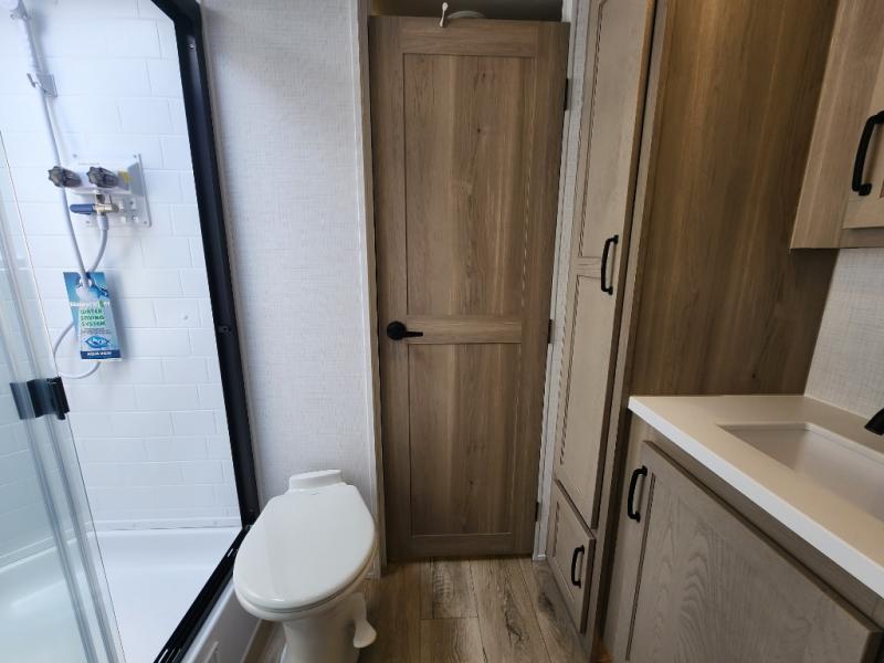 You and your spouse will have a great time camping in this travel trailer! You will have your own RV queen bed to sleep on in the front private bedroom, and an optional TV can be added if you enjoy the morning news in bed. Breakfast can be made on the three burner cooktop in the rear kitchen, or head outdoors to cook on the outside griddle. The 67" theater seating with cupholders will provide a place to relax and dine together, and the spacious walk-through bath will allow you to clean up before you head out for the day. This model includes plenty of storage space, including a pantry for your snacks, a wardrobe slide out in the bedroom, plus a drop-frame pass-through storage for larger camp gear!