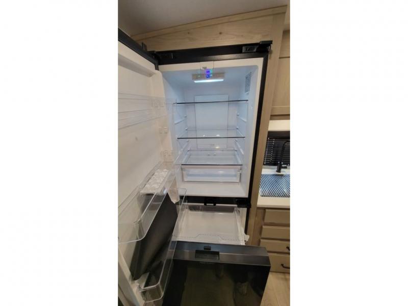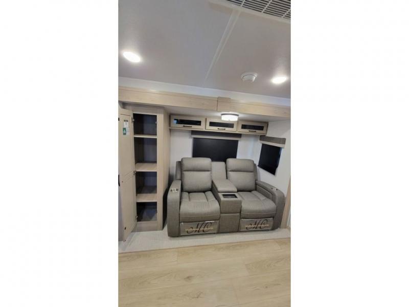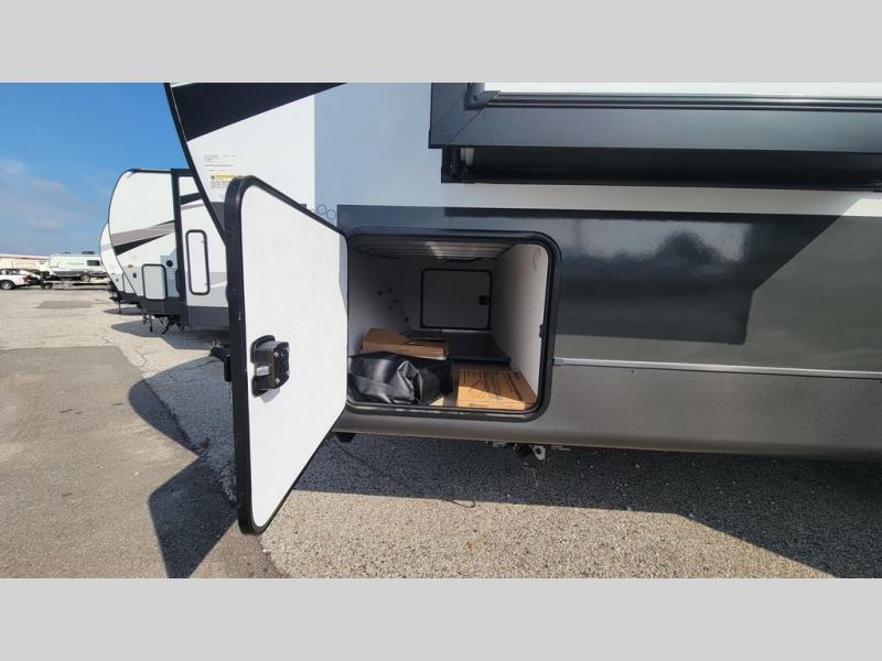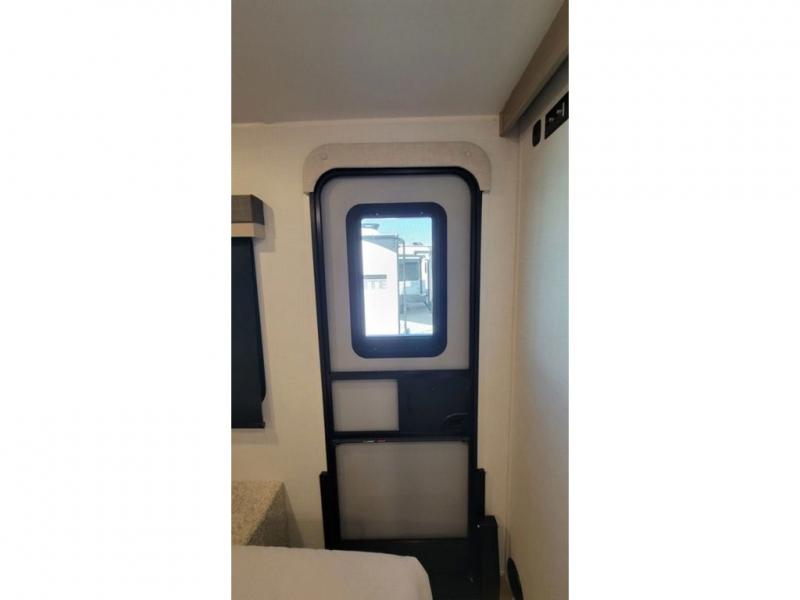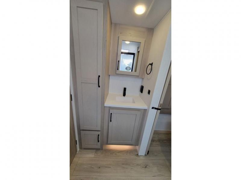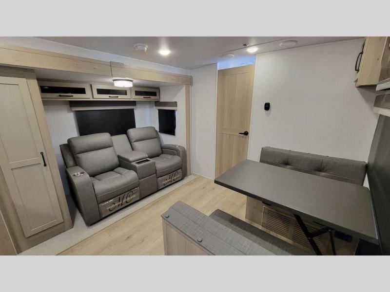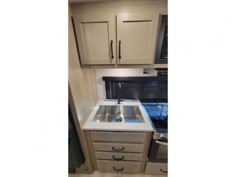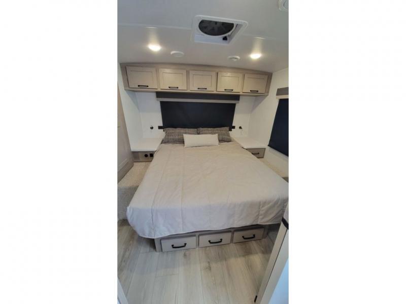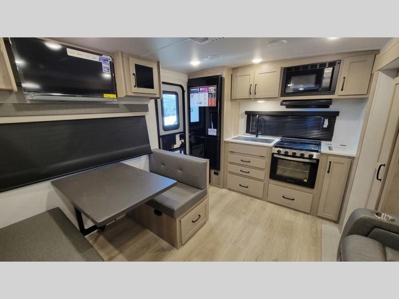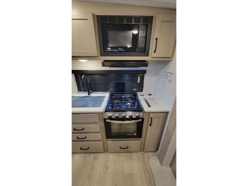 You and your spouse will have a great time camping in this travel trailer! You will have your own RV queen bed to sleep on in the front private bedroom, and an optional TV can be added if you enjoy the morning news in bed. Breakfast can be made on the three burner cooktop in the rear kitchen, or head outdoors to cook on the outside griddle. The 67" theater seating with cupholders will provide a place to relax and dine together, and the spacious walk-through bath will allow you to clean up before you head out for the day. This model includes plenty of storage space, including a pantry for your snacks, a wardrobe slide out in the bedroom, plus a drop-frame pass-through storage for larger camp gear!