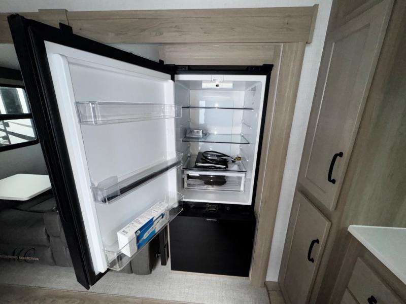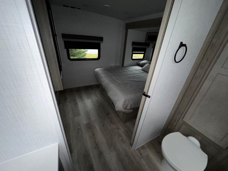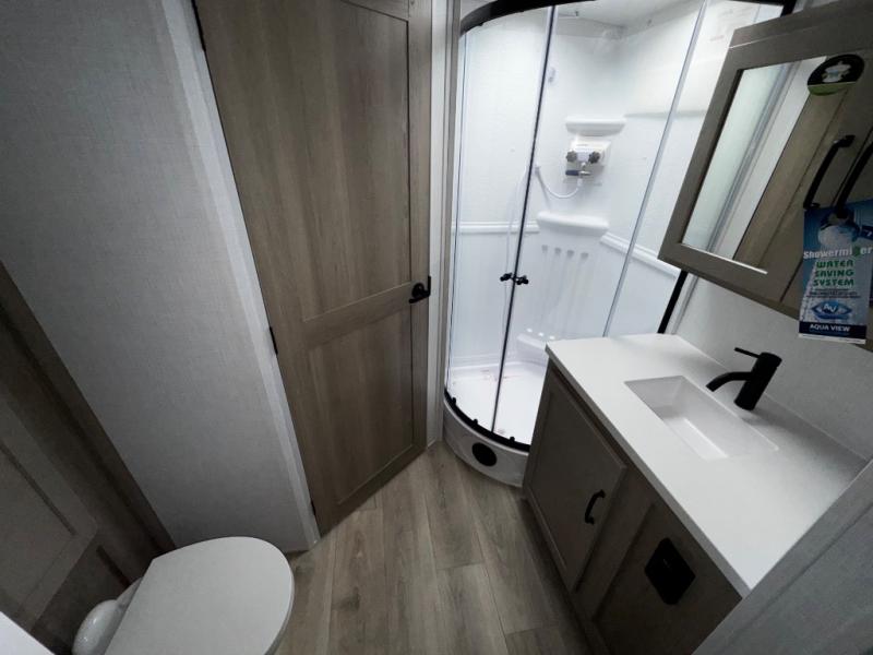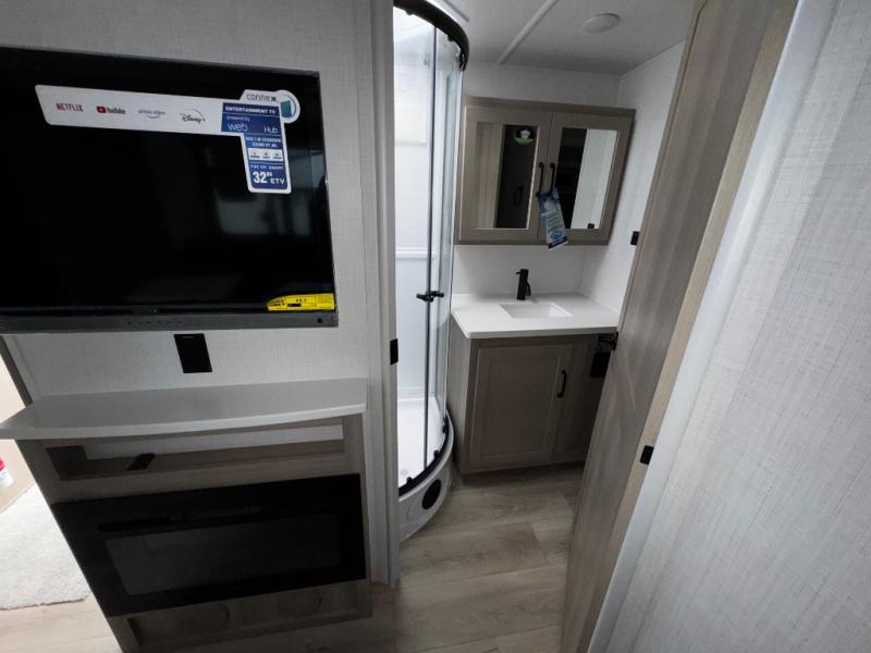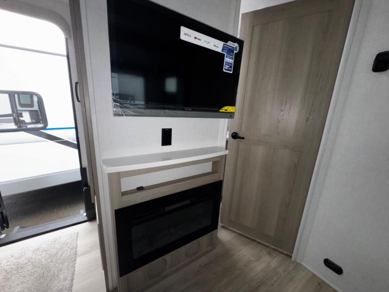 Escape the city life for weekend trips in this cozy couple's trailer. The dual entry doors will allow you to enter in through the rear private bedroom, or the front kitchen/main living area for convenience. You will enjoy relaxing on the theater seating across from the 32" TV and fireplace in the evenings, or you can visit outdoors under the 19' power awning. You'll also find an exterior griddle here for quick meals and exterior storage for the fishing poles or hiking gear. This model also includes a walk-through bath with a shower skylight, a linen closet, plus a Showermiser Water Saving System. And don't worry about storage space inside since this model includes an entryway pantry/closet, a second pantry in the front kitchen, plus a large bedroom wardrobe to keep your clothes wrinkle-free!