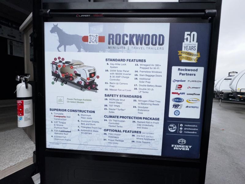 Each Rockwood Mini Lite travel trailer by Forest River is constructed with a fully laminated one-piece walkable roof, sleek frameless windows, and a six-sided full aluminum frame for strength and durability. The 12V thermostatically controlled heated tanks, plus radiant foil in the underbelly and slide out floors will allow you to camp well into the colder months, and the 200W roof solar panel will be perfect for a little off-gridding. Each model includes solid surface kitchen countertops, solid wood cabinet doors, night roller shades, plus many more interior features. Having an AIR 360+ omnidirectional antenna with WiFi prep on board gives you the option to get some work done if it's needed, and the power tongue jack provides hassle-free set up, so you can enjoy more time relaxing!
