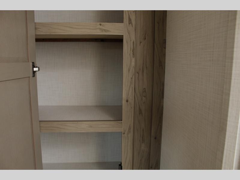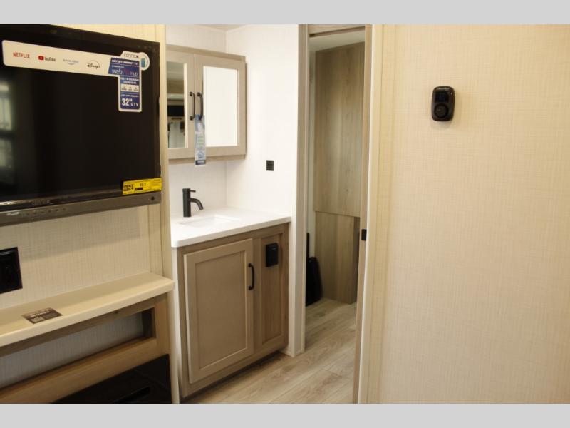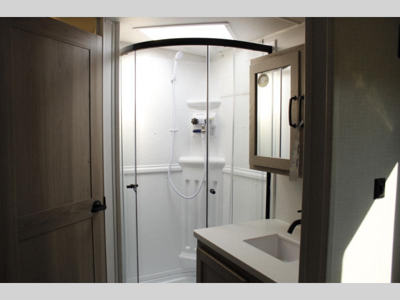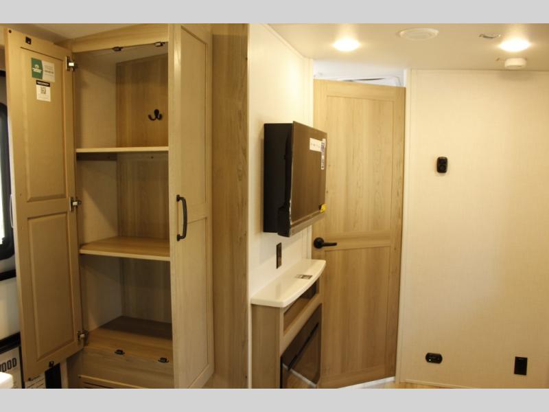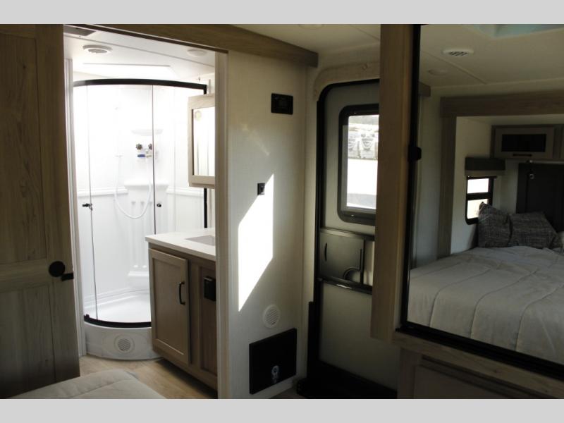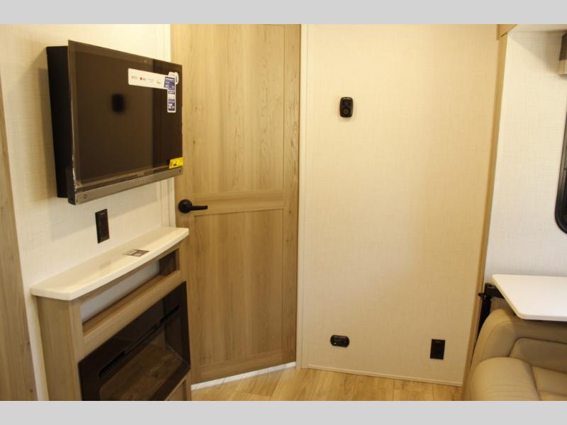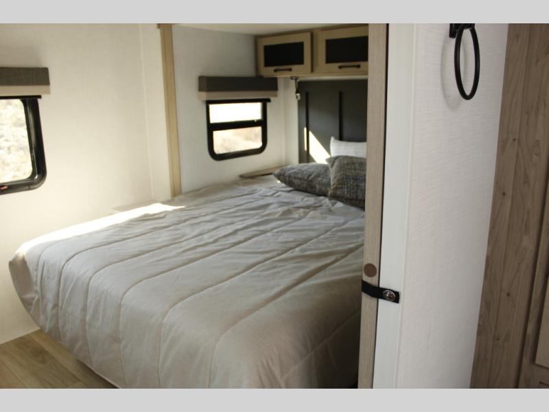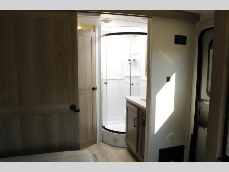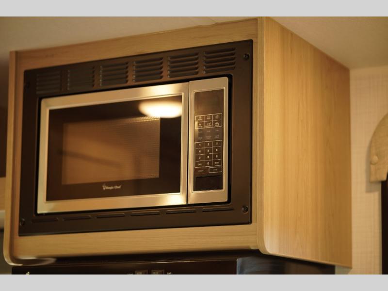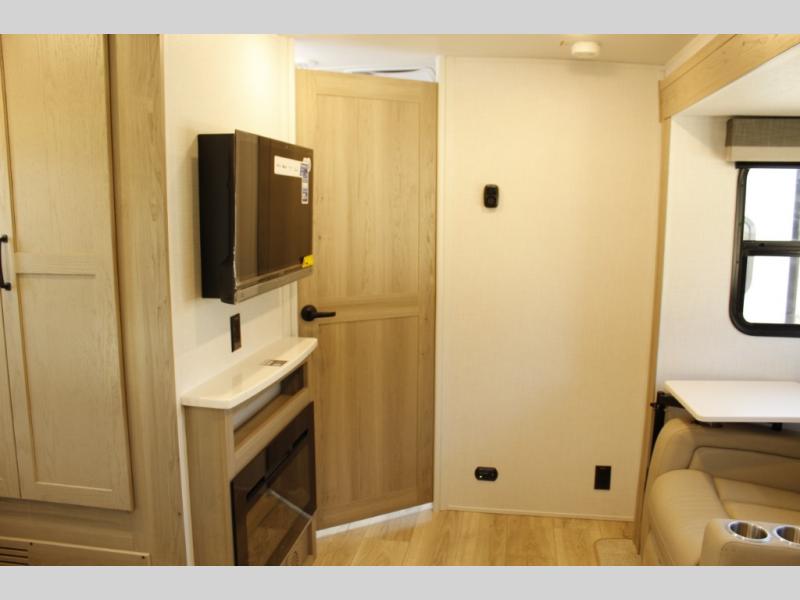Escape the city life for weekend trips in this cozy couple's trailer. The dual entry doors will allow you to enter in through the rear private bedroom, or the front kitchen/main living area for convenience. You will enjoy relaxing on the theater seating across from the 32" TV and fireplace in the evenings, or you can visit outdoors under the 19' power awning. You'll also find an exterior griddle here for quick meals and exterior storage for the fishing poles or hiking gear. This model also includes a walk-through bath with a shower skylight, a linen closet, plus a Showermiser Water Saving System. And don't worry about storage space inside since this model includes an entryway pantry/closet, a second pantry in the front kitchen, plus a large bedroom wardrobe to keep your clothes wrinkle-free!