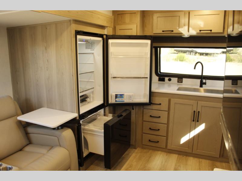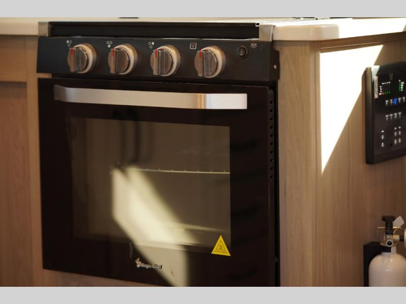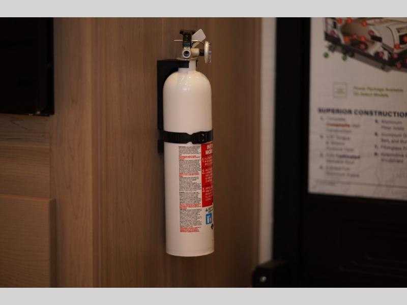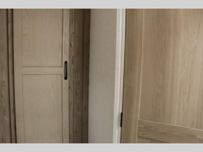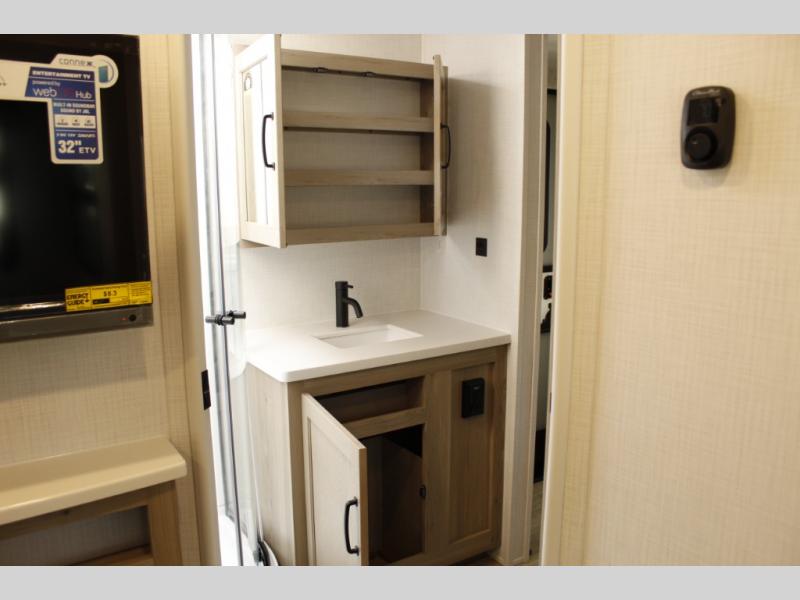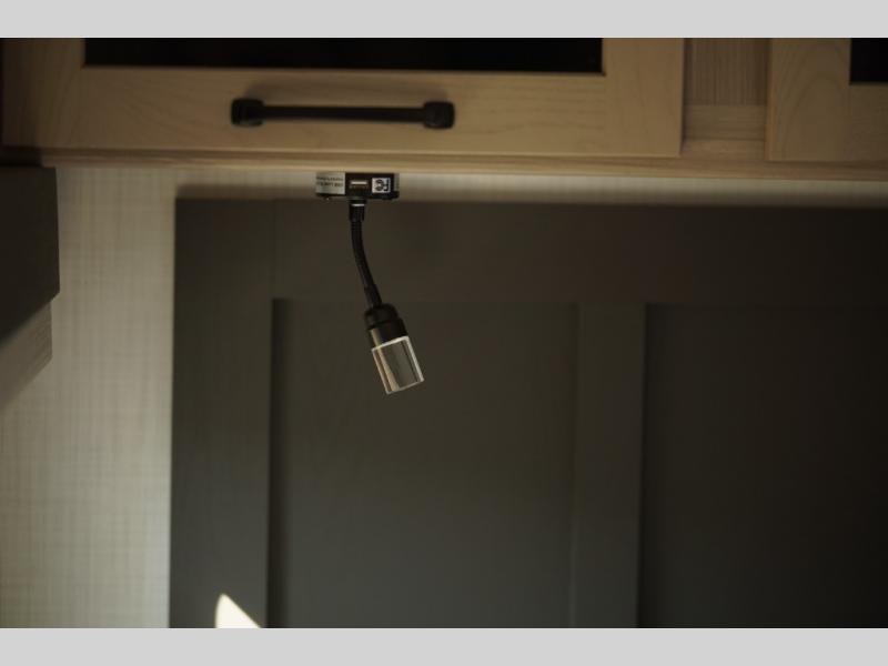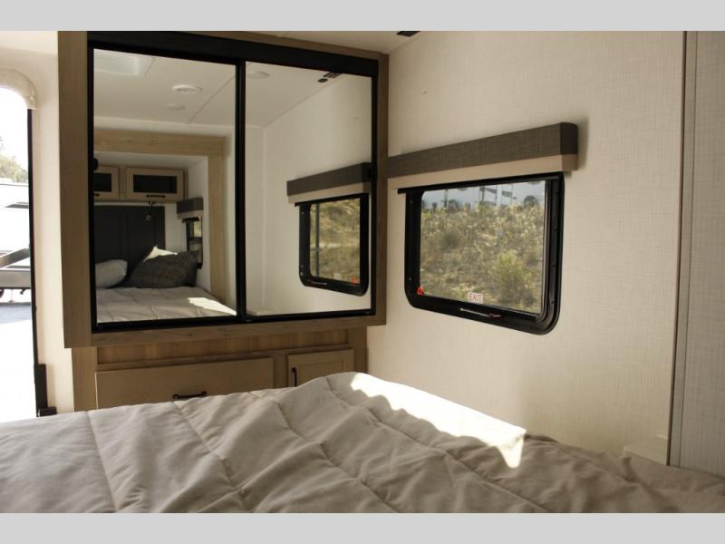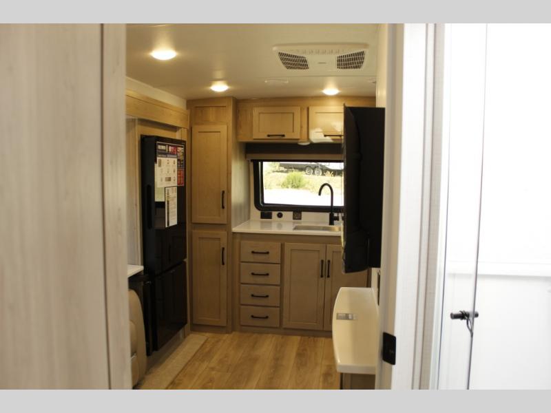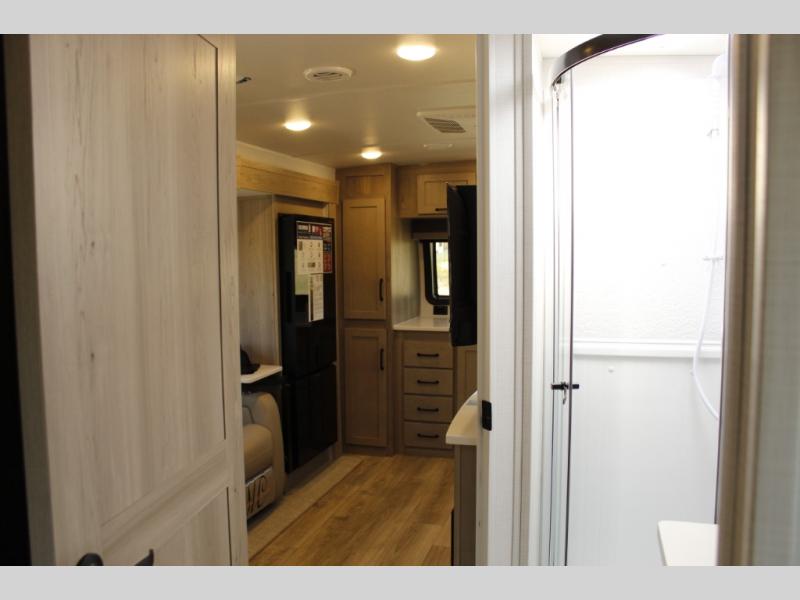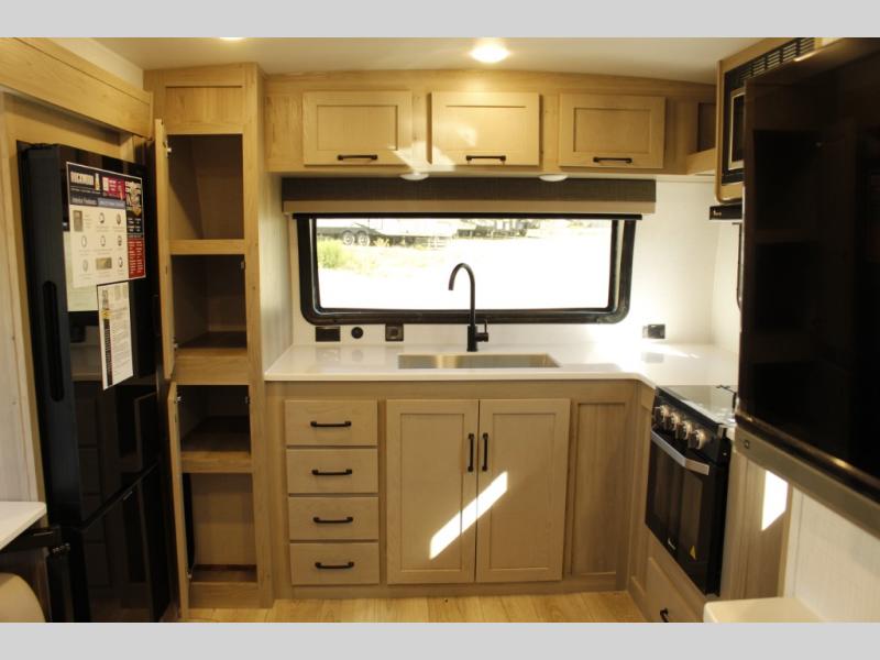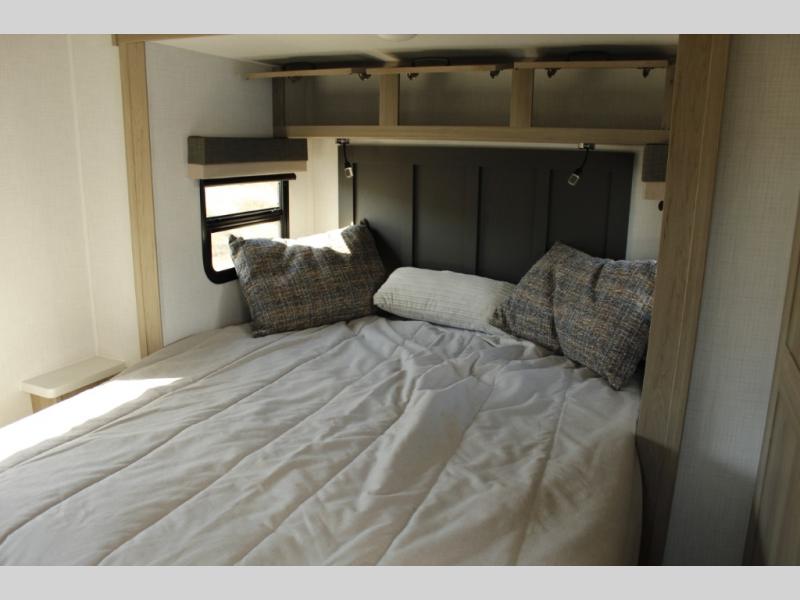 Escape the city life for weekend trips in this cozy couple's trailer. The dual entry doors will allow you to enter in through the rear private bedroom, or the front kitchen/main living area for convenience. You will enjoy relaxing on the theater seating across from the 32" TV and fireplace in the evenings, or you can visit outdoors under the 19' power awning. You'll also find an exterior griddle here for quick meals and exterior storage for the fishing poles or hiking gear. This model also includes a walk-through bath with a shower skylight, a linen closet, plus a Showermiser Water Saving System. And don't worry about storage space inside since this model includes an entryway pantry/closet, a second pantry in the front kitchen, plus a large bedroom wardrobe to keep your clothes wrinkle-free!
