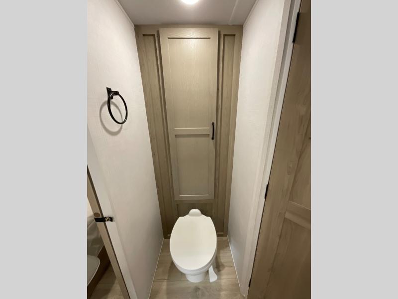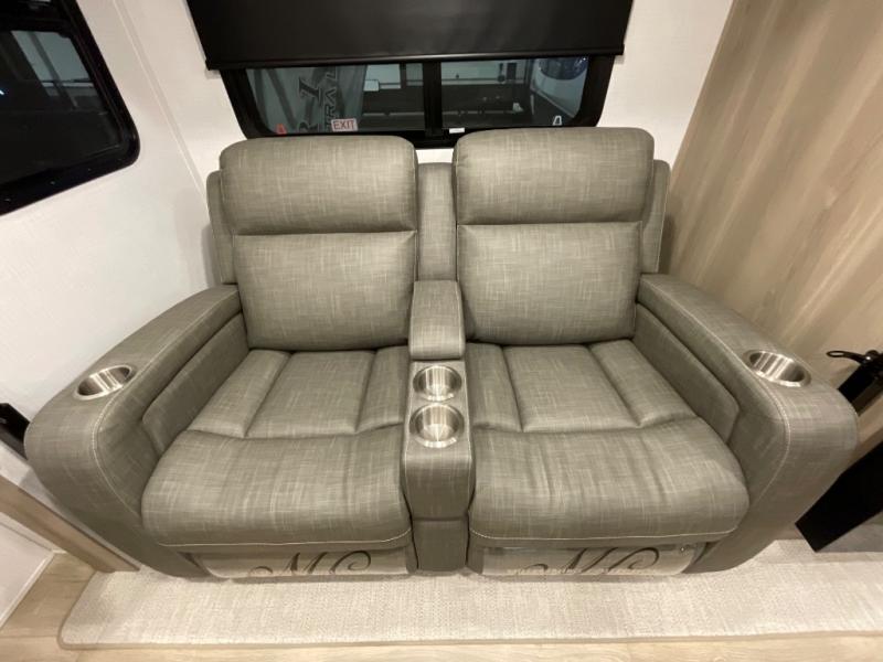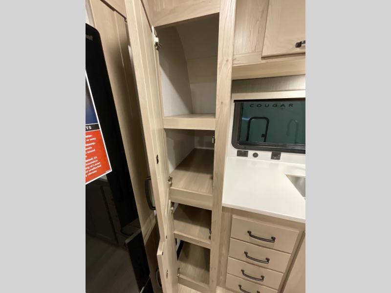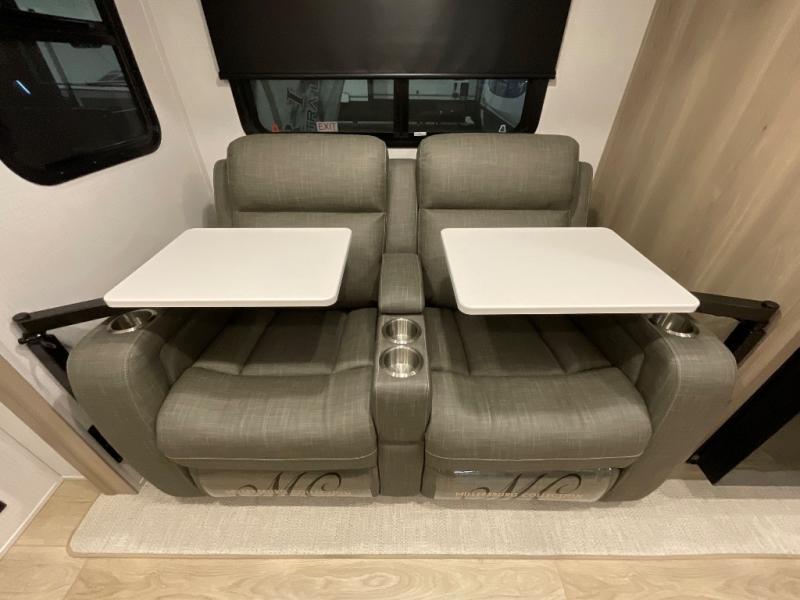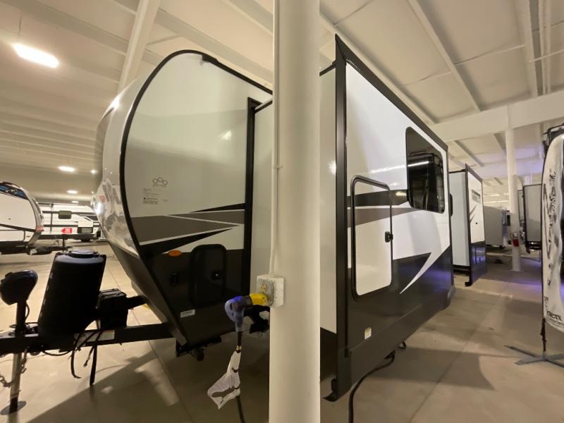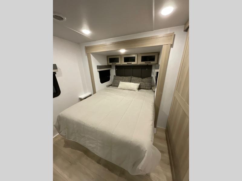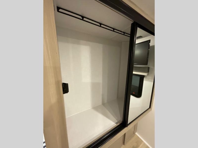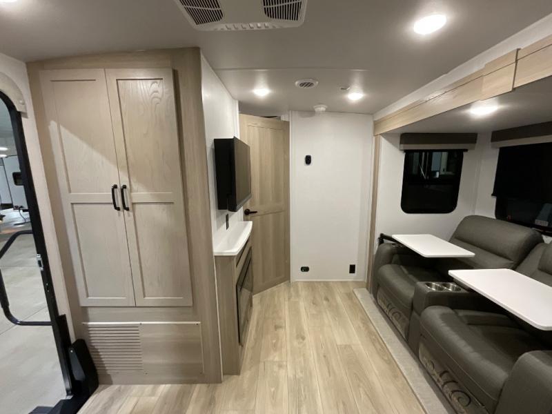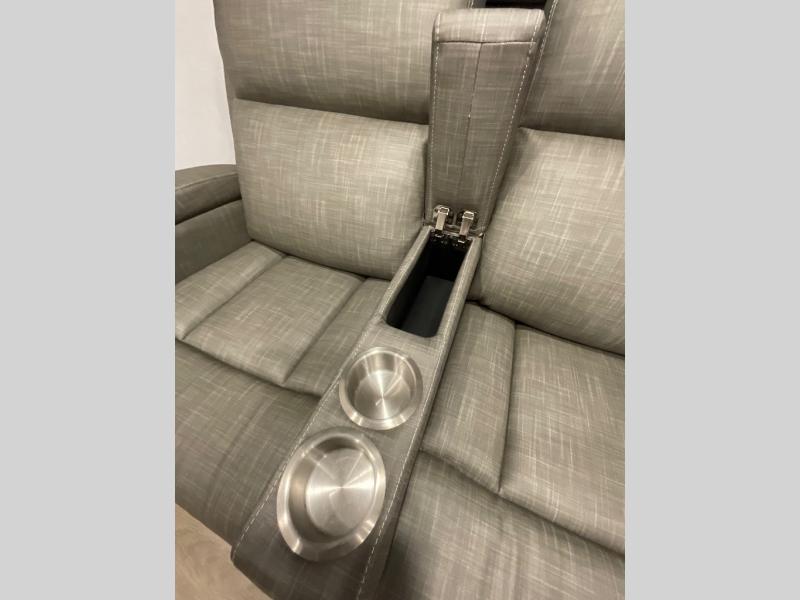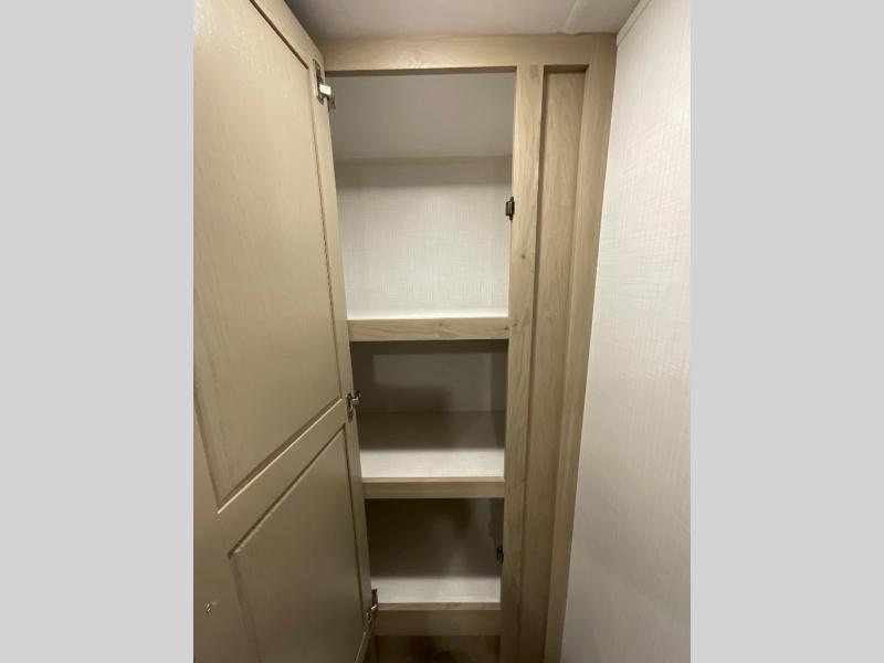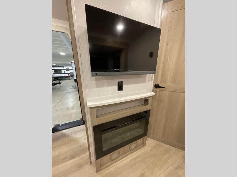 Escape the city life for weekend trips in this cozy couple's trailer. The dual entry doors will allow you to enter in through the rear private bedroom, or the front kitchen/main living area for convenience. You will enjoy relaxing on the theater seating across from the 32" TV and fireplace in the evenings, or you can visit outdoors under the 19' power awning. You'll also find an exterior griddle here for quick meals and exterior storage for the fishing poles or hiking gear. This model also includes a walk-through bath with a shower skylight, a linen closet, plus a Showermiser Water Saving System. And don't worry about storage space inside since this model includes an entryway pantry/closet, a second pantry in the front kitchen, plus a large bedroom wardrobe to keep your clothes wrinkle-free!