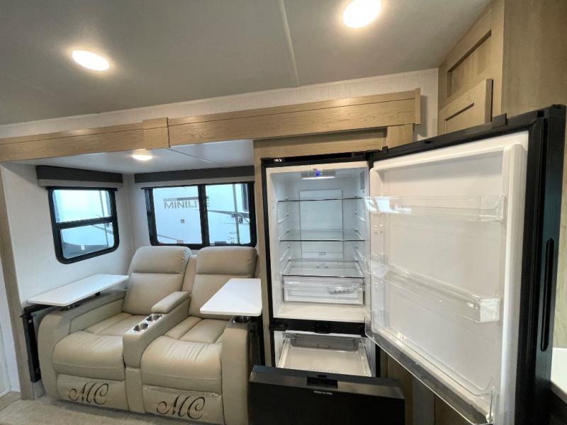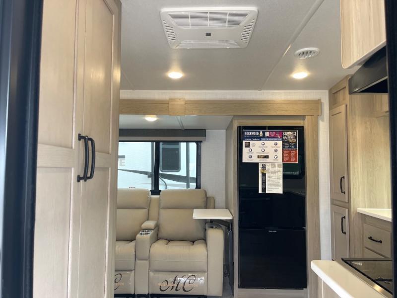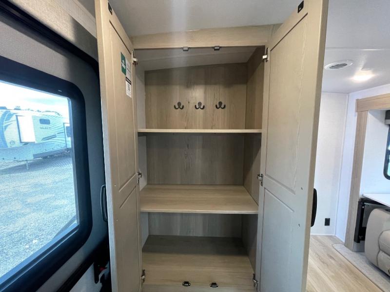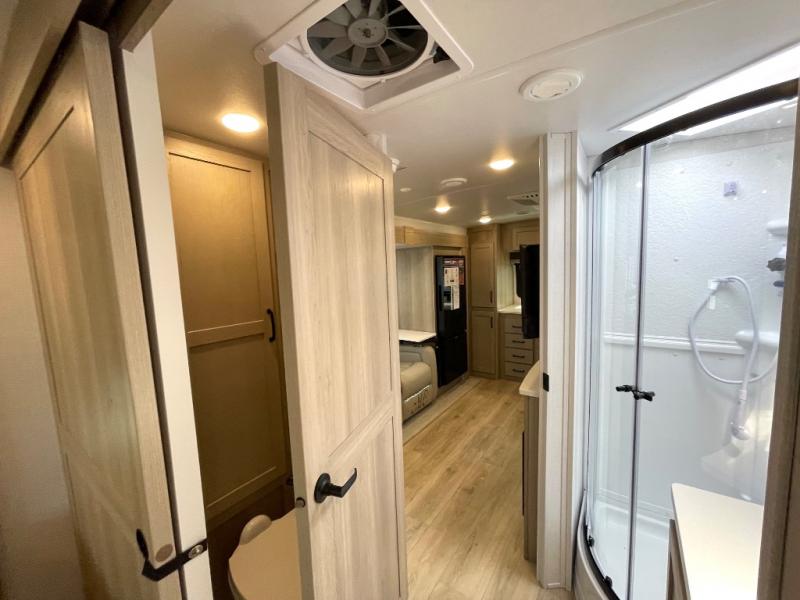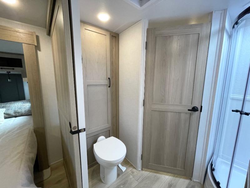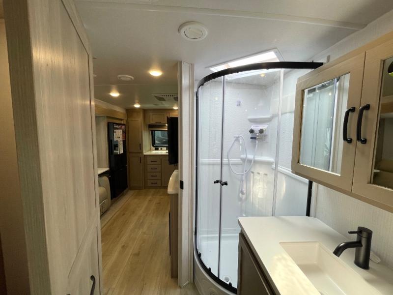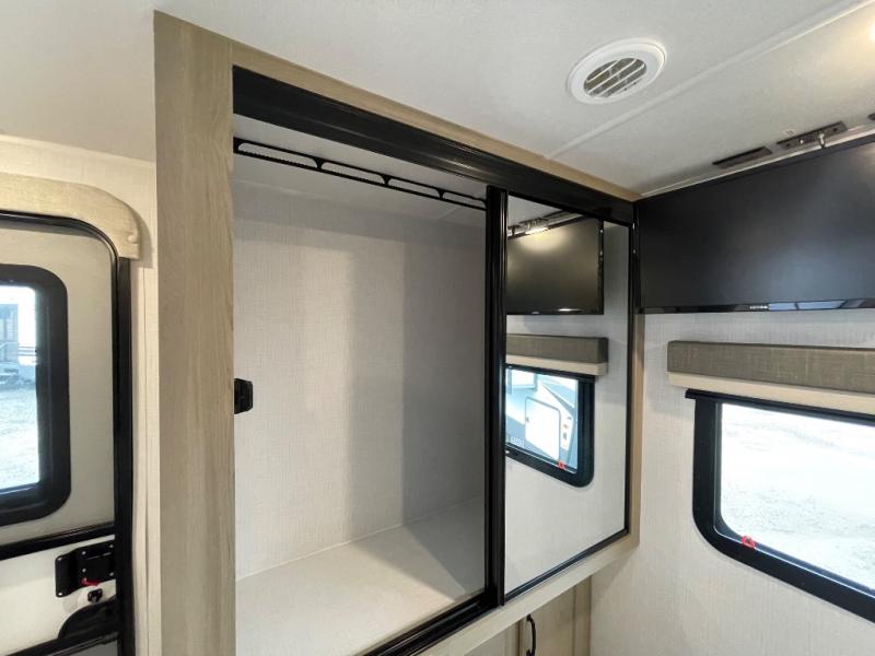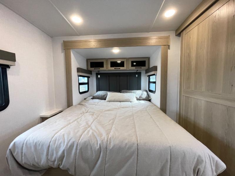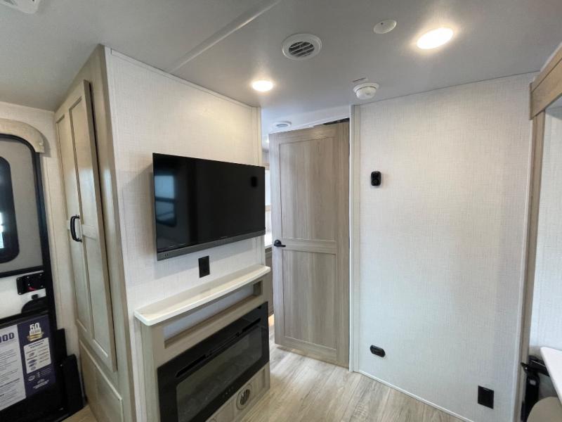 Escape the city life for weekend trips in this cozy couple's trailer. The dual entry doors will allow you to enter in through the rear private bedroom, or the front kitchen/main living area for convenience. You will enjoy relaxing on the theater seating across from the 32" TV and fireplace in the evenings, or you can visit outdoors under the 19' power awning. You'll also find an exterior griddle here for quick meals and exterior storage for the fishing poles or hiking gear. This model also includes a walk-through bath with a shower skylight, a linen closet, plus a Showermiser Water Saving System. And don't worry about storage space inside since this model includes an entryway pantry/closet, a second pantry in the front kitchen, plus a large bedroom wardrobe to keep your clothes wrinkle-free!