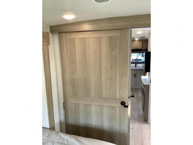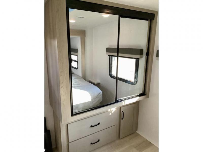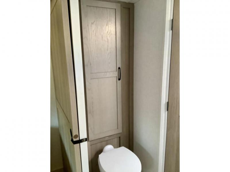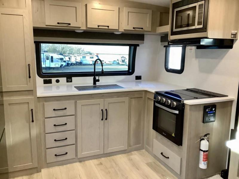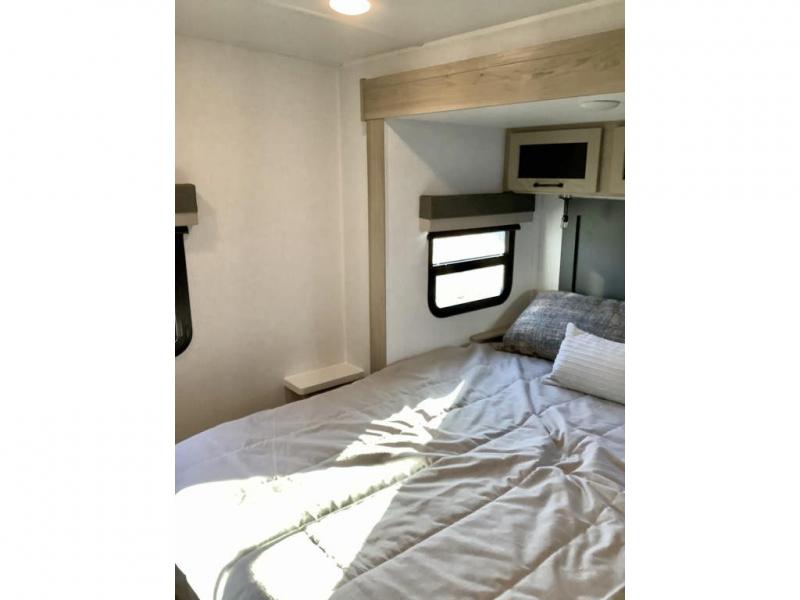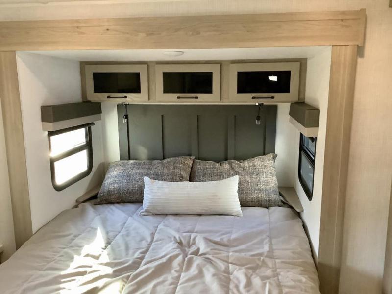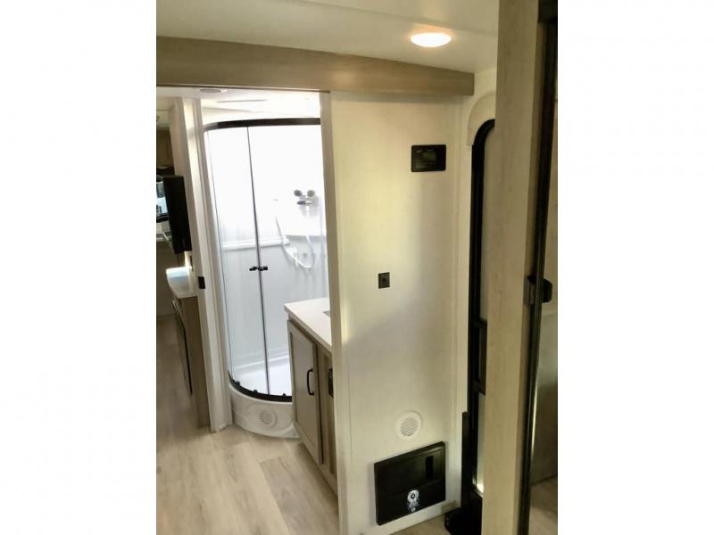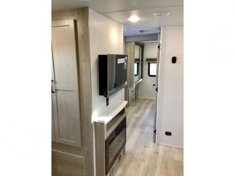 Escape the city life for weekend trips in this cozy couple's trailer. The dual entry doors will allow you to enter in through the rear private bedroom, or the front kitchen/main living area for convenience. You will enjoy relaxing on the theater seating across from the 32" TV and fireplace in the evenings, or you can visit outdoors under the 19' power awning. You'll also find an exterior griddle here for quick meals and exterior storage for the fishing poles or hiking gear. This model also includes a walk-through bath with a shower skylight, a linen closet, plus a Showermiser Water Saving System. And don't worry about storage space inside since this model includes an entryway pantry/closet, a second pantry in the front kitchen, plus a large bedroom wardrobe to keep your clothes wrinkle-free!
