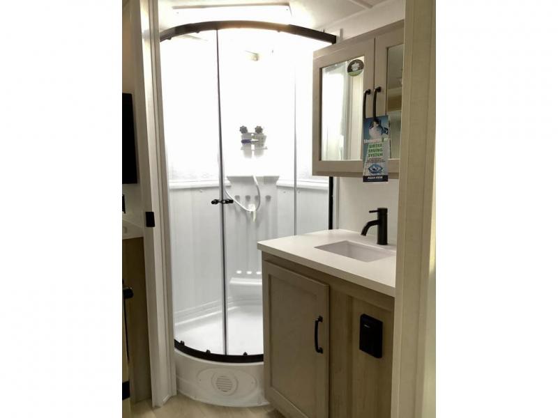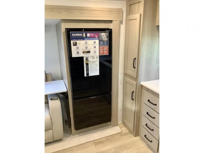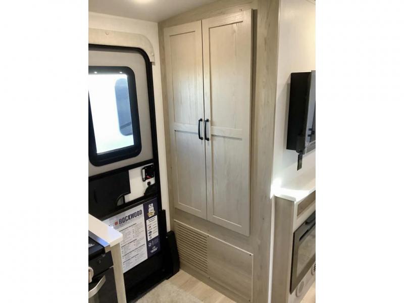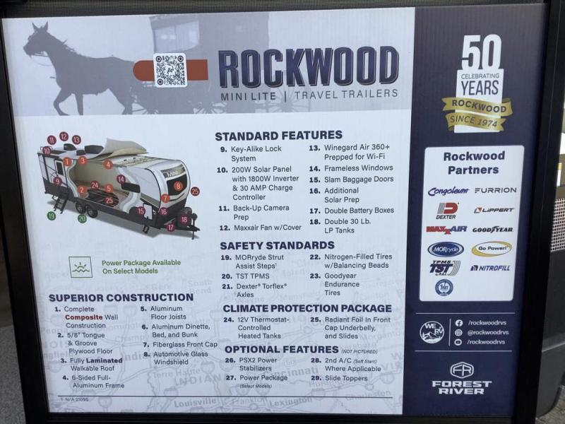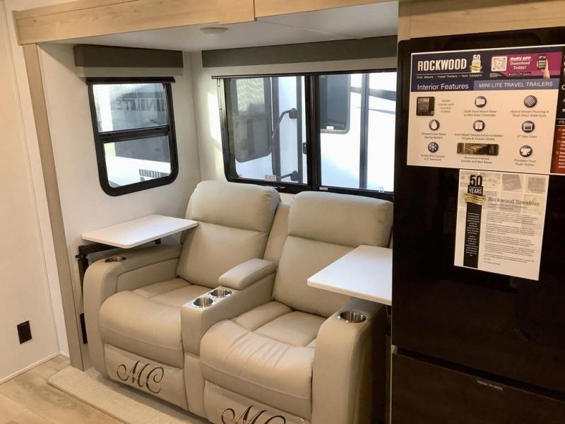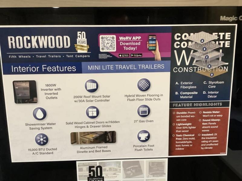 Each Rockwood Mini Lite travel trailer by Forest River is constructed with a fully laminated one-piece walkable roof, sleek frameless windows, and a six-sided full aluminum frame for strength and durability. The 12V thermostatically controlled heated tanks, plus radiant foil in the underbelly and slide out floors will allow you to camp well into the colder months, and the 200W roof solar panel will be perfect for a little off-gridding. Each model includes solid surface kitchen countertops, solid wood cabinet doors, night roller shades, plus many more interior features. Having an AIR 360+ omnidirectional antenna with WiFi prep on board gives you the option to get some work done if it's needed, and the power tongue jack provides hassle-free set up, so you can enjoy more time relaxing!