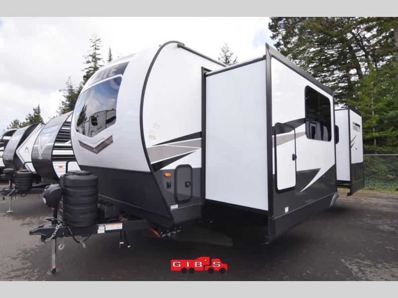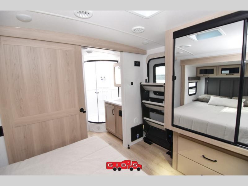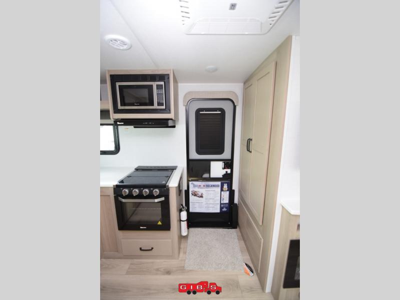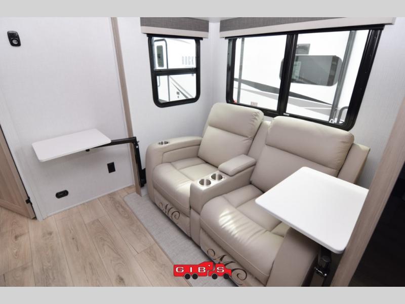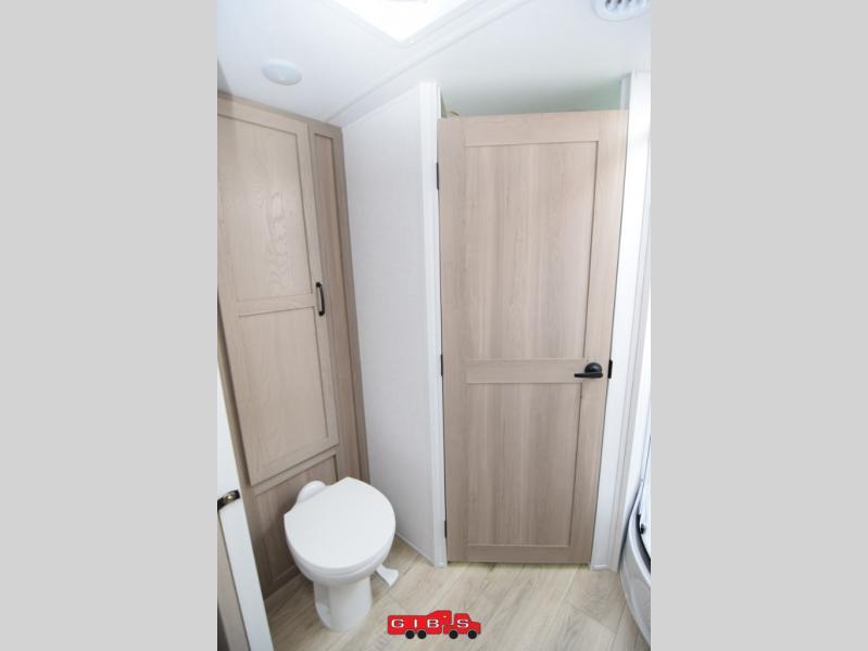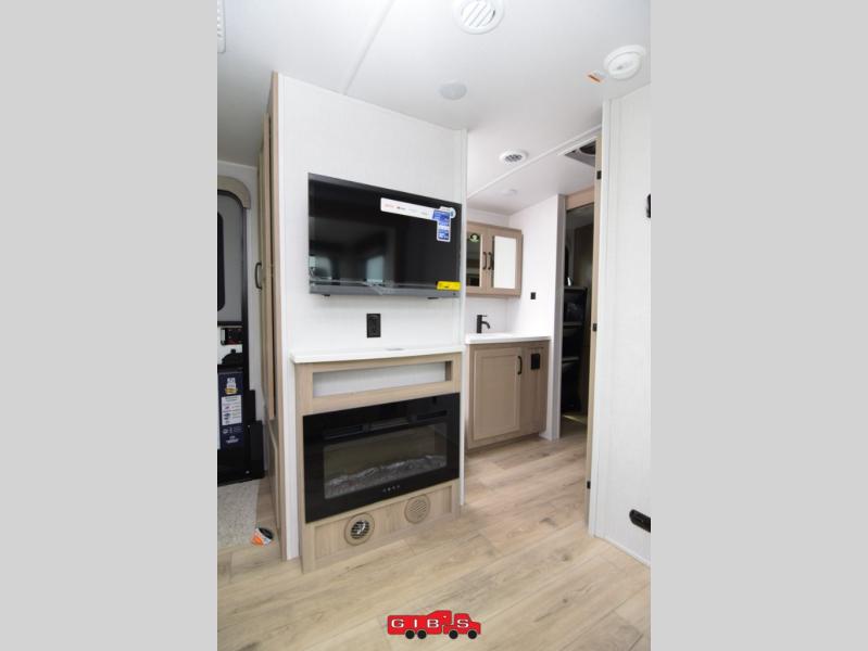 Escape the city life for weekend trips in this cozy couple's trailer. The dual entry doors will allow you to enter in through the rear private bedroom, or the front kitchen/main living area for convenience. You will enjoy relaxing on the theater seating across from the 32" TV and fireplace in the evenings, or you can visit outdoors under the 19' power awning. You'll also find an exterior griddle here for quick meals and exterior storage for the fishing poles or hiking gear. This model also includes a walk-through bath with a shower skylight, a linen closet, plus a Showermiser Water Saving System. And don't worry about storage space inside since this model includes an entryway pantry/closet, a second pantry in the front kitchen, plus a large bedroom wardrobe to keep your clothes wrinkle-free!