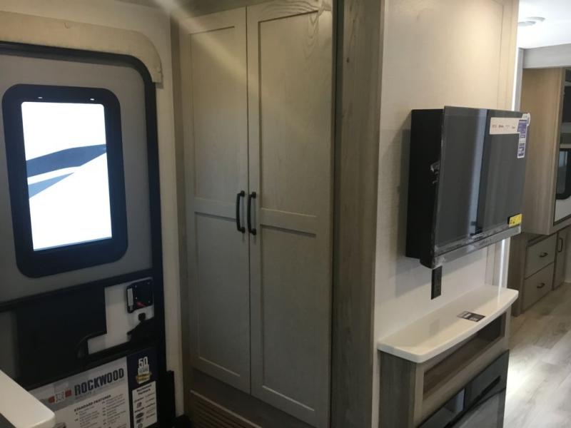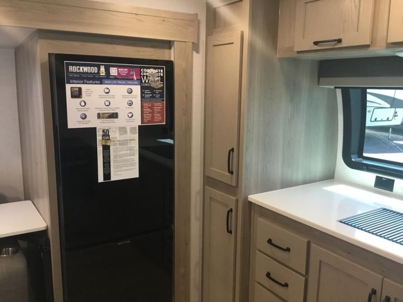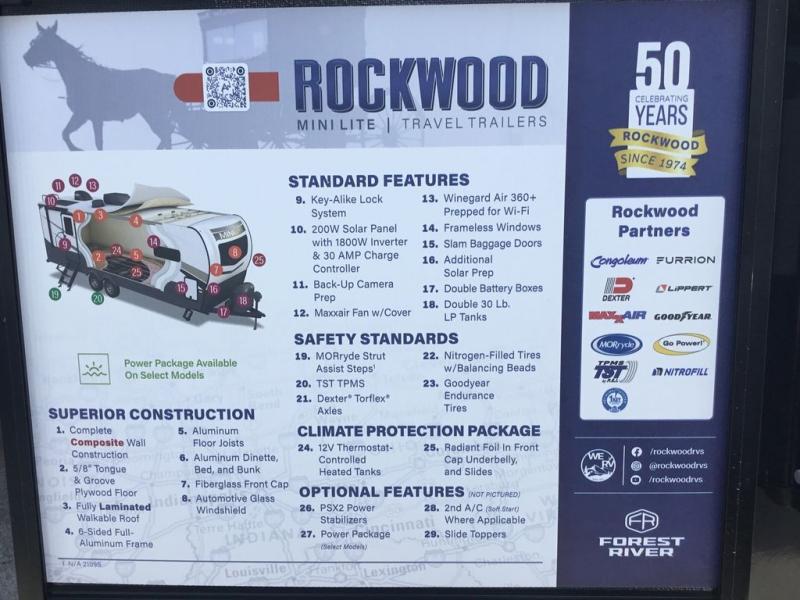 Each Rockwood Mini Lite travel trailer by Forest River is constructed with a fully laminated one-piece walkable roof, sleek frameless windows, and a six-sided full aluminum frame for strength and durability. The 12V thermostatically controlled heated tanks, plus radiant foil in the underbelly and slide out floors will allow you to camp well into the colder months, and the 200W roof solar panel will be perfect for a little off-gridding. Each model includes solid surface kitchen countertops, solid wood cabinet doors, night roller shades, plus many more interior features. Having an AIR 360+ omnidirectional antenna with WiFi prep on board gives you the option to get some work done if it's needed, and the power tongue jack provides hassle-free set up, so you can enjoy more time relaxing!