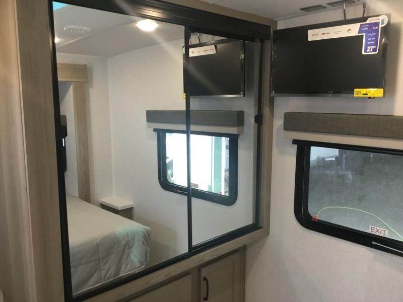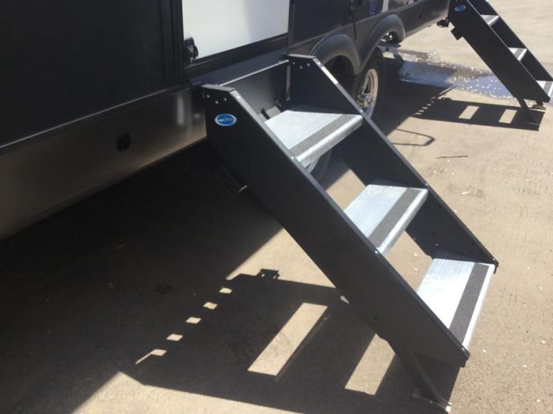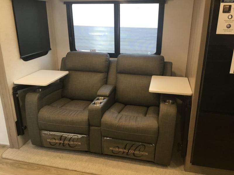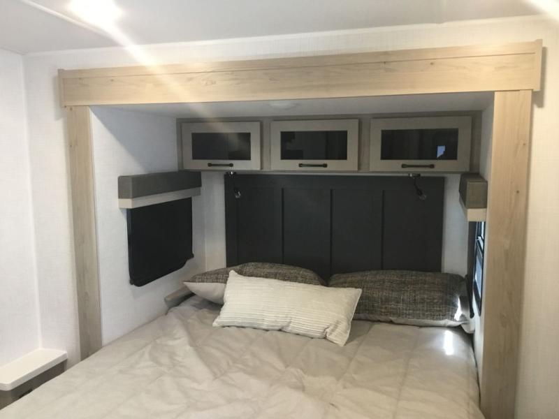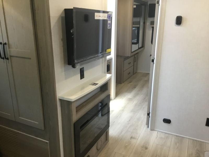 Escape the city life for weekend trips in this cozy couple's trailer. The dual entry doors will allow you to enter in through the rear private bedroom, or the front kitchen/main living area for convenience. You will enjoy relaxing on the theater seating across from the 32" TV and fireplace in the evenings, or you can visit outdoors under the 19' power awning. You'll also find an exterior griddle here for quick meals and exterior storage for the fishing poles or hiking gear. This model also includes a walk-through bath with a shower skylight, a linen closet, plus a Showermiser Water Saving System. And don't worry about storage space inside since this model includes an entryway pantry/closet, a second pantry in the front kitchen, plus a large bedroom wardrobe to keep your clothes wrinkle-free!