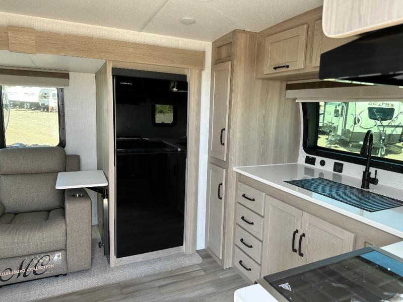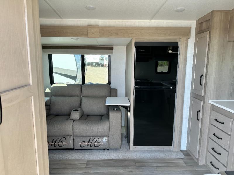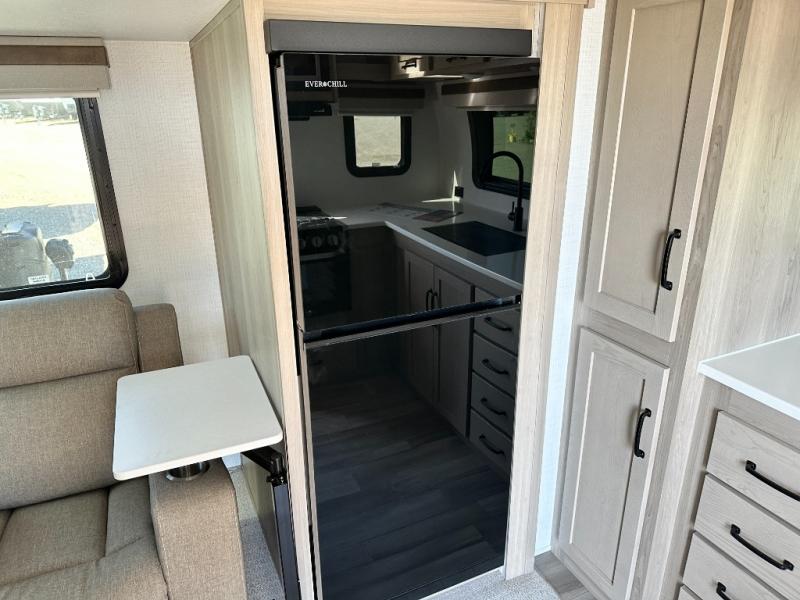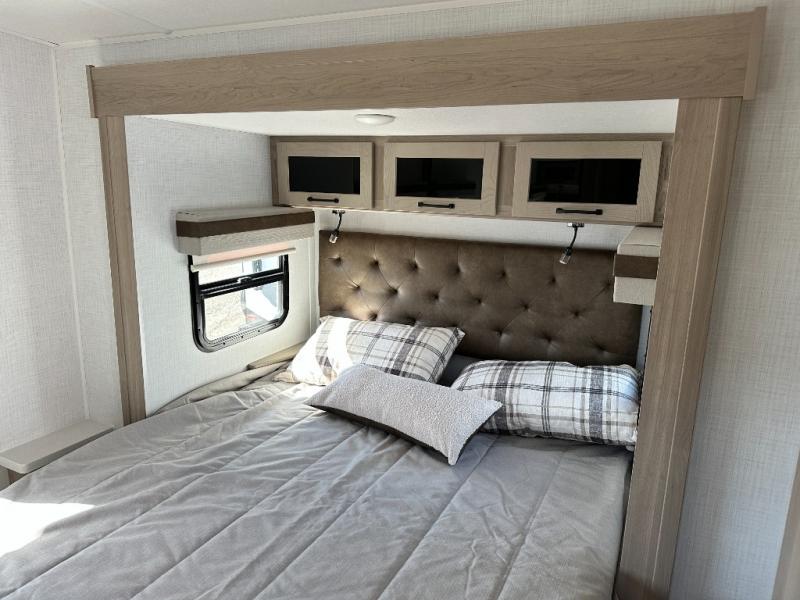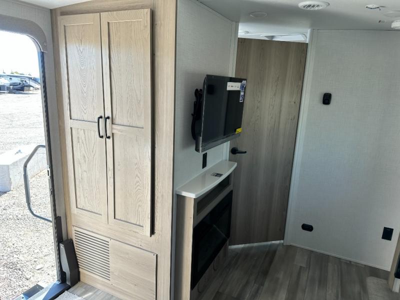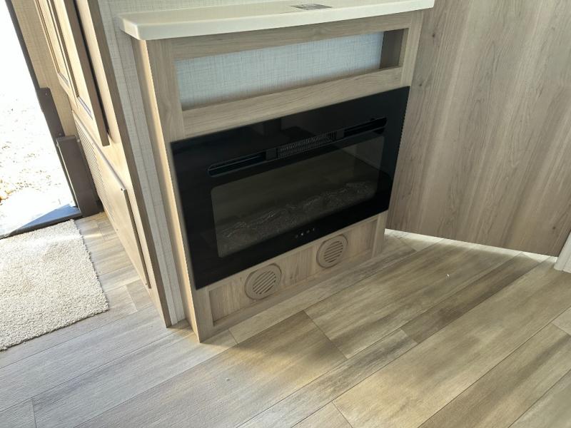 Escape the city life for weekend trips in this cozy couple's trailer. The dual entry doors will allow you to enter in through the rear private bedroom, or the front kitchen/main living area for convenience. You will enjoy relaxing on the theater seating across from the 32" TV and fireplace in the evenings, or you can visit outdoors under the 19' power awning. You'll also find an exterior griddle here for quick meals and exterior storage for the fishing poles or hiking gear. This model also includes a walk-through bath with a shower skylight, a linen closet, plus a Showermiser Water Saving System. And don't worry about storage space inside since this model includes an entryway pantry/closet, a second pantry in the front kitchen, plus a large bedroom wardrobe to keep your clothes wrinkle-free!