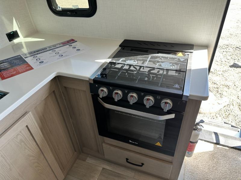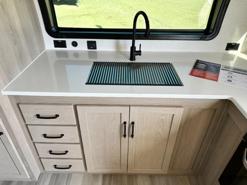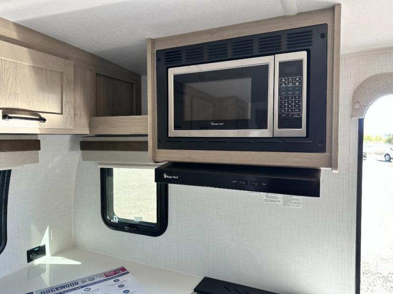 Each Rockwood Mini Lite travel trailer by Forest River is constructed with a fully laminated one-piece walkable roof, sleek frameless windows, and a six-sided full aluminum frame for strength and durability. The 12V thermostatically controlled heated tanks, plus radiant foil in the underbelly and slide out floors will allow you to camp well into the colder months, and the 200W roof solar panel will be perfect for a little off-gridding. Each model includes solid surface kitchen countertops, solid wood cabinet doors, night roller shades, plus many more interior features. Having an AIR 360+ omnidirectional antenna with WiFi prep on board gives you the option to get some work done if it's needed, and the power tongue jack provides hassle-free set up, so you can enjoy more time relaxing!