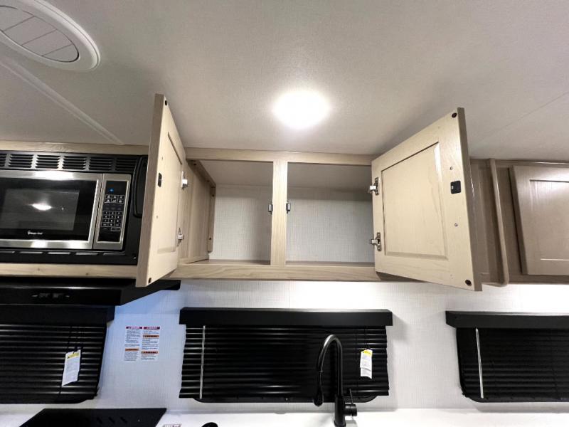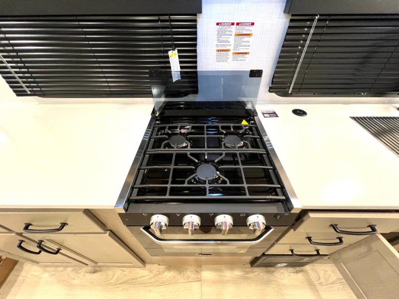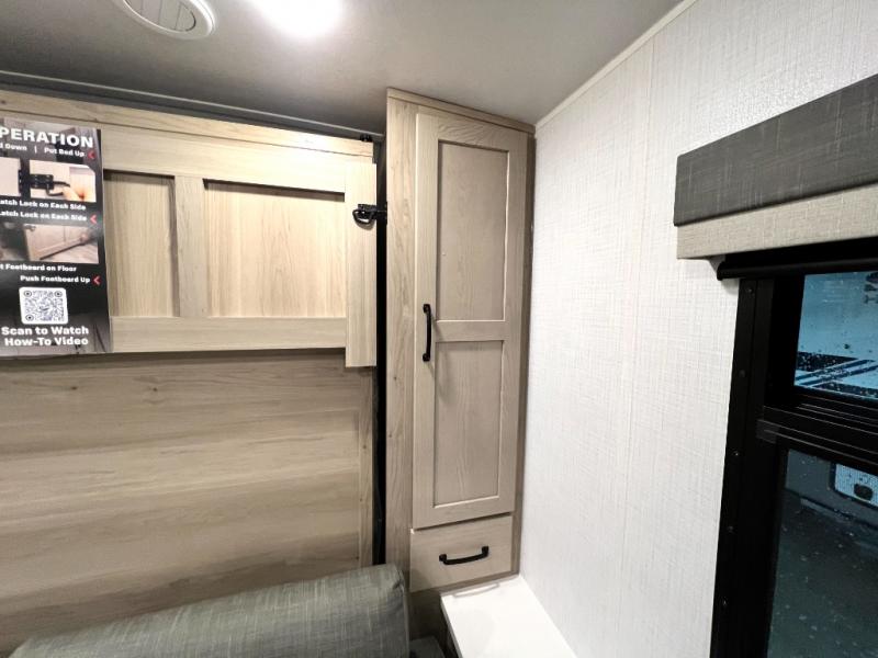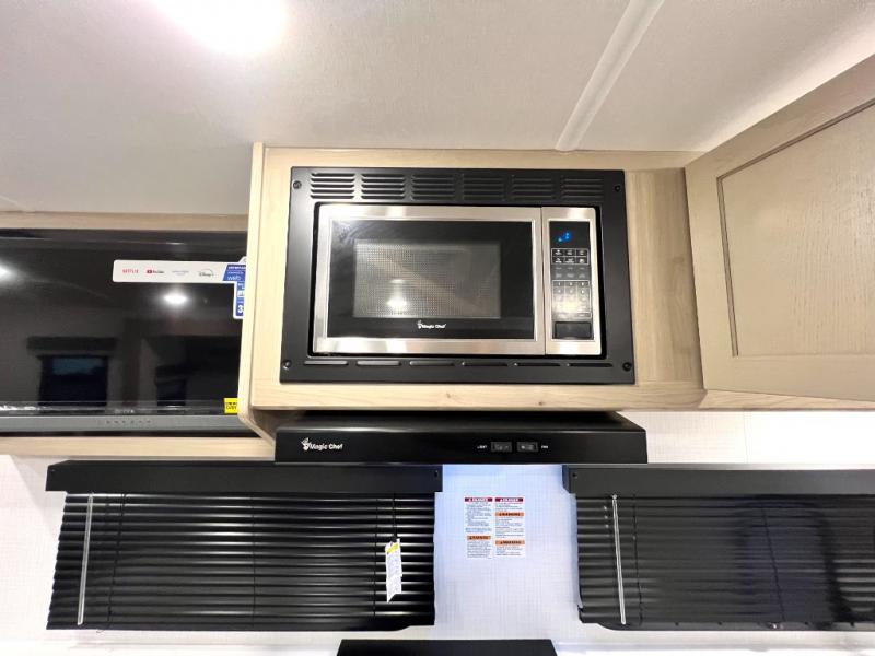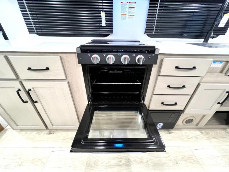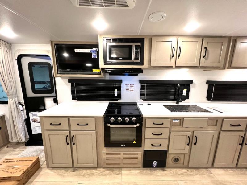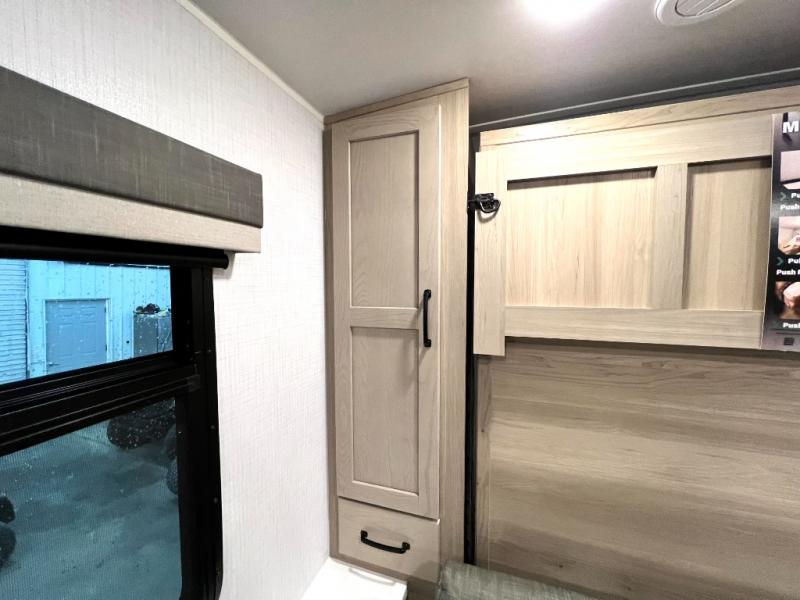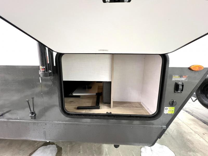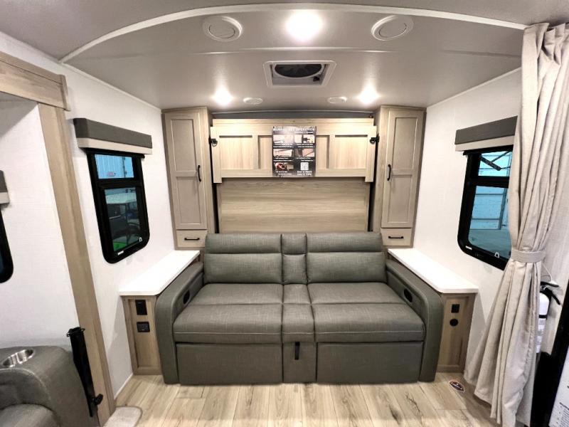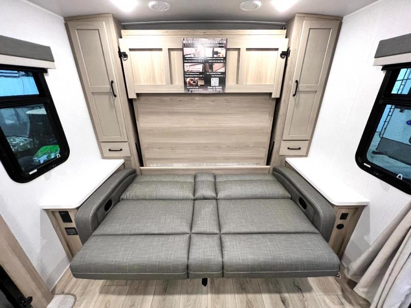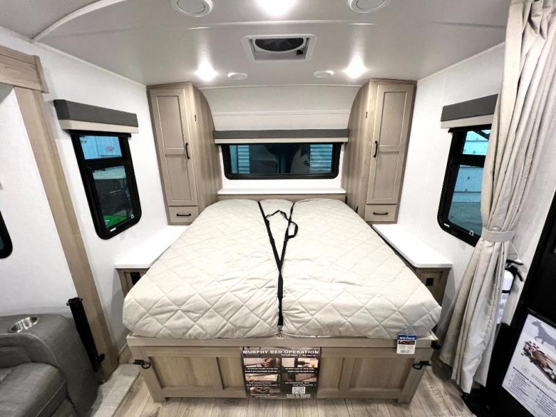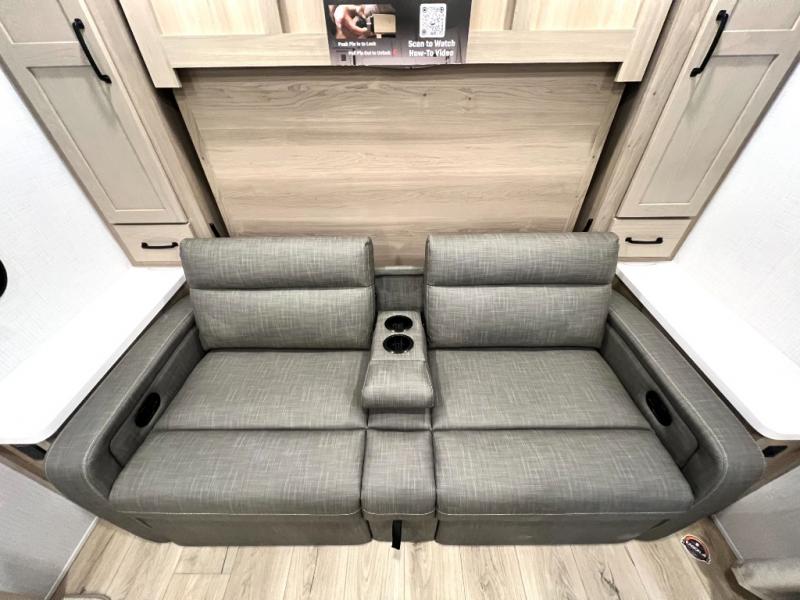 This is the perfect travel trailer for two or four people looking for comfortable and versatile camping trips! You will have your own Murphy bed to sleep on in the front at night, and during the daytime you can fold it up and have a 74" sofa in its place. No need to even make the bed! Breakfast can be made on the three burner cooktop inside, or head outdoors to cook on the outside griddle and pull-out stove under the 18' awning. The U-dinette offers ample room for everyone to gather for a meal or games, and can be transformed into sleeping space as well. This space could also feature an optional theater seat with a table or a hide-a-bed with table if you would prefer to replace the dinette. The kitchen features a refrigerator within the large slide as well as a microwave above the stove, plenty of counter space and overhead cabinets. On the exterior, you will find two storage compartments and a rear ladder for your convenience, plus more.