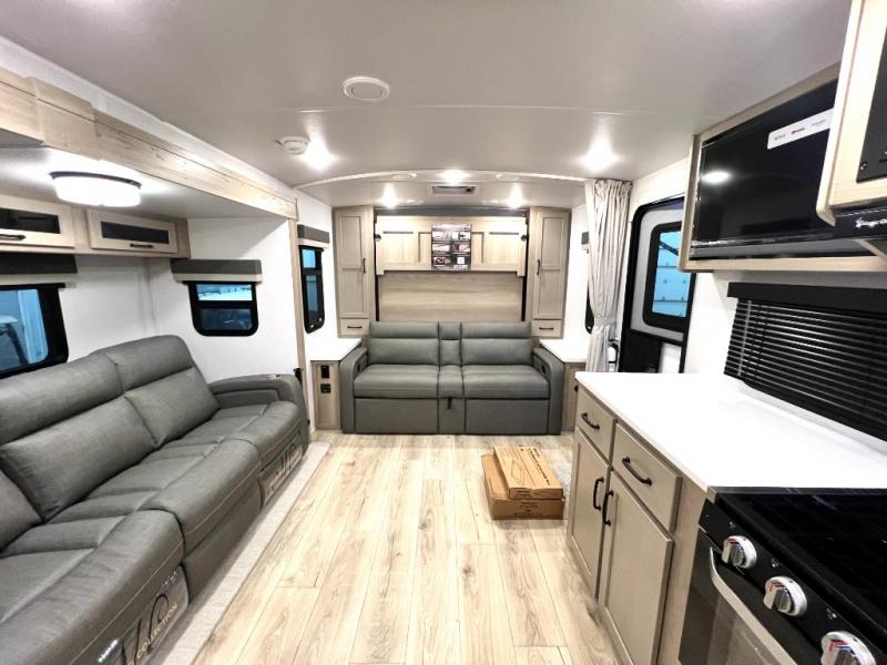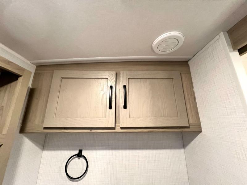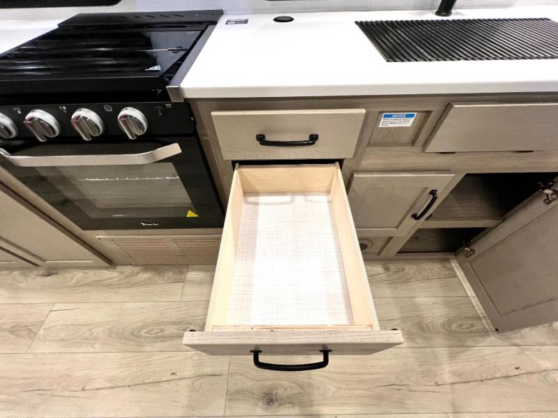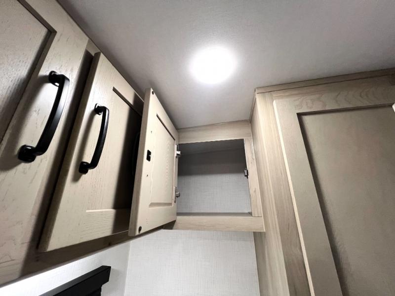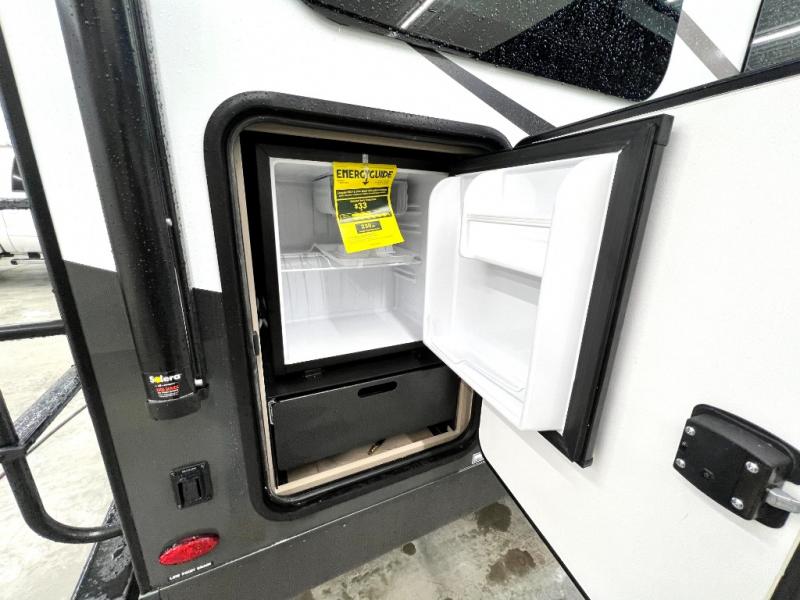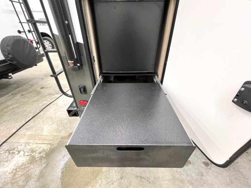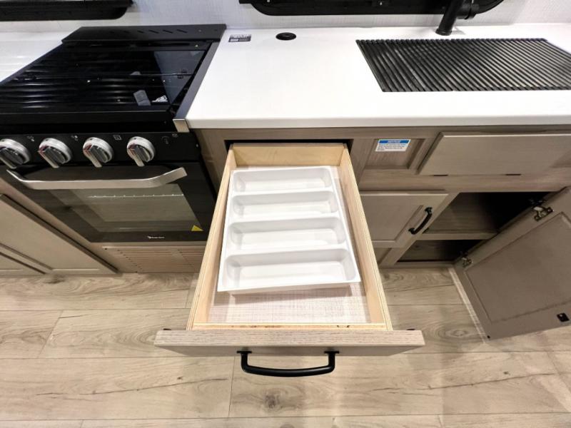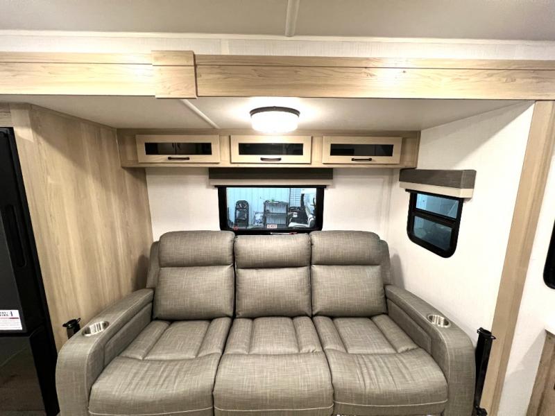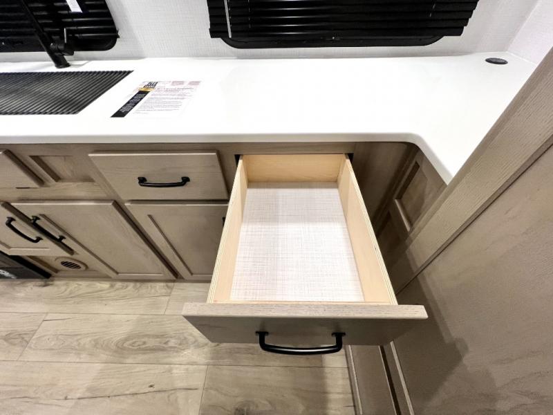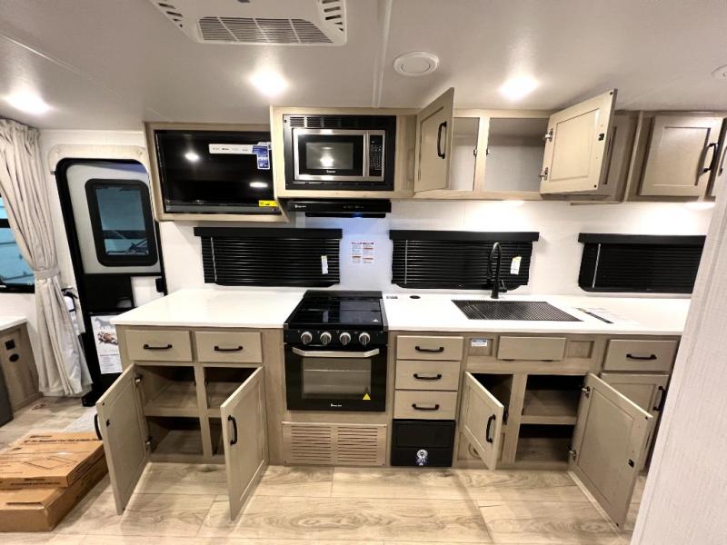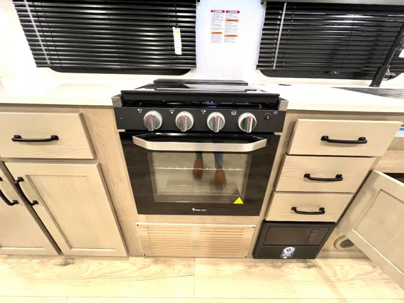 This is the perfect travel trailer for two or four people looking for comfortable and versatile camping trips! You will have your own Murphy bed to sleep on in the front at night, and during the daytime you can fold it up and have a 74" sofa in its place. No need to even make the bed! Breakfast can be made on the three burner cooktop inside, or head outdoors to cook on the outside griddle and pull-out stove under the 18' awning. The U-dinette offers ample room for everyone to gather for a meal or games, and can be transformed into sleeping space as well. This space could also feature an optional theater seat with a table or a hide-a-bed with table if you would prefer to replace the dinette. The kitchen features a refrigerator within the large slide as well as a microwave above the stove, plenty of counter space and overhead cabinets. On the exterior, you will find two storage compartments and a rear ladder for your convenience, plus more.