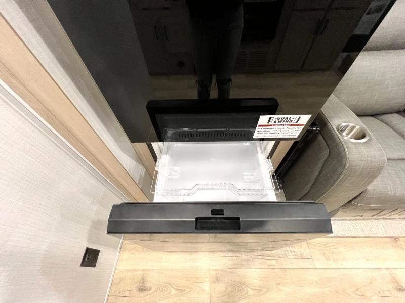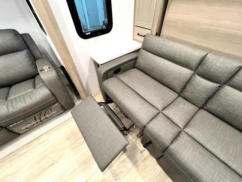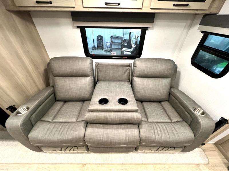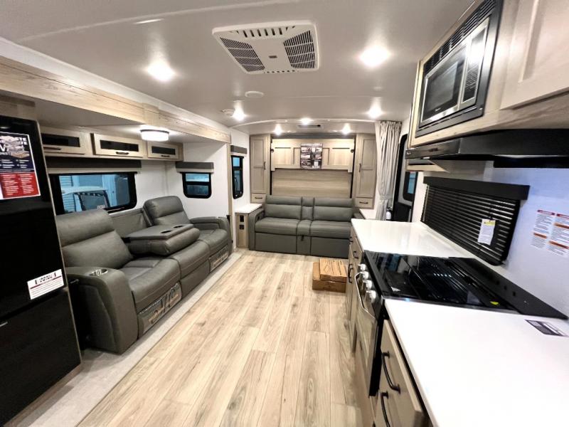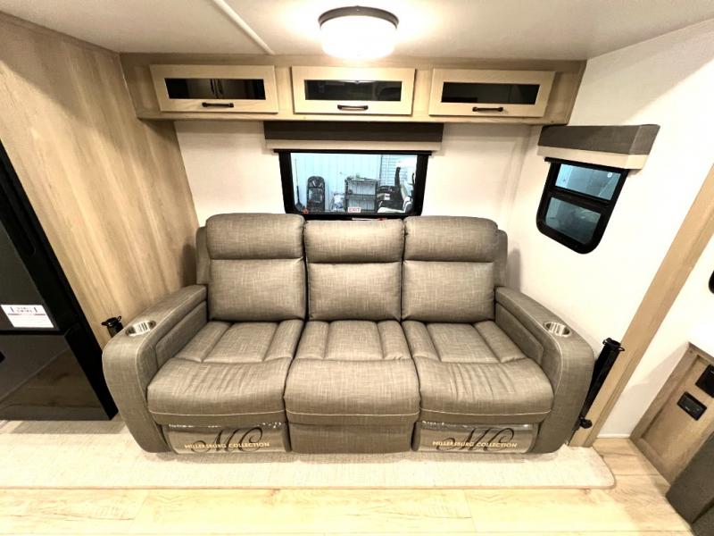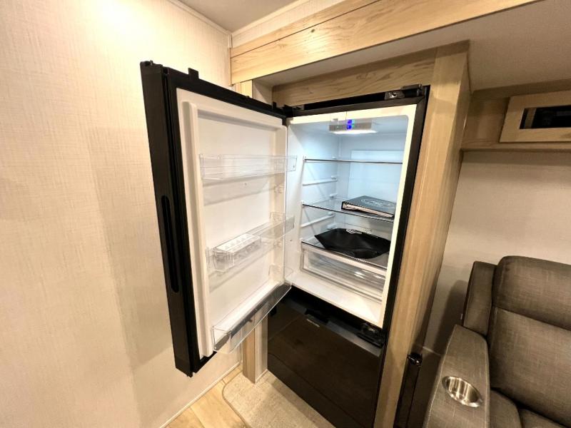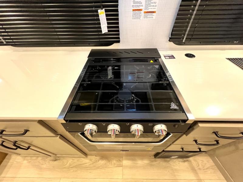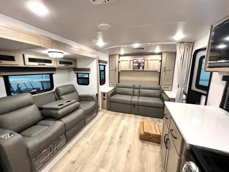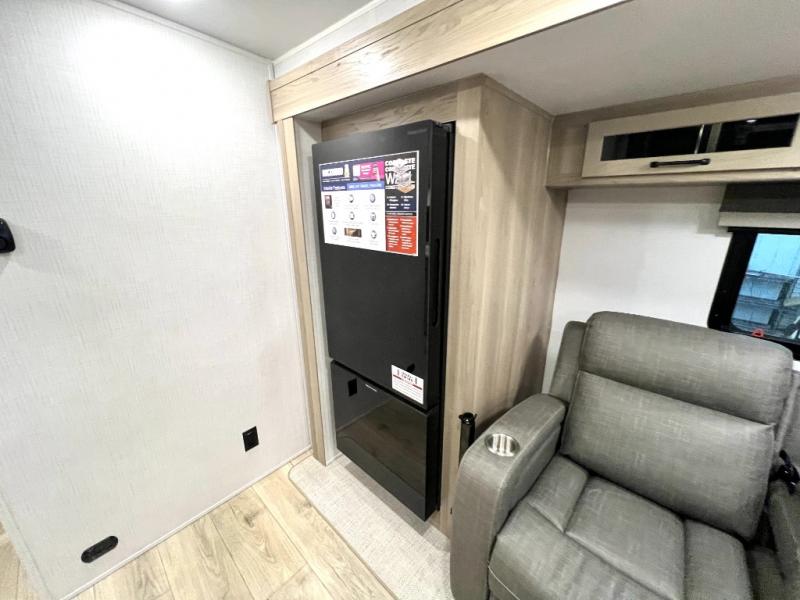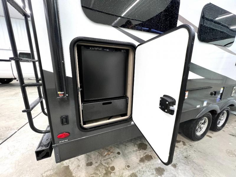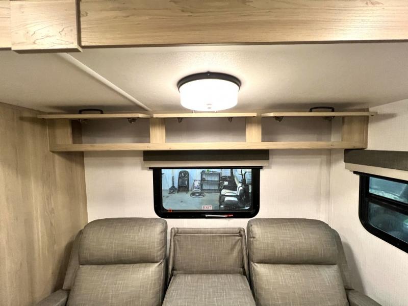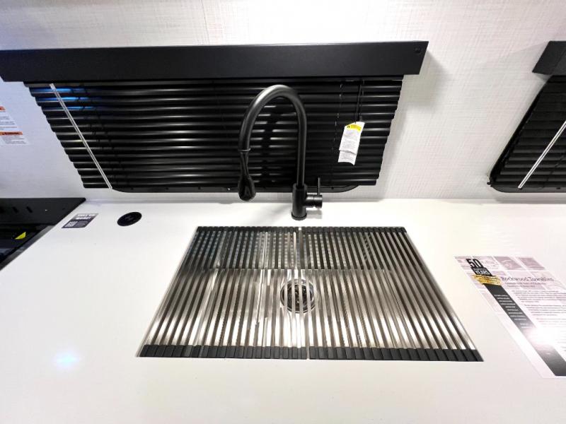 This is the perfect travel trailer for two or four people looking for comfortable and versatile camping trips! You will have your own Murphy bed to sleep on in the front at night, and during the daytime you can fold it up and have a 74" sofa in its place. No need to even make the bed! Breakfast can be made on the three burner cooktop inside, or head outdoors to cook on the outside griddle and pull-out stove under the 18' awning. The U-dinette offers ample room for everyone to gather for a meal or games, and can be transformed into sleeping space as well. This space could also feature an optional theater seat with a table or a hide-a-bed with table if you would prefer to replace the dinette. The kitchen features a refrigerator within the large slide as well as a microwave above the stove, plenty of counter space and overhead cabinets. On the exterior, you will find two storage compartments and a rear ladder for your convenience, plus more.