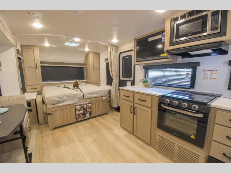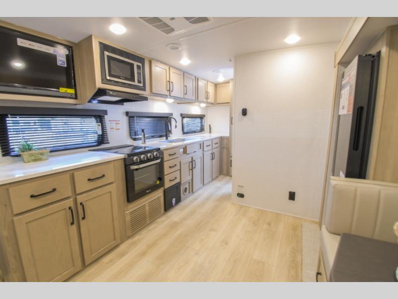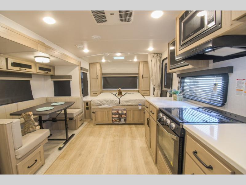 This is the perfect travel trailer for two or four people looking for comfortable and versatile camping trips! You will have your own Murphy bed to sleep on in the front at night, and during the daytime you can fold it up and have a 74" sofa in its place. No need to even make the bed! Breakfast can be made on the three burner cooktop inside, or head outdoors to cook on the outside griddle and pull-out stove under the 18' awning. The U-dinette offers ample room for everyone to gather for a meal or games, and can be transformed into sleeping space as well. This space could also feature an optional theater seat with a table or a hide-a-bed with table if you would prefer to replace the dinette. The kitchen features a refrigerator within the large slide as well as a microwave above the stove, plenty of counter space and overhead cabinets. On the exterior, you will find two storage compartments and a rear ladder for your convenience, plus more.