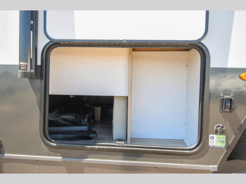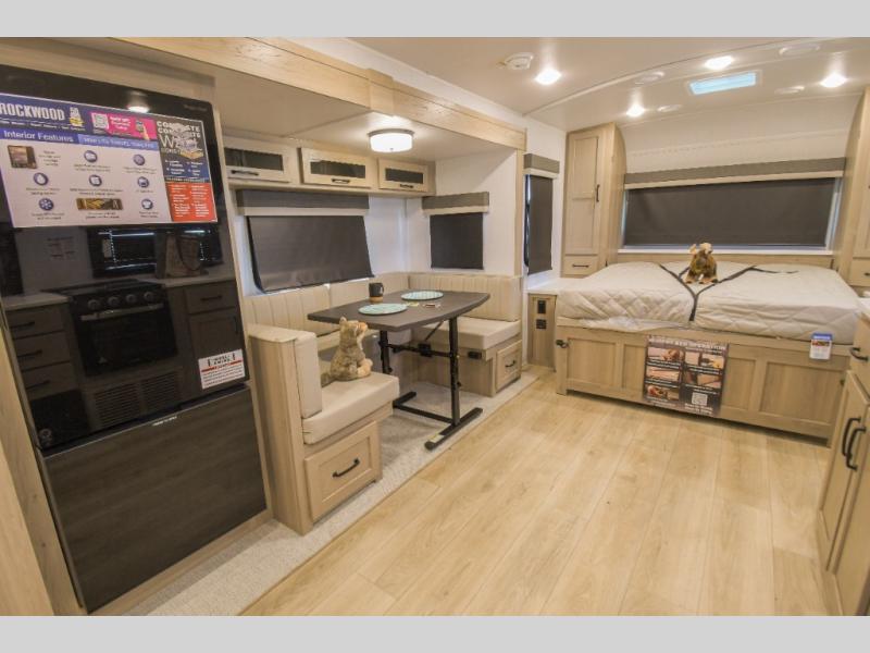 Each Rockwood Mini Lite travel trailer by Forest River is constructed with a fully laminated one-piece walkable roof, sleek frameless windows, and a six-sided full aluminum frame for strength and durability. The 12V thermostatically controlled heated tanks, plus radiant foil in the underbelly and slide out floors will allow you to camp well into the colder months, and the 200W roof solar panel will be perfect for a little off-gridding. Each model includes solid surface kitchen countertops, solid wood cabinet doors, night roller shades, plus many more interior features. Having an AIR 360+ omnidirectional antenna with WiFi prep on board gives you the option to get some work done if it's needed, and the power tongue jack provides hassle-free set up, so you can enjoy more time relaxing!