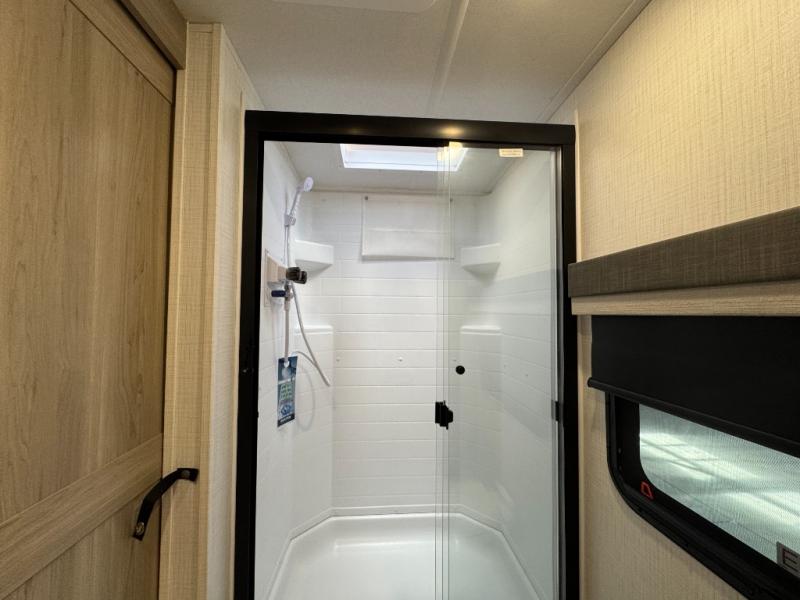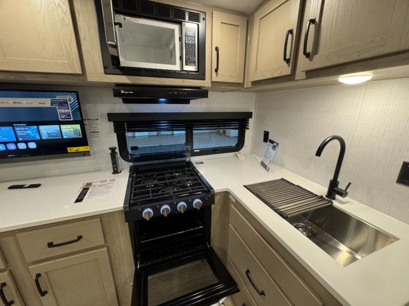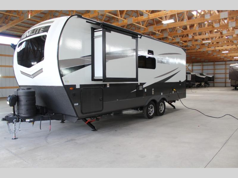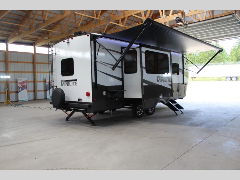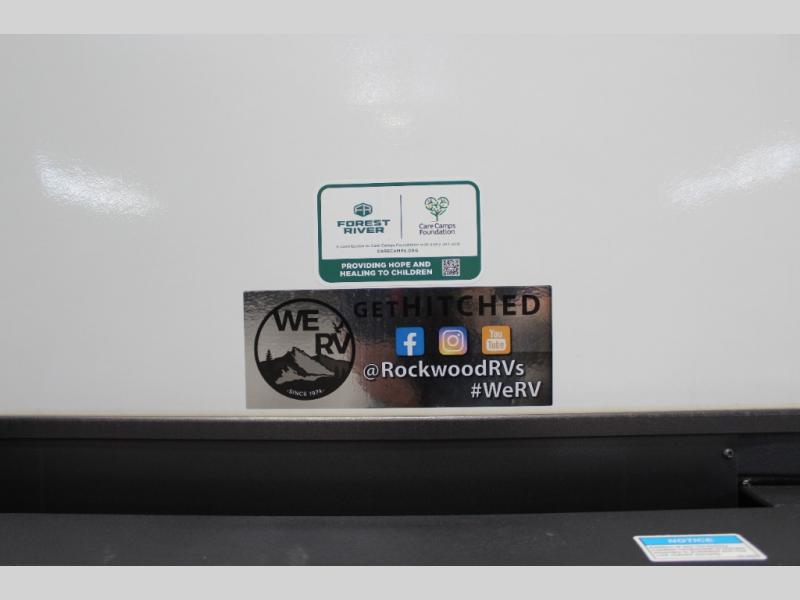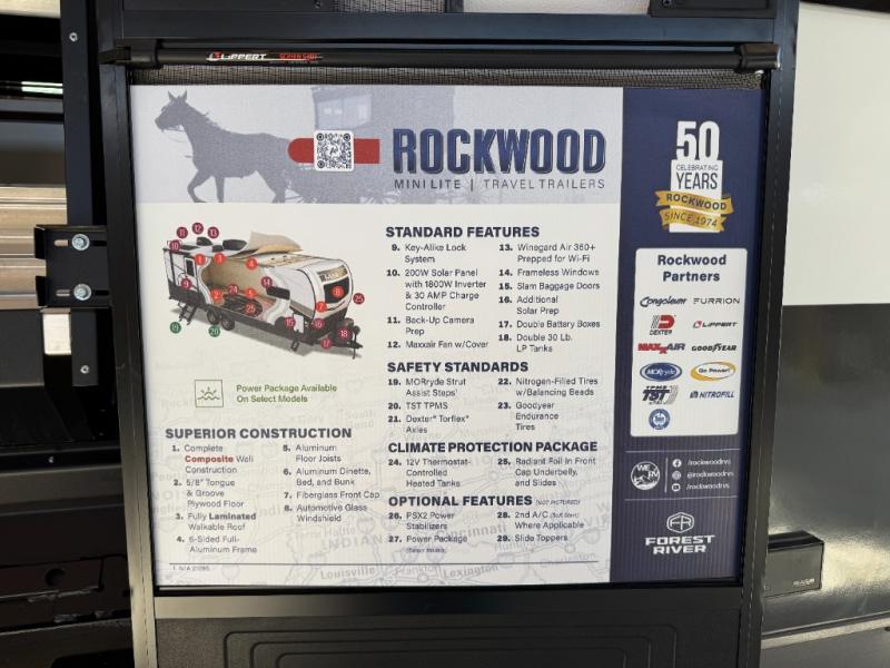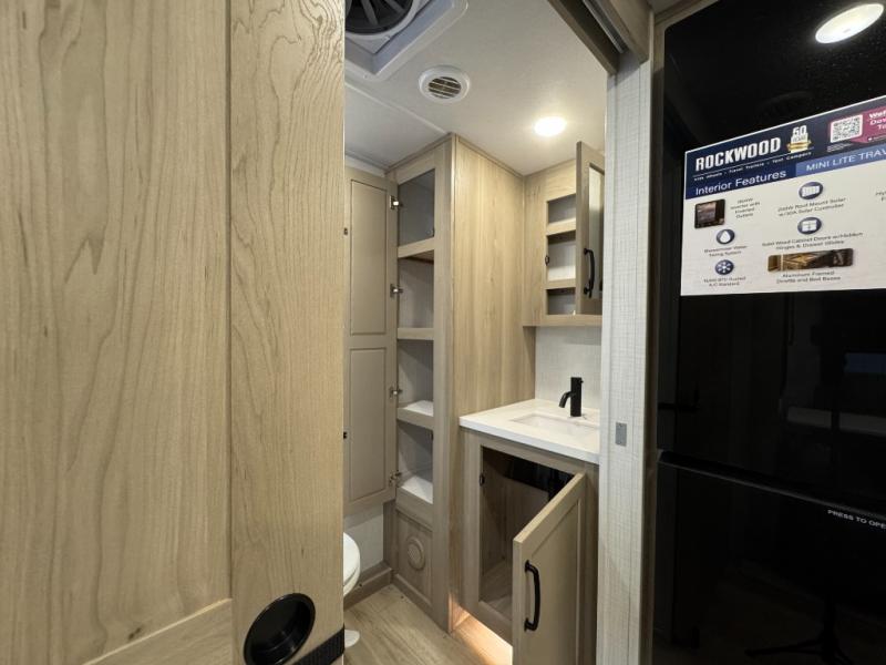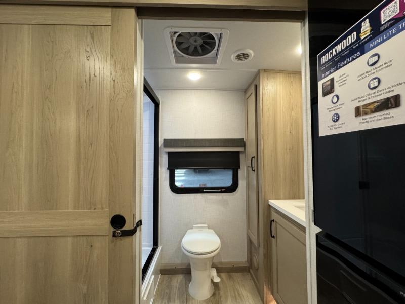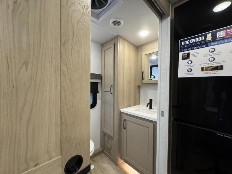 Each Rockwood Mini Lite travel trailer by Forest River is constructed with a fully laminated one-piece walkable roof, sleek frameless windows, and a six-sided full aluminum frame for strength and durability. The 12V thermostatically controlled heated tanks, plus radiant foil in the underbelly and slide out floors will allow you to camp well into the colder months, and the 200W roof solar panel will be perfect for a little off-gridding. Each model includes solid surface kitchen countertops, solid wood cabinet doors, night roller shades, plus many more interior features. Having an AIR 360+ omnidirectional antenna with WiFi prep on board gives you the option to get some work done if it's needed, and the power tongue jack provides hassle-free set up, so you can enjoy more time relaxing!