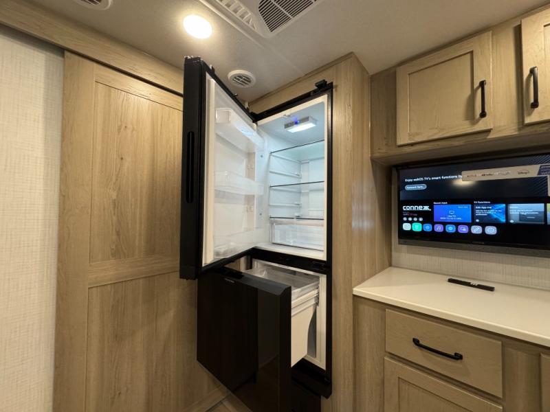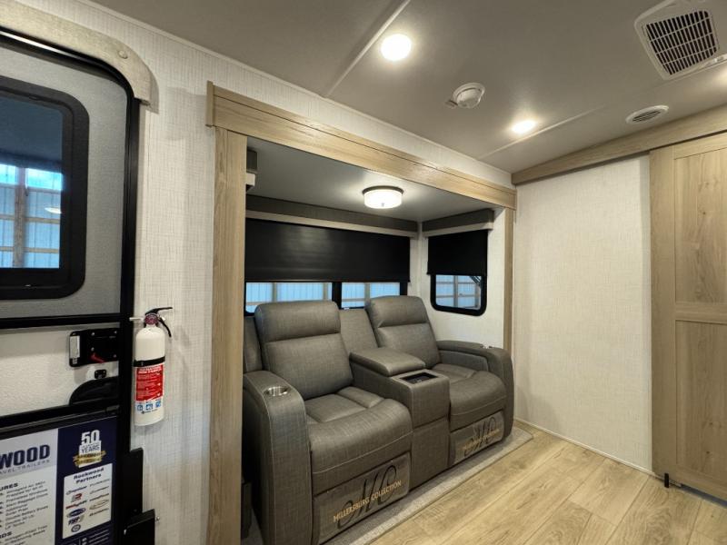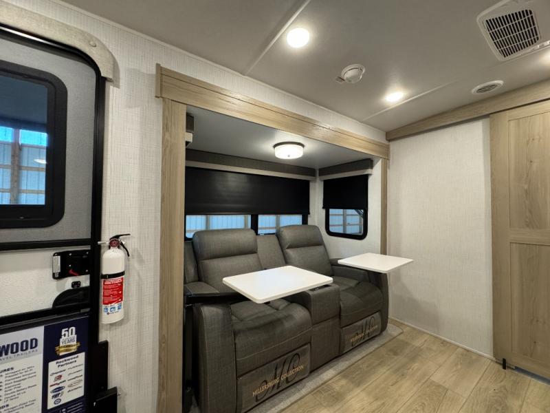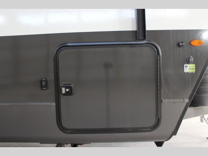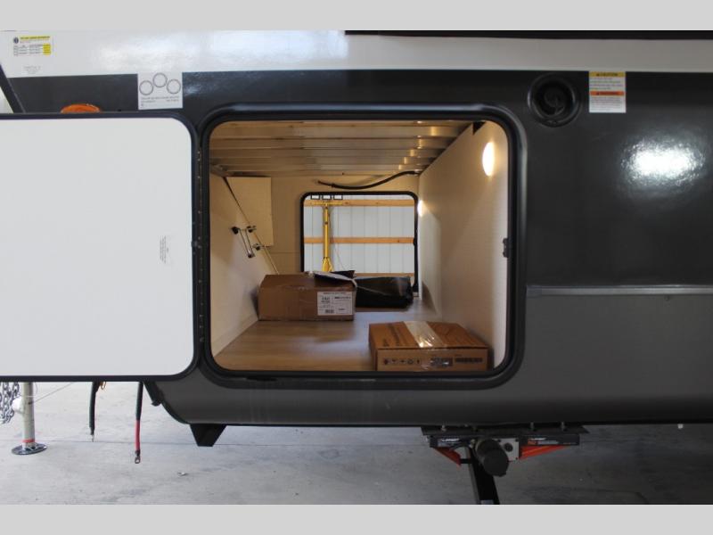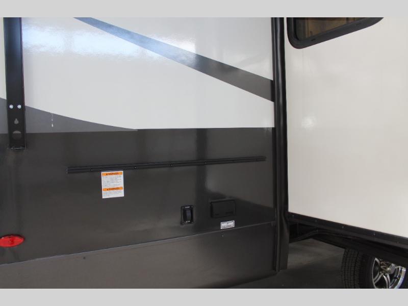 Pick your favorite campground to take this travel trailer to! Once you arrive, unload your gear from the exterior drop-frame pass-through storage, then start lunch on either the exterior griddle or the three burner cooktop inside. If you need a rest after traveling all day, the RV queen bed with flip-up storage in the front bedroom is sure to give you comfort, or you can relax on the 67" theater seating. The entertainment center will make this space feel just like home, and check out the spacious full rear bath for added privacy. This model also includes a 20' power awning to relax underneath rain or shine!