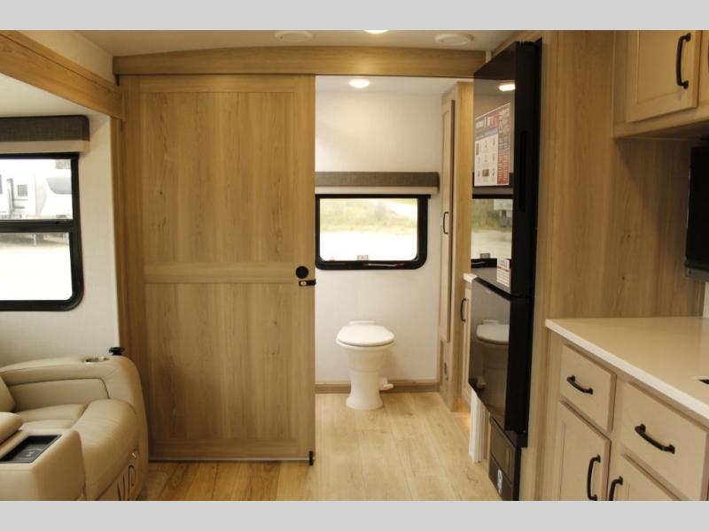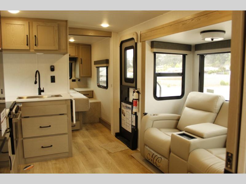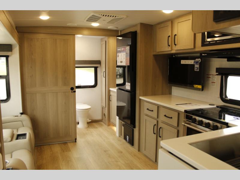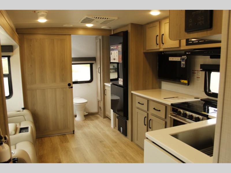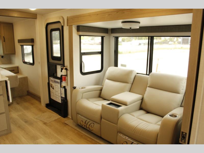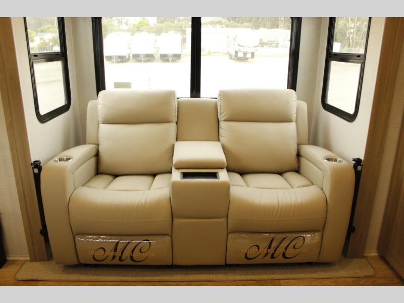 Pick your favorite campground to take this travel trailer to! Once you arrive, unload your gear from the exterior drop-frame pass-through storage, then start lunch on either the exterior griddle or the three burner cooktop inside. If you need a rest after traveling all day, the RV queen bed with flip-up storage in the front bedroom is sure to give you comfort, or you can relax on the 67" theater seating. The entertainment center will make this space feel just like home, and check out the spacious full rear bath for added privacy. This model also includes a 20' power awning to relax underneath rain or shine!