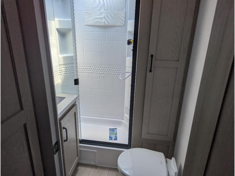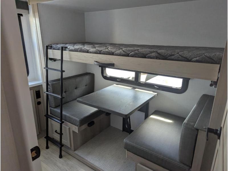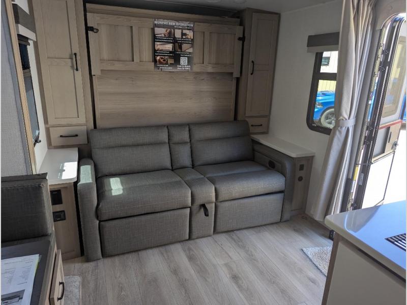 This trailer is one the whole crew will love! Start unloading the pass-thru storage when you arrive at your campsite, then put out the 18' power awning and start lunch on the exterior griddle. There is a full bath inside when you need to freshen up, and the fully-equipped interior kitchen can be used if the weather isn't cooperating with your plans. A U-shaped dinette slide provides a place to dine together and play board games, and two guests can sleep here at night. Speaking of nighttime, there is also a private bunkhouse in the back with a Dream Dinette and flip-up bunk plus a slide out for more space and an optional TV. You'll find your own space up front on the RV queen Murphy bed, complete with dual wardrobes and a privacy curtain when you need to get dressed. And in the morning you can fold away the bed to relax on the 74" sofa!