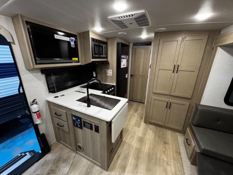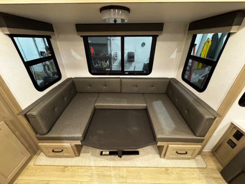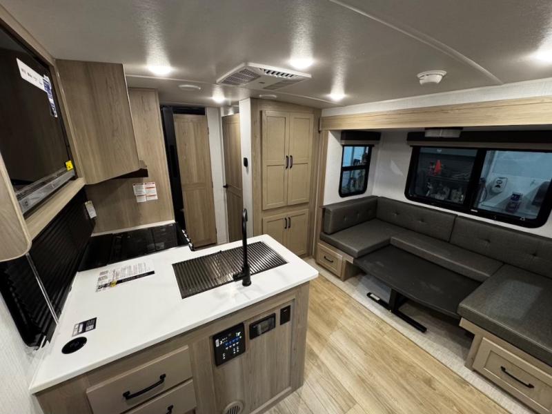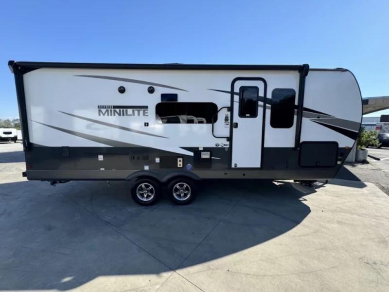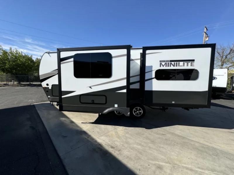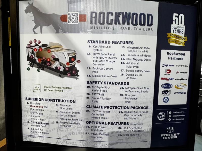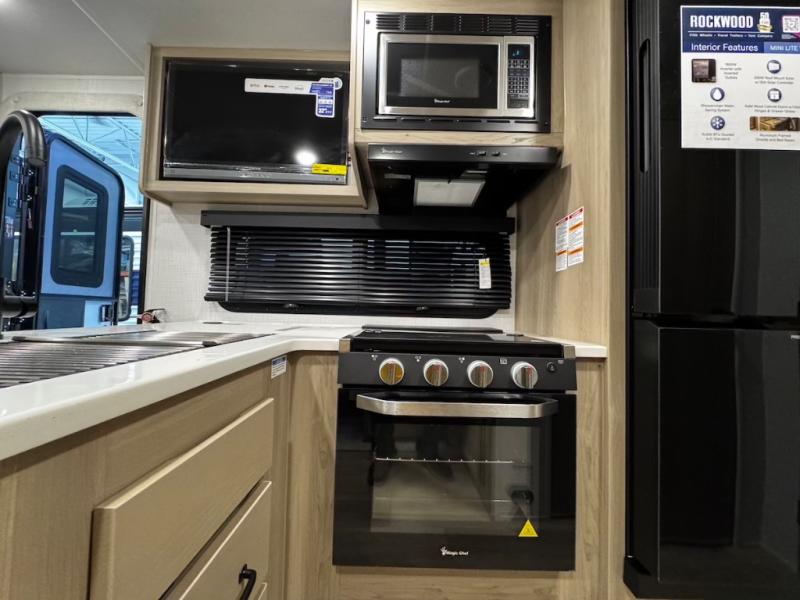 Each Rockwood Mini Lite travel trailer by Forest River is constructed with a fully laminated one-piece walkable roof, sleek frameless windows, and a six-sided full aluminum frame for strength and durability. The 12V thermostatically controlled heated tanks, plus radiant foil in the underbelly and slide out floors will allow you to camp well into the colder months, and the 200W roof solar panel will be perfect for a little off-gridding. Each model includes solid surface kitchen countertops, solid wood cabinet doors, night roller shades, plus many more interior features. Having an AIR 360+ omnidirectional antenna with WiFi prep on board gives you the option to get some work done if it's needed, and the power tongue jack provides hassle-free set up, so you can enjoy more time relaxing!