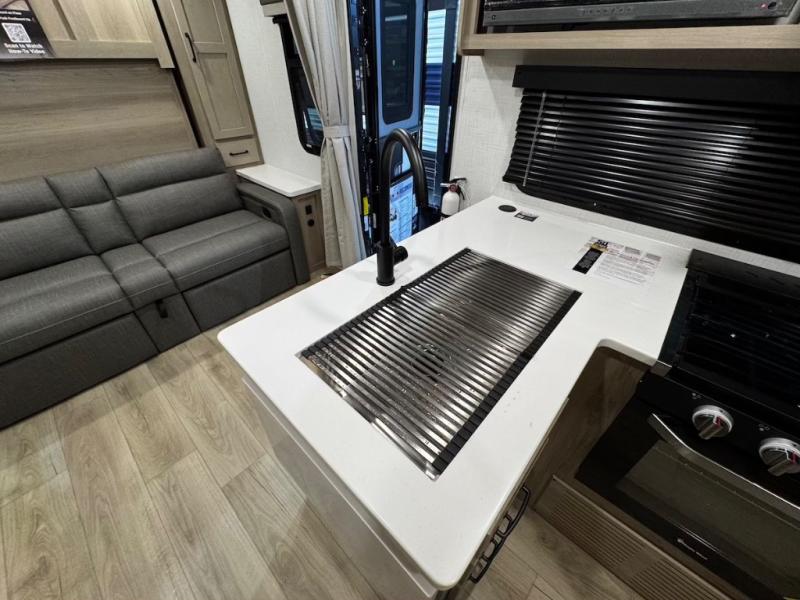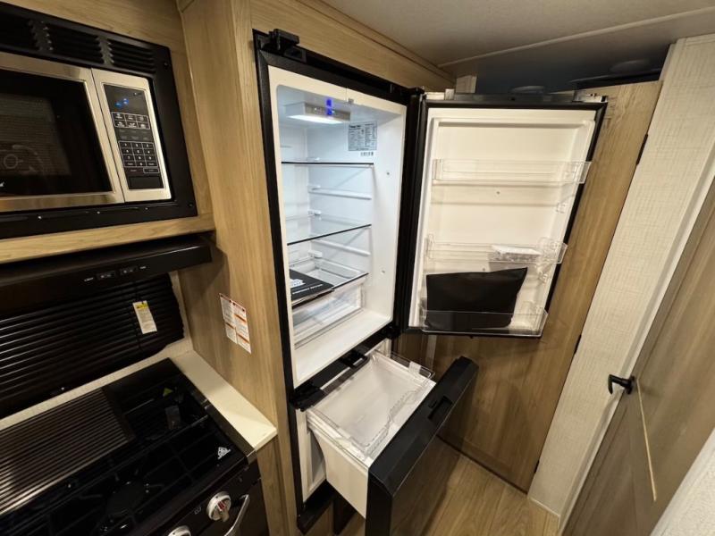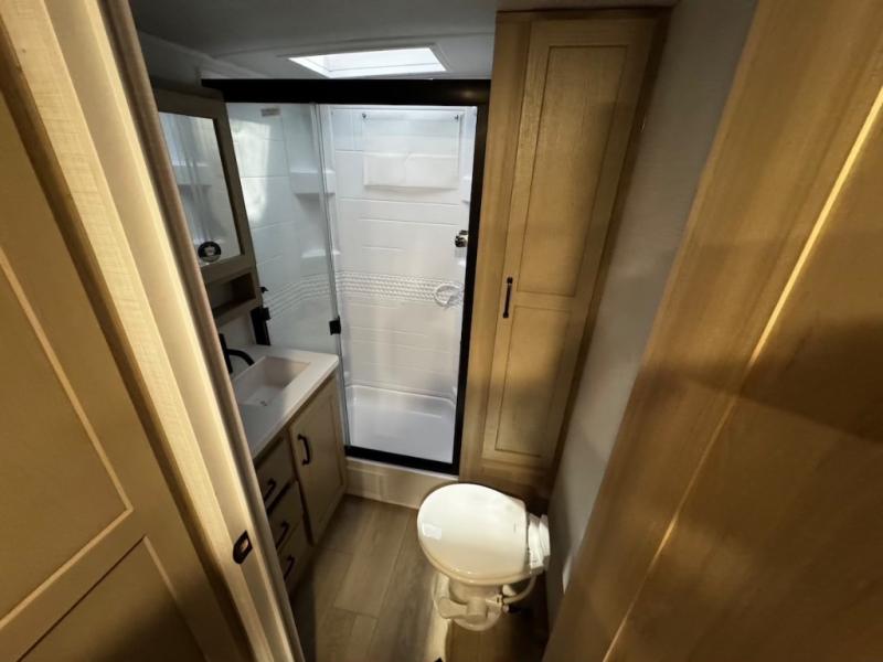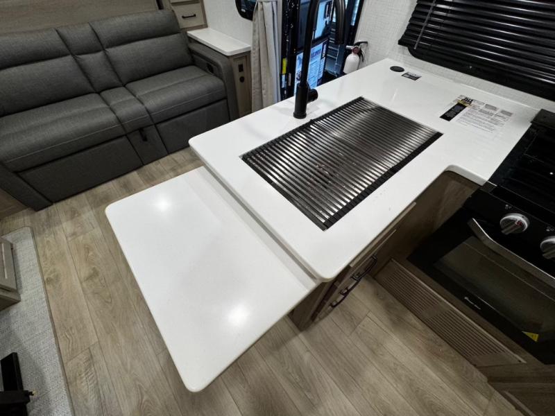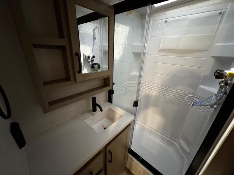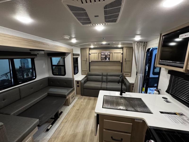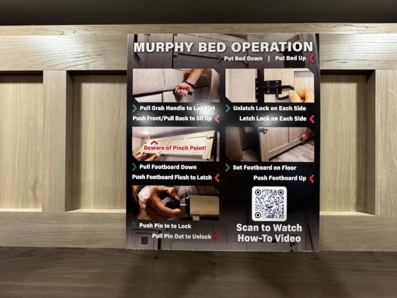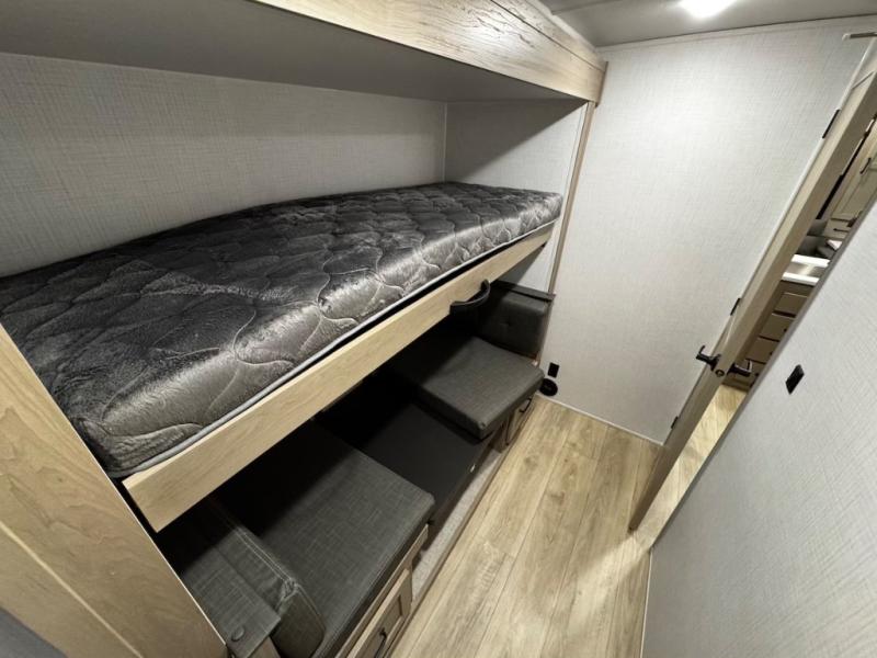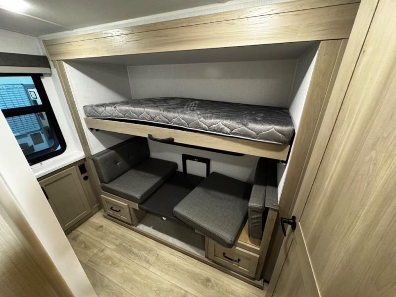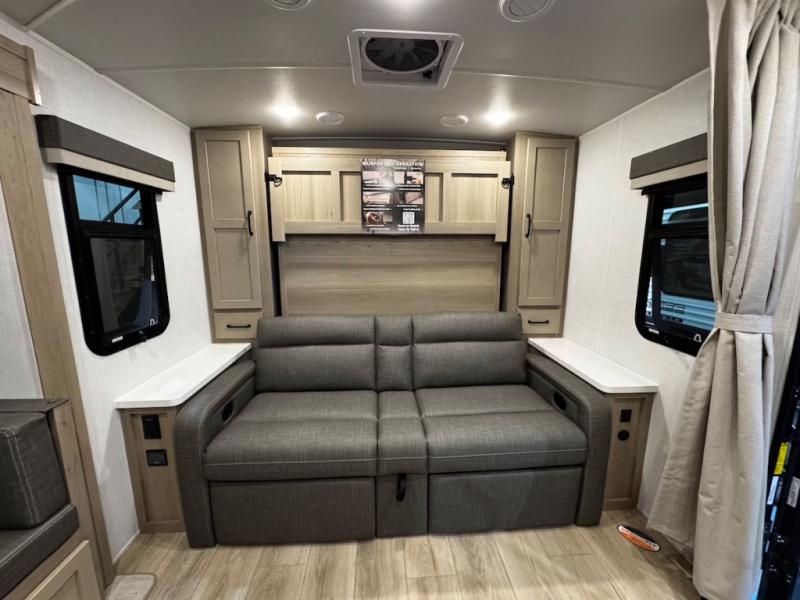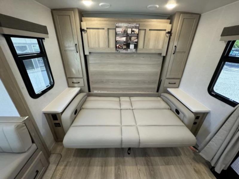 This trailer is one the whole crew will love! Start unloading the pass-thru storage when you arrive at your campsite, then put out the 18' power awning and start lunch on the exterior griddle. There is a full bath inside when you need to freshen up, and the fully-equipped interior kitchen can be used if the weather isn't cooperating with your plans. A U-shaped dinette slide provides a place to dine together and play board games, and two guests can sleep here at night. Speaking of nighttime, there is also a private bunkhouse in the back with a Dream Dinette and flip-up bunk plus a slide out for more space and an optional TV. You'll find your own space up front on the RV queen Murphy bed, complete with dual wardrobes and a privacy curtain when you need to get dressed. And in the morning you can fold away the bed to relax on the 74" sofa!