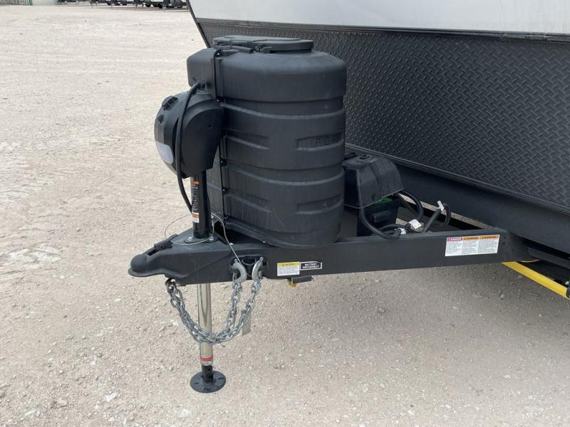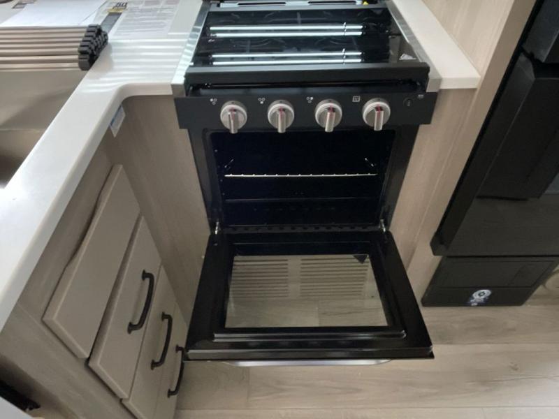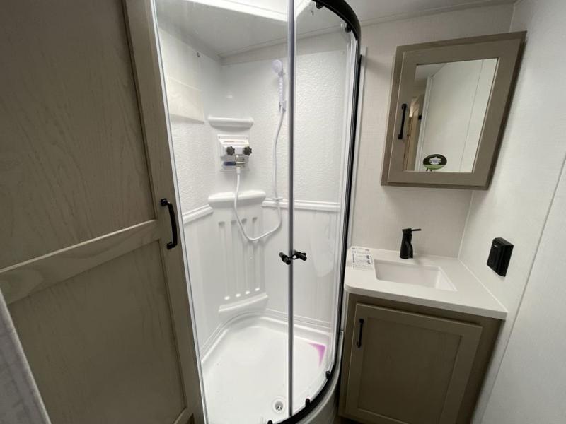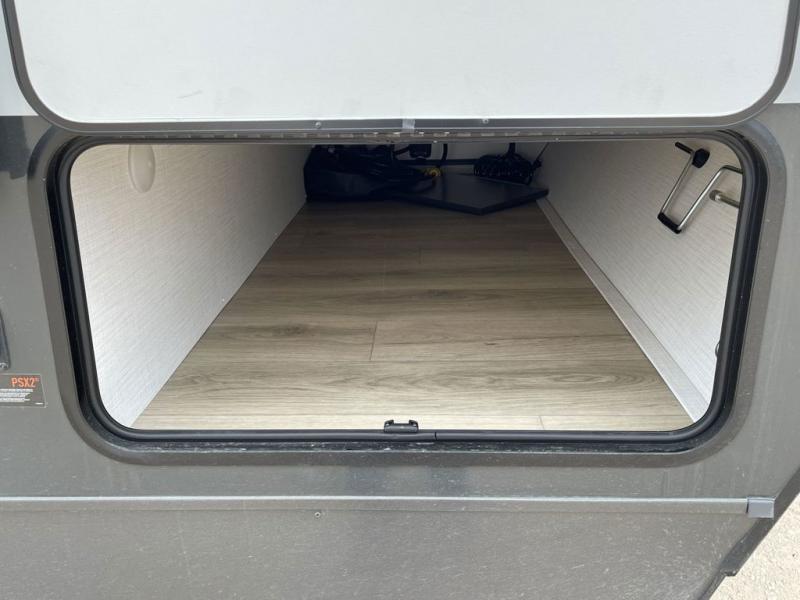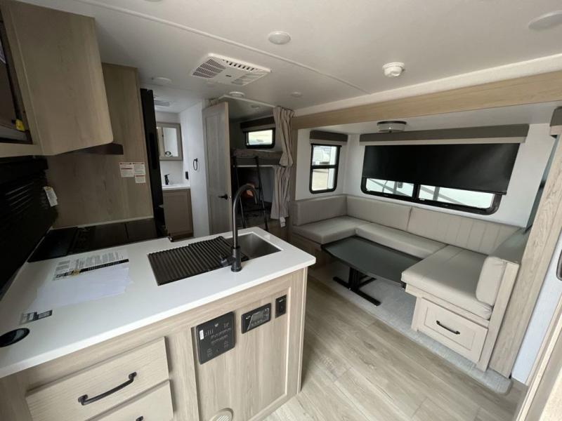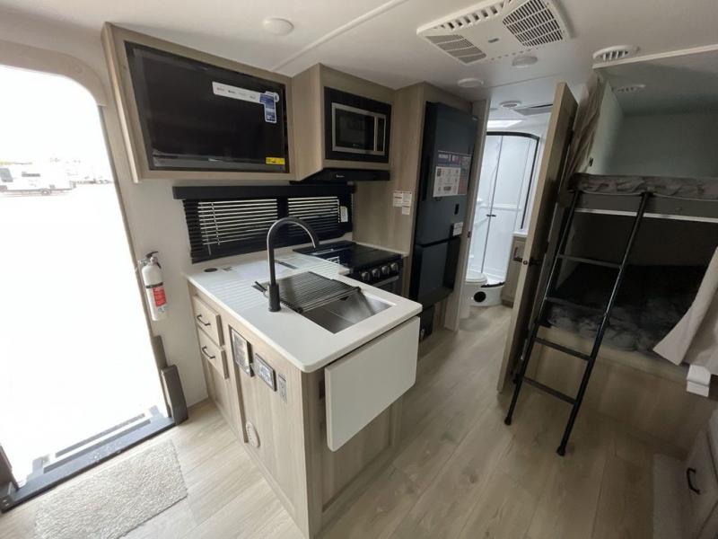 This bunkhouse model is perfect for your crew of six! You will appreciate the exterior bike door that lets you store gear under the flip-up bottom bunk, plus there is a pass-thru storage up front for even more storage. The RV queen bed in the front bedroom includes flip-up storage, two wardrobes, and a TV option if you like to stay up late with a movie. In the morning, everyone can meet in the combined kitchen and living area to dine around the U-shaped dinette, or you can take your plate outdoors to sit under the 18' power awning with LED lights. This model also includes an exterior griddle for a pancake breakfast!