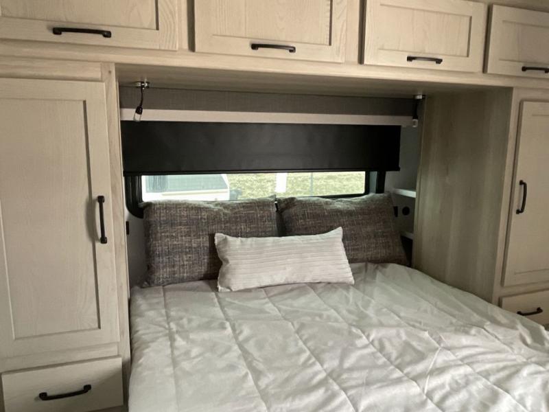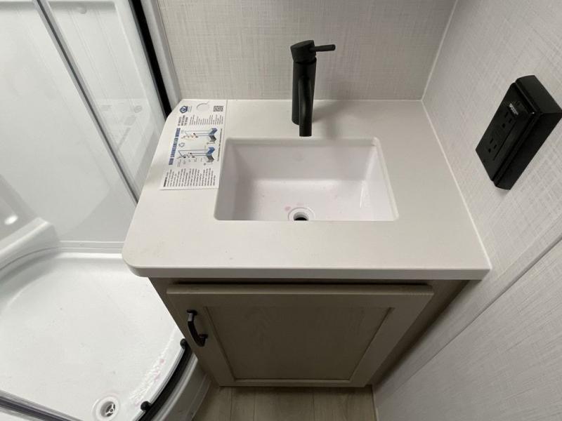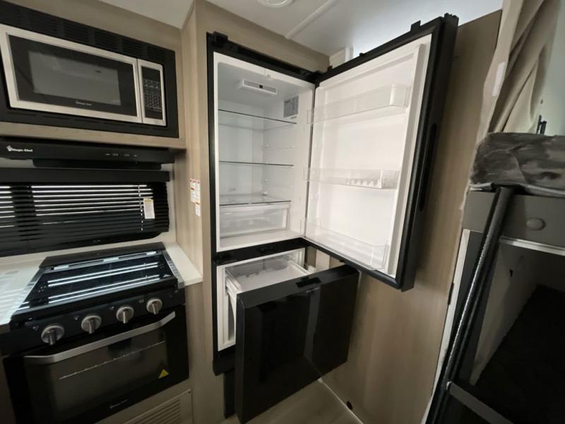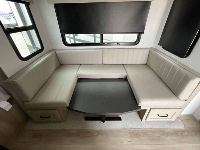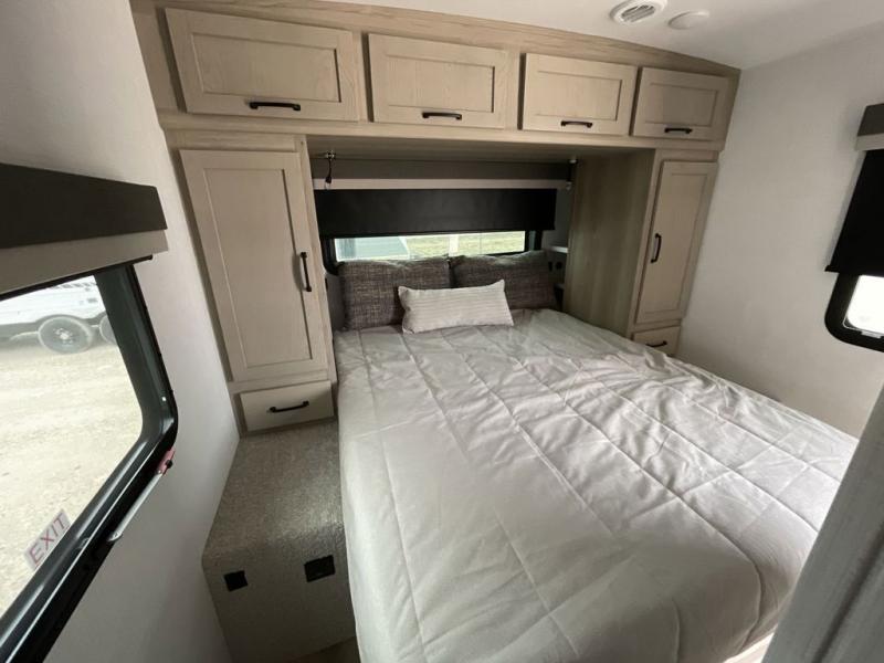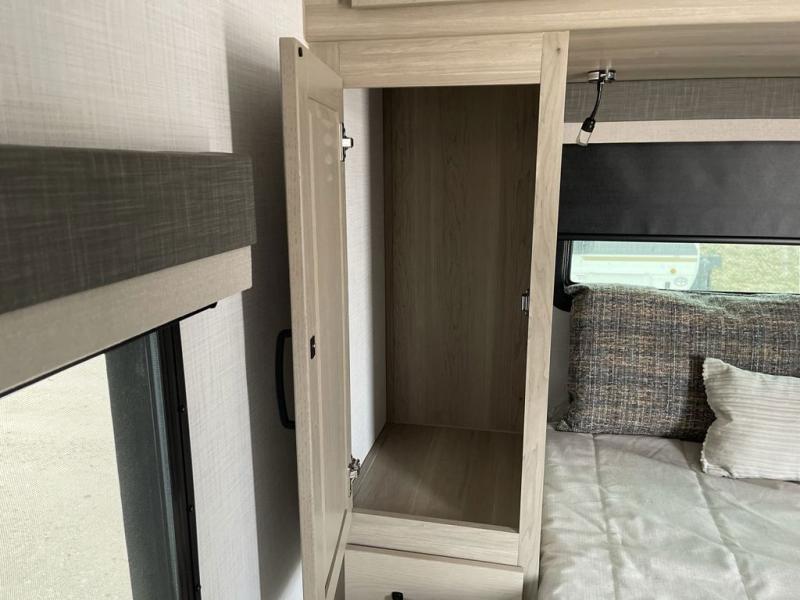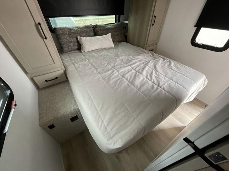 This bunkhouse model is perfect for your crew of six! You will appreciate the exterior bike door that lets you store gear under the flip-up bottom bunk, plus there is a pass-thru storage up front for even more storage. The RV queen bed in the front bedroom includes flip-up storage, two wardrobes, and a TV option if you like to stay up late with a movie. In the morning, everyone can meet in the combined kitchen and living area to dine around the U-shaped dinette, or you can take your plate outdoors to sit under the 18' power awning with LED lights. This model also includes an exterior griddle for a pancake breakfast!