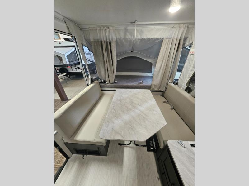 With any Rockwood OTG (Off The Ground) folding pop-up camper by Forest River, you will enjoy a more simple approach to outdoor fun. If you're a regular tent camper, but are looking for a little more comfort, then take a look at these easy-to-tow models! There are electric brakes, balancing bead filled tires, and leaf spring axles that provide that easy towing, and the alloy fiberglass exterior is durable. A one-piece screen door also comes standard so you can let fresh air in, while keeping bugs out, and the LED interior lights will be an added benefit you didn't have while tent camping. Each model also includes residential style cabinet doors, wood look flooring, and an Andover Sable wood interior for a more outdoorsy feel!