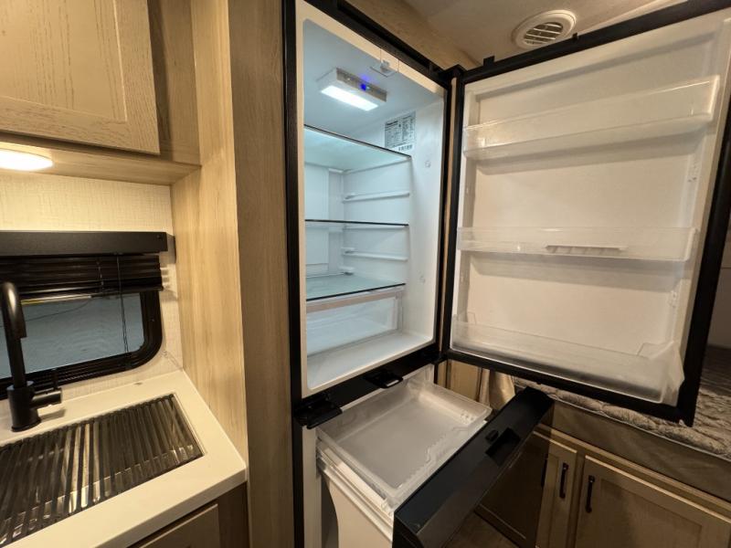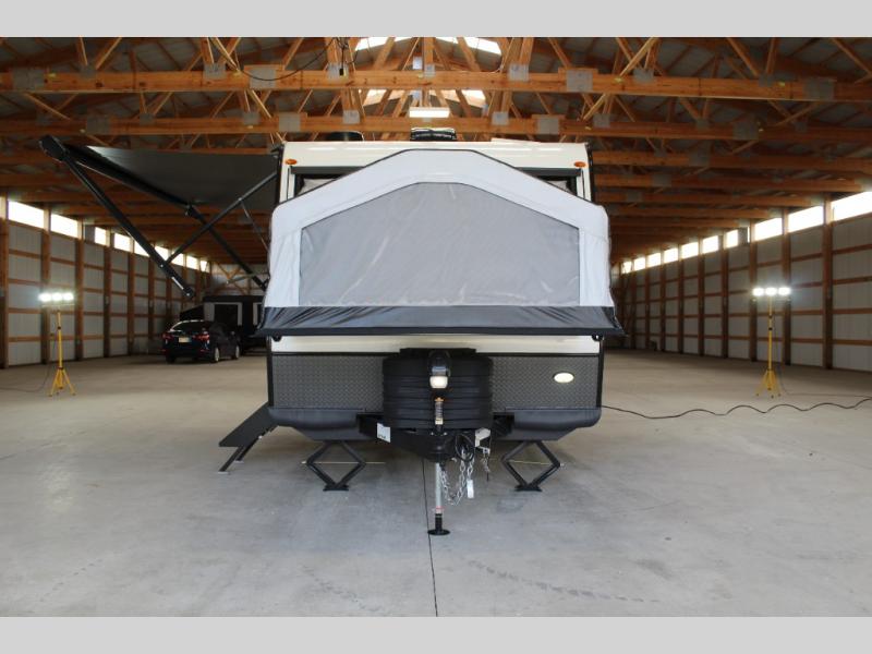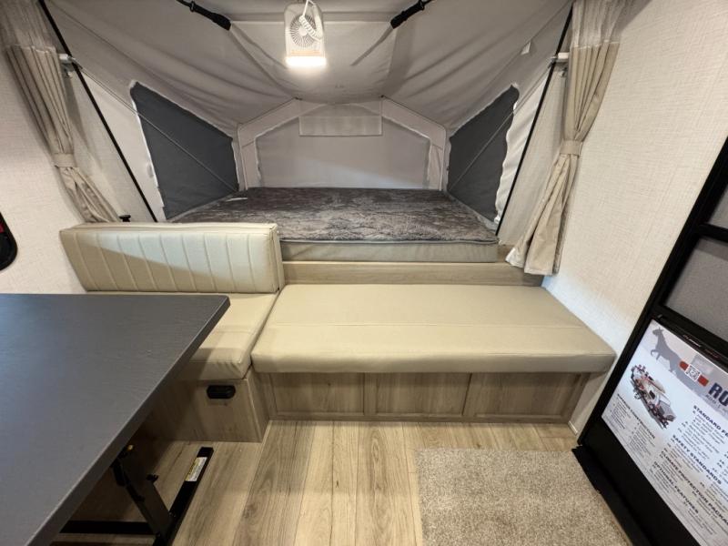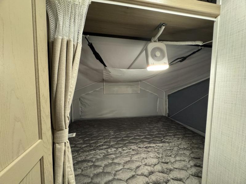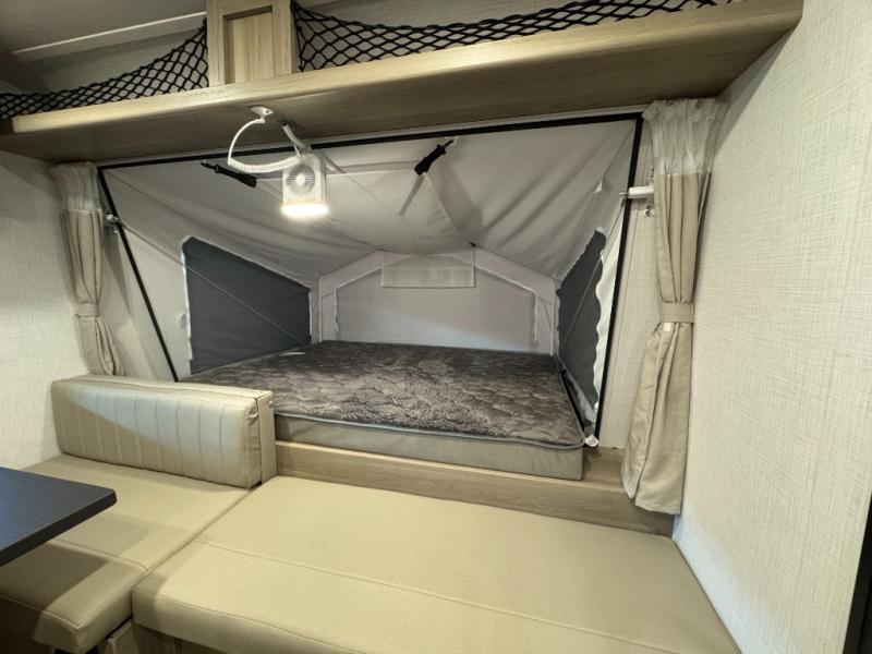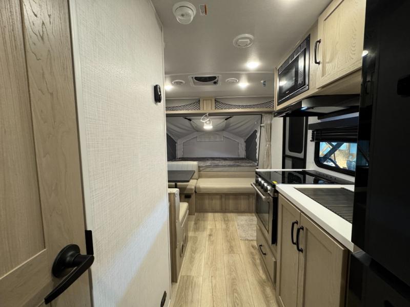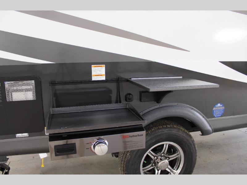This expandable travel trailer is perfect for camping trips to your favorite park. You will find two queen tent end beds for cozy sleeping space plus a 39" booth dinette that will double as dining and additional sleeping space. There is also an entryway bench so you can easily pull your boots on for hiking. The three burner gas cooktop and microwave oven will let you make meals each day, and the 12V refrigerator will keep your food fresh. There is even a pantry/wardrobe that can store dry goods and clothes. Head outside to find Solid Step entry steps, an exterior griddle, a 12' power awning with LED lights and exterior storage!