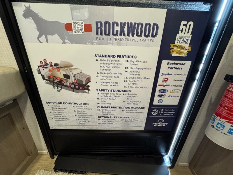 With any Rockwood Roo expandable travel trailer by Forest River you will enjoy smooth towing thanks to the torsion axle, Rubber-Ryde suspension, the easy lube axles and Nev-R-Adjust brakes. The key-Alike locks provide easy access in and out of your trailer, and each model includes prep for a Air 360+Omnidirectional antenna with WiFi for all your connection needs. Each model is constructed with a vacuum laminated one-piece roof and walls, an enclosed underbelly, and tinted framed windows for a more sleek look. You will enjoy many interior comforts, including hardwood cabinet doors and drawer fronts, night roller shades, a bunk/fan light combo with each bed, and much more!