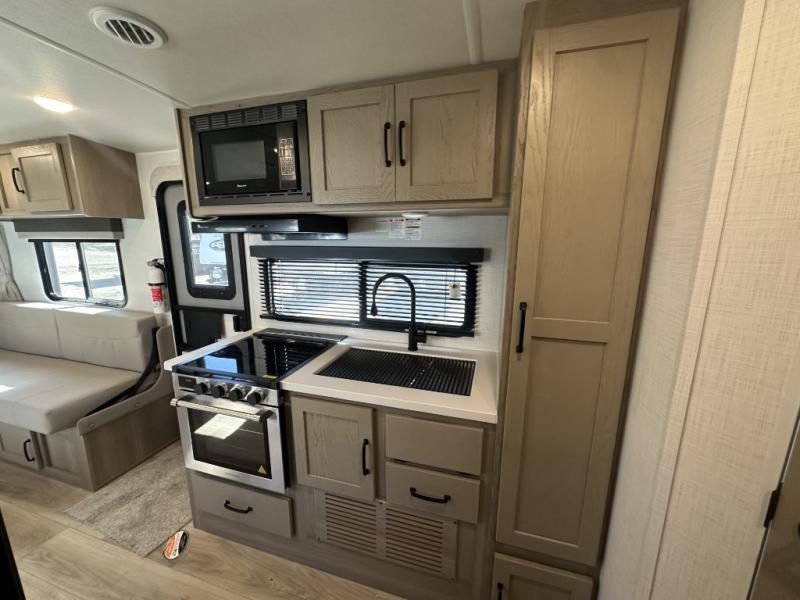 Your family will love this spacious travel trailer that can sleep up to nine people each night. There are triple queen tent end beds, a U-shaped dinette, plus a flip-up sofa for comfortable sleeping space. The chef of the group will have a 12V refrigerator and a pantry to store all the food, plus there is an exterior griddle for breakfast outside. This model also includes convenient exterior storage for fishing poles, tackle boxes, and your luggage!