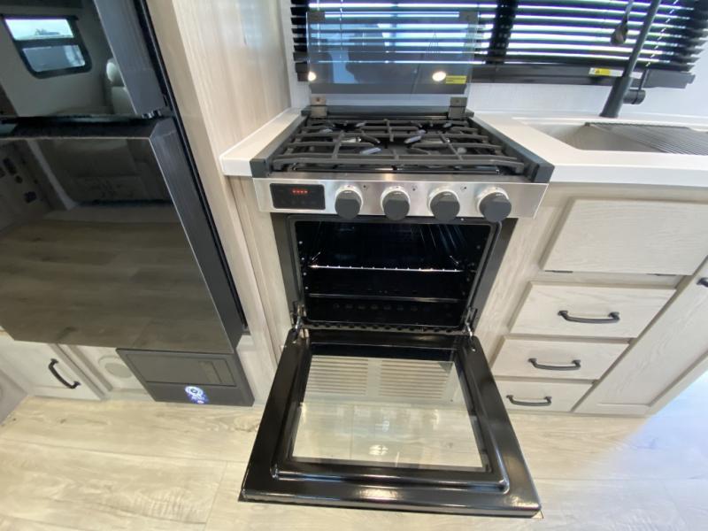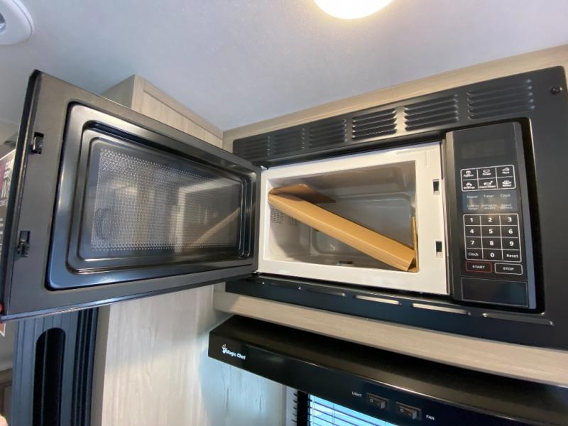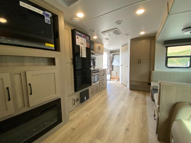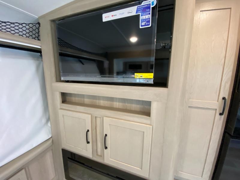 This expandable includes a large slide out that will make you feel right at home, so come take a look! The LED TV and fireplace is right across from the hide-a-bed sofa for easy viewing, and there is a booth dinette to dine together. The chef of the family can cook indoors on the three burner cooktop, or outdoors on the exterior griddle. Tuck your belongings in the overhead shelves, and snacks can go in the pantry. Don't forget about the exterior storage for your larger camp gear!