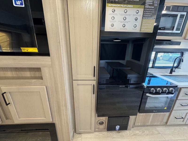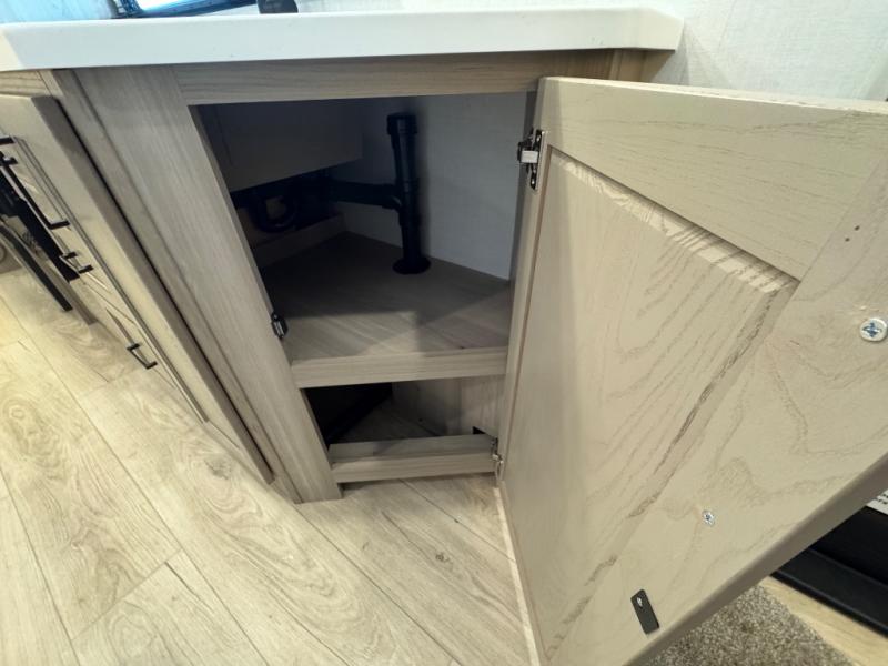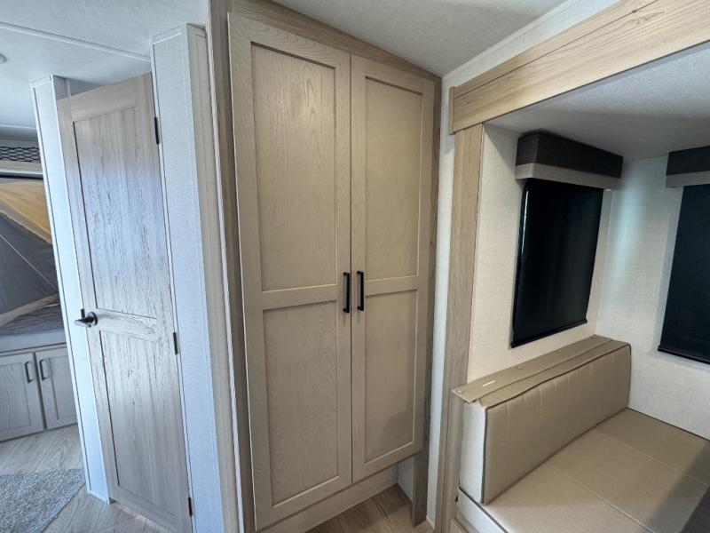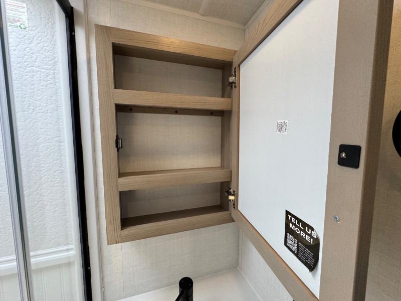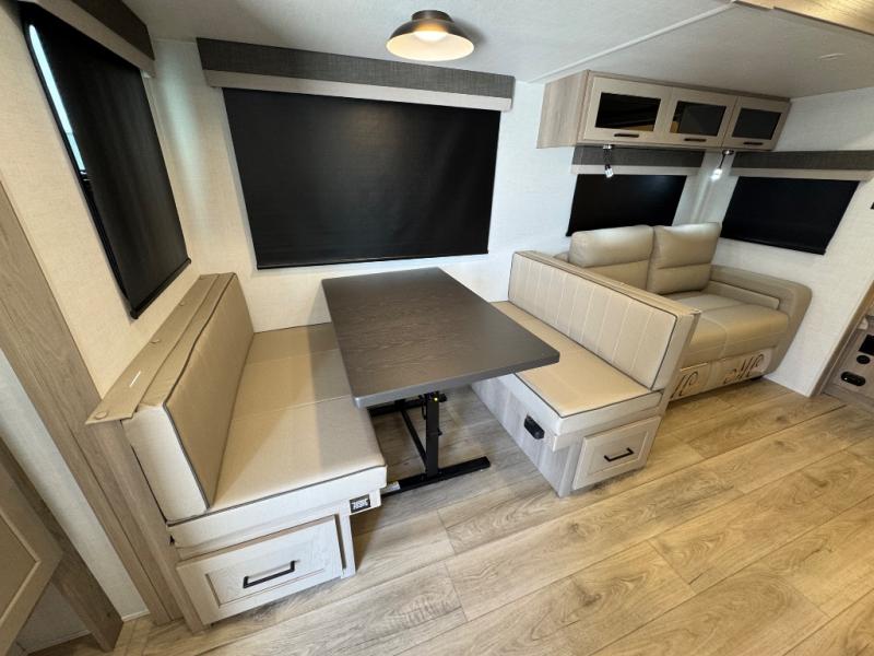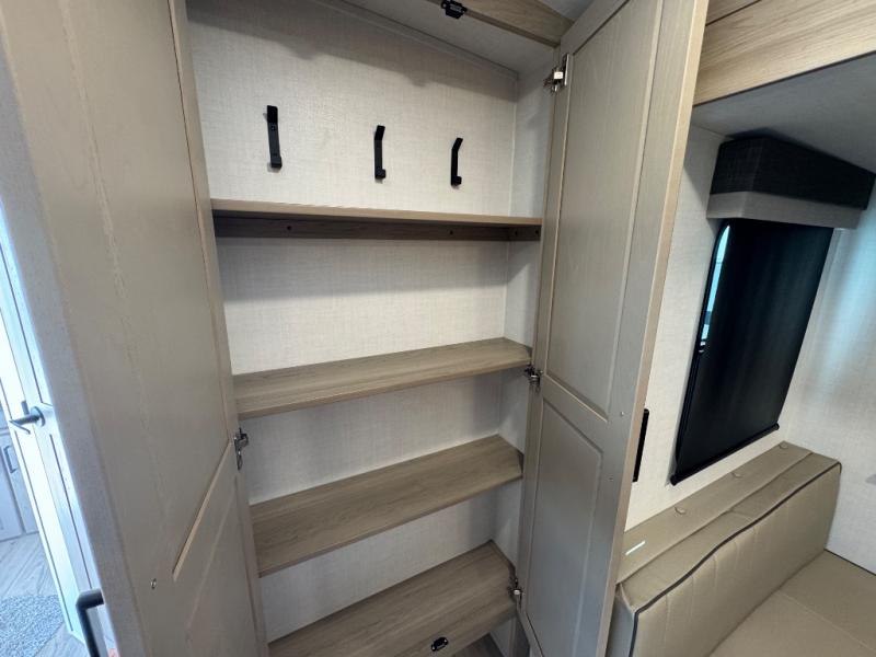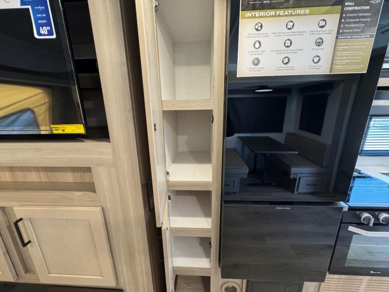 This expandable includes a large slide out that will make you feel right at home, so come take a look! The LED TV and fireplace is right across from the hide-a-bed sofa for easy viewing, and there is a booth dinette to dine together. The chef of the family can cook indoors on the three burner cooktop, or outdoors on the exterior griddle. Tuck your belongings in the overhead shelves, and snacks can go in the pantry. Don't forget about the exterior storage for your larger camp gear!