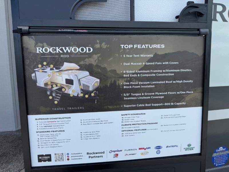 With any Rockwood Roo expandable travel trailer by Forest River you will enjoy smooth towing thanks to the torsion axle, Rubber-Ryde suspension, the easy lube axles and Nev-R-Adjust brakes. The key-Alike locks provide easy access in and out of your trailer, and each model includes prep for a Air 360+Omnidirectional antenna with WiFi for all your connection needs. Each model is constructed with a vacuum laminated one-piece roof and walls, an enclosed underbelly, and tinted framed windows for a more sleek look. You will enjoy many interior comforts, including hardwood cabinet doors and drawer fronts, night roller shades, a bunk/fan light combo with each bed, and much more!