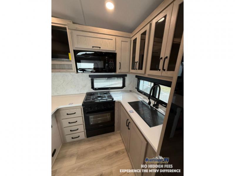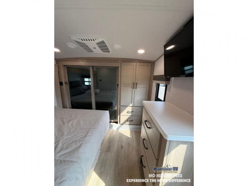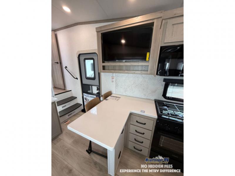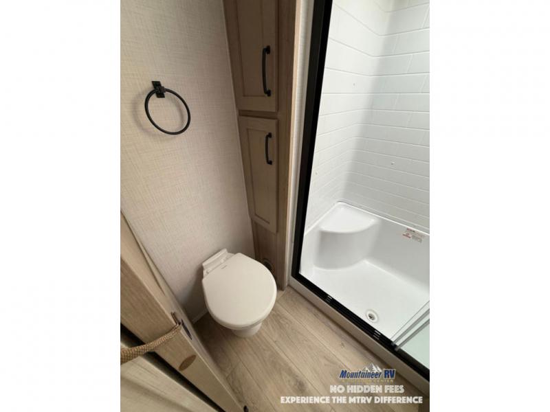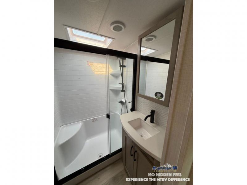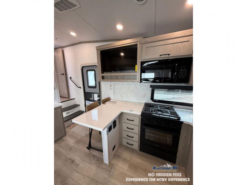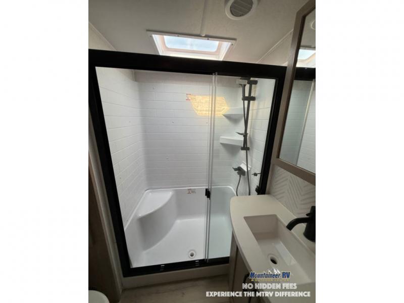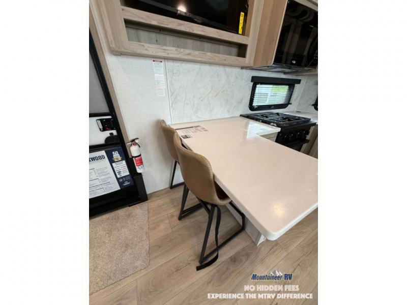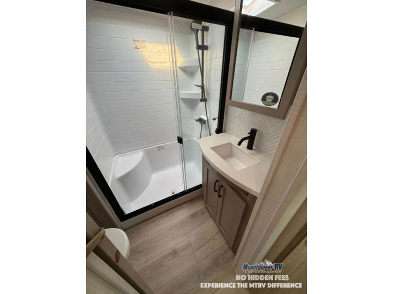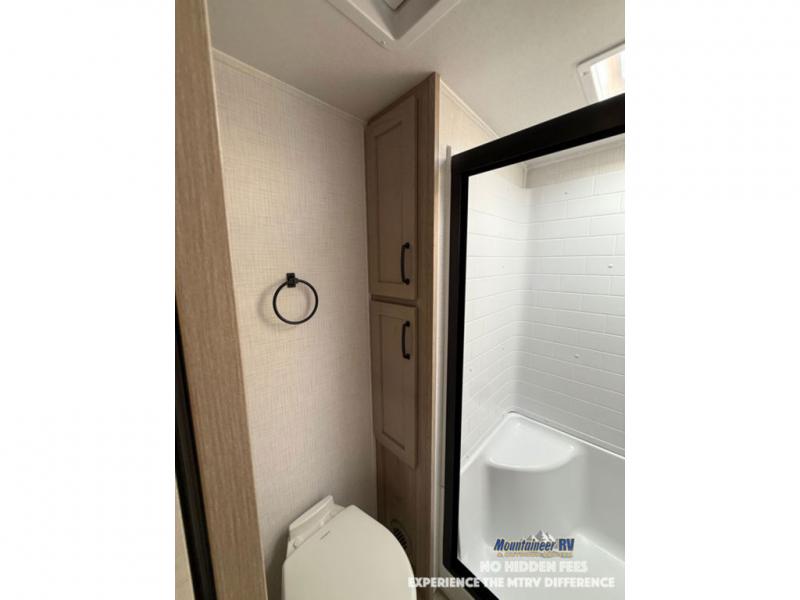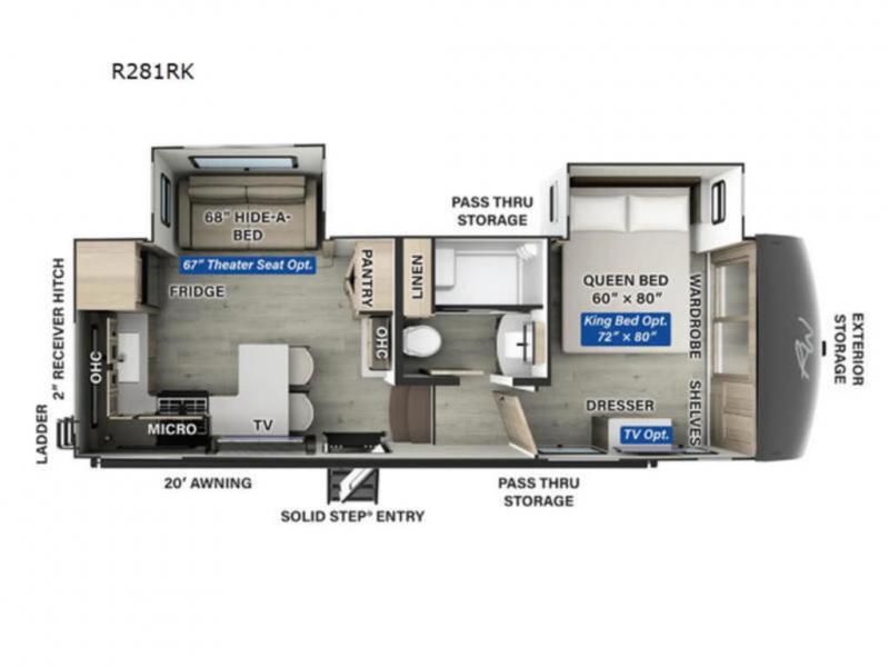 Looking for a spacious bedroom and bathroom for the perfect couple's RV with extra sleeping space for guests? This model provides a queen bed slide out for more interior floor space to get to the front wardrobe with shelves, and the dresser with a window above for great views of your campsite. The bathroom offers a shower with a seat, linen storage, and counter space for your toiletries. The main living and kitchen combined area has a hide-a-bed sofa slide that allows two guests to stay the night or you can choose the optional theater seat. There is also a breakfast bar with stools to dine at, and a U-shaped counter including appliances to make meals and store leftovers. And you will find exterior storage to bring along camping chairs and extra gear.